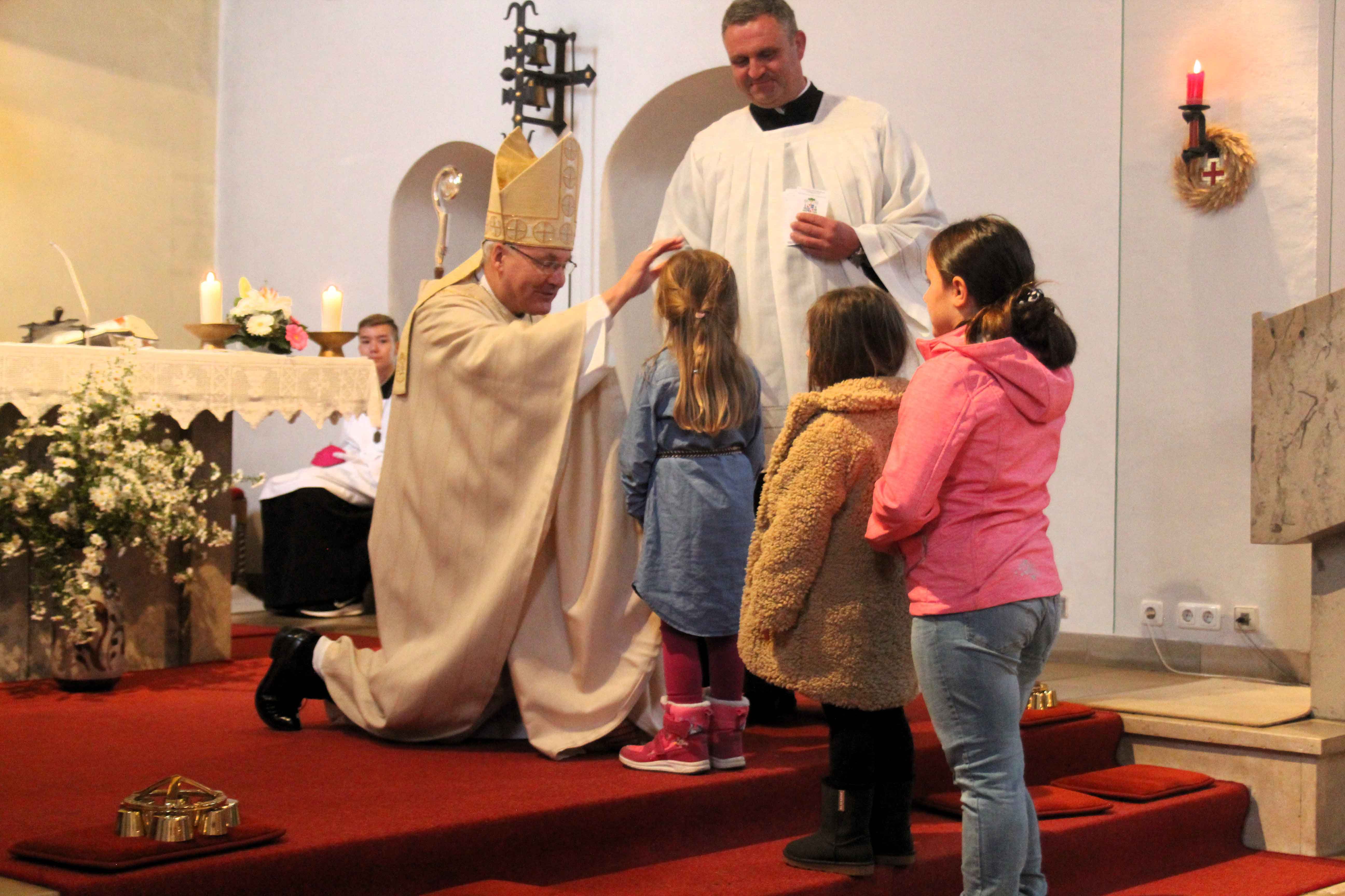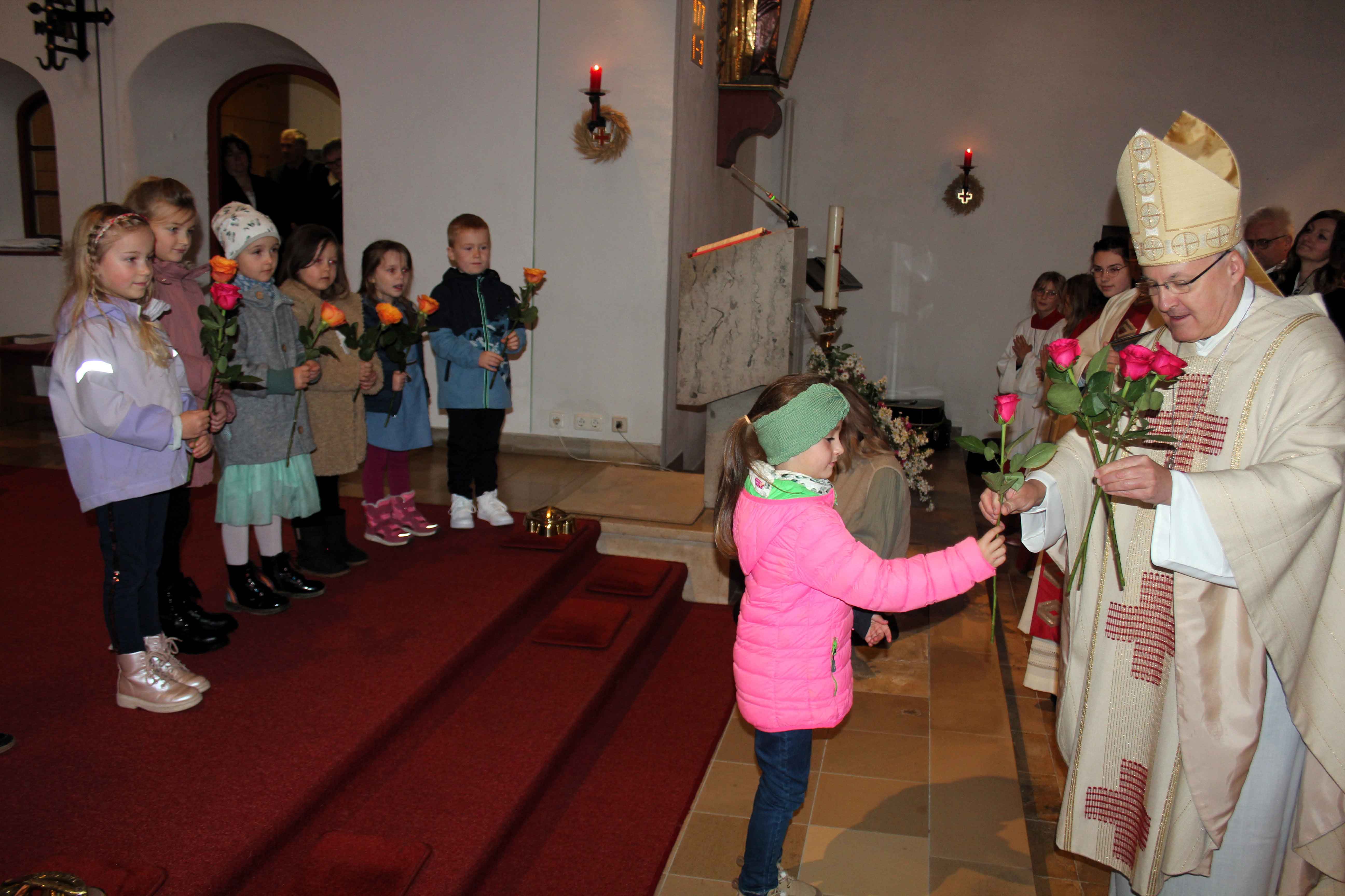 Bischof Rudolf Voderholzer stattete der Pfarrei Herz Jesu in Immenreuth (Landkreis Tirschenreuth) am vergangenen Sonntag seinen ersten Pastoralbesuch ab. „Damit gehe ich den Weg ins Bistum weiter“, sagte der Bischof zu Beginn der Pontifikalmesse, die er gemeinsam mit Pfarrer Markus Bruckner und Pfarrvikar Dr. Linus Chukwudi Nwankwo zelebrierte. Musikalisch und mit Rosen wurde der Bischof an den Stufen zum Altar von den Vorschulkindern des katholischen Kindergartens begrüßt.