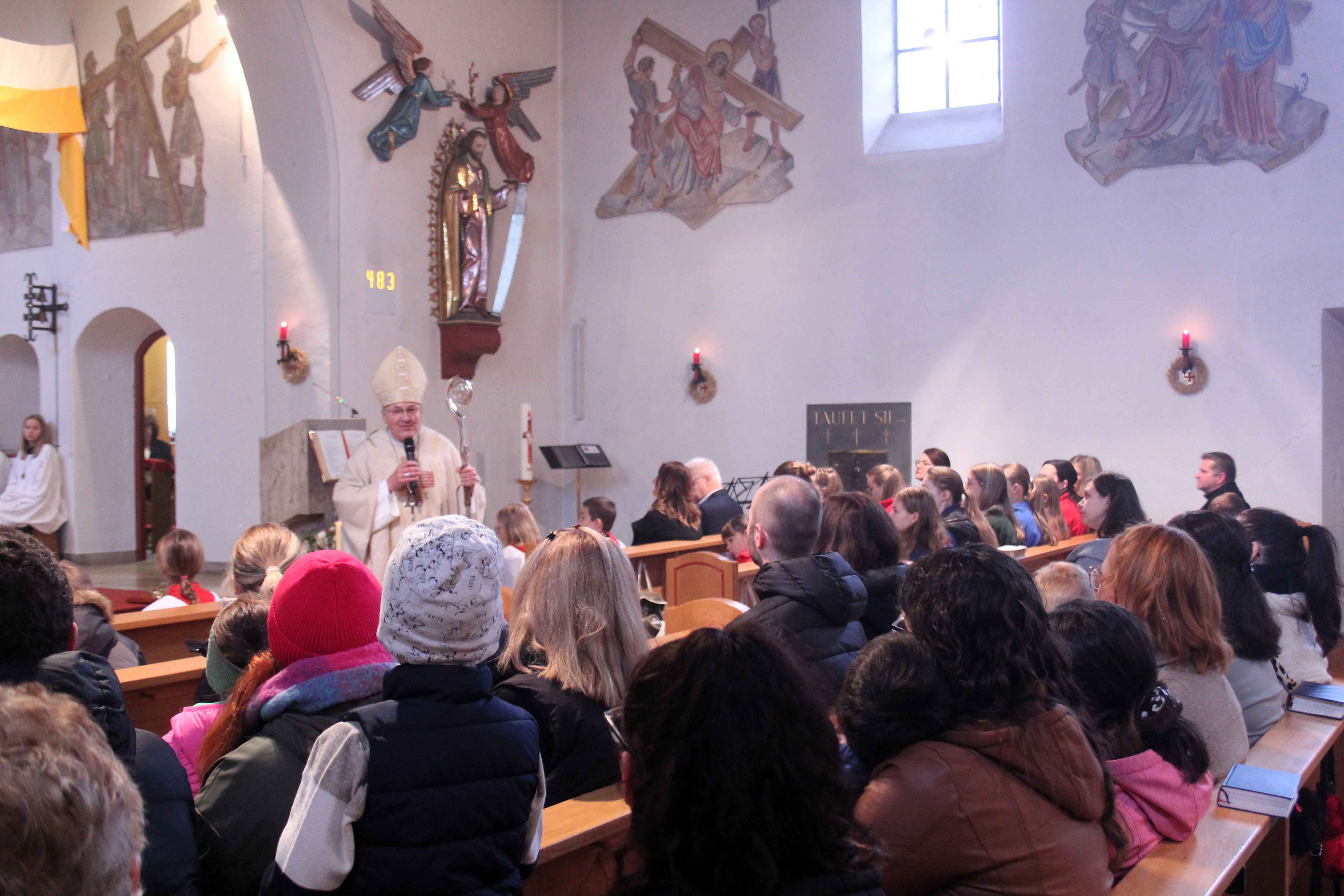 Ausgehend vom Tagesevangelium (Mk 10,46b-52) über die Heilung des blinden Bartimäus bei Jericho, stellte der Bischof die Bedeutung des Sehens und Erkennens in den Mittelpunkt seiner Predigt. „Dieses Evangelium ist uns nicht erzählt als eine kuriose Begebenheit von vor 2000 Jahren, sondern sie geht uns alle an, hier und heute, jeden und jede von uns. Vielleicht sind wir alle in irgendeiner Weise auch Bartimäus. Das Evangelium wird uns verkündet, um unseren Glauben zu stärken, unsere Liebe zu entflammen und unsere Hoffnung zu nähren.“ Von frühesten Zeiten an hätten die Christen das „Zum Glauben kommen“, das „Getauftwerden“, als Erleuchtung bezeichnet. „Wer getauft wird, dem wird ein innerliches Licht geschenkt. Wer glaubt, der sieht mehr. Wer glaubt, der erkennt, dass all das, was uns umgibt, nicht einfach nur die Umwelt ist, sondern Gottes Schöpfung. Dass die Menschen um einem herum keine lästigen Konkurrenten sind, sondern Schwestern und Brüder, Mitgeschöpfe, sind“, rief der Bischof in Erinnerung.