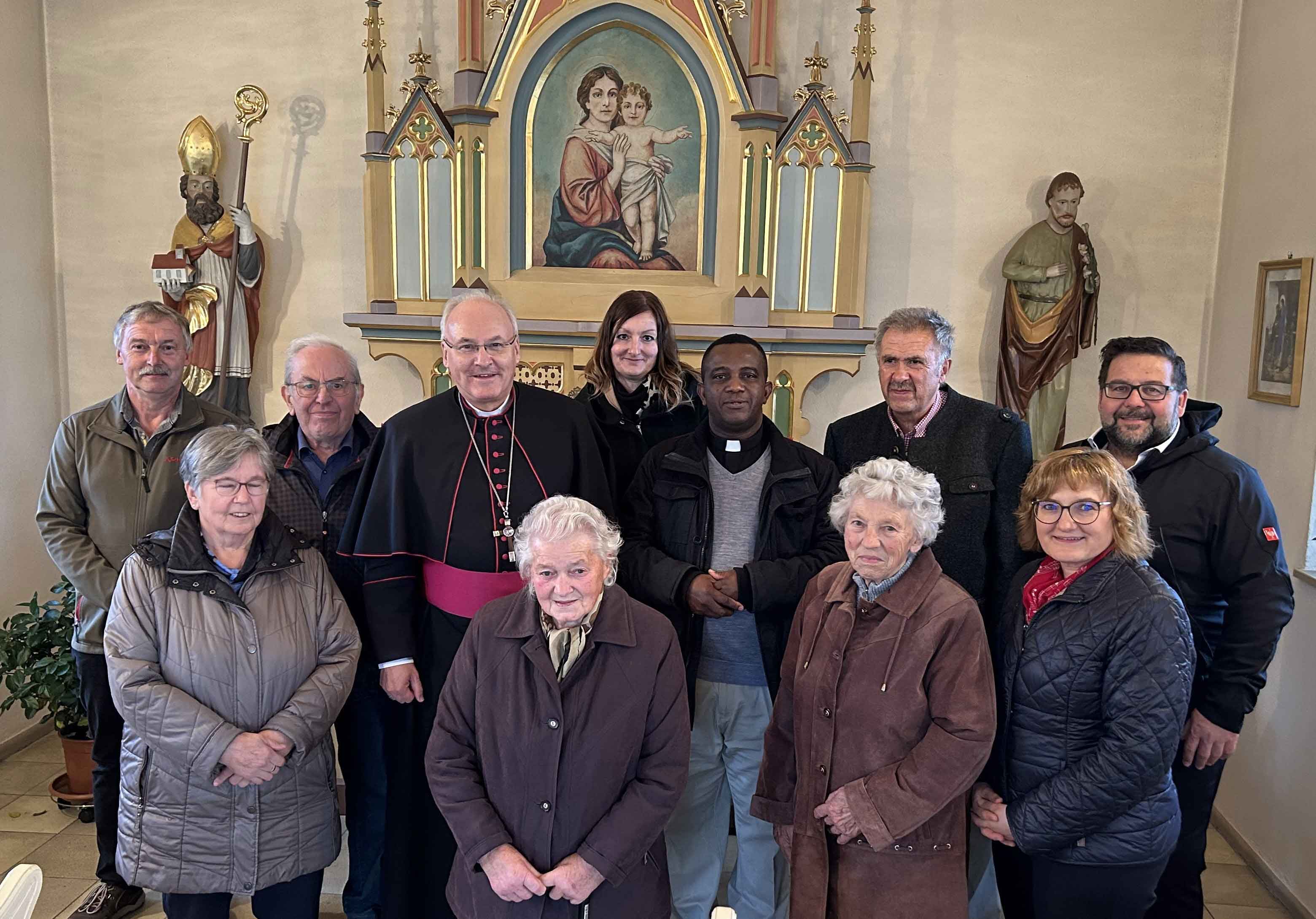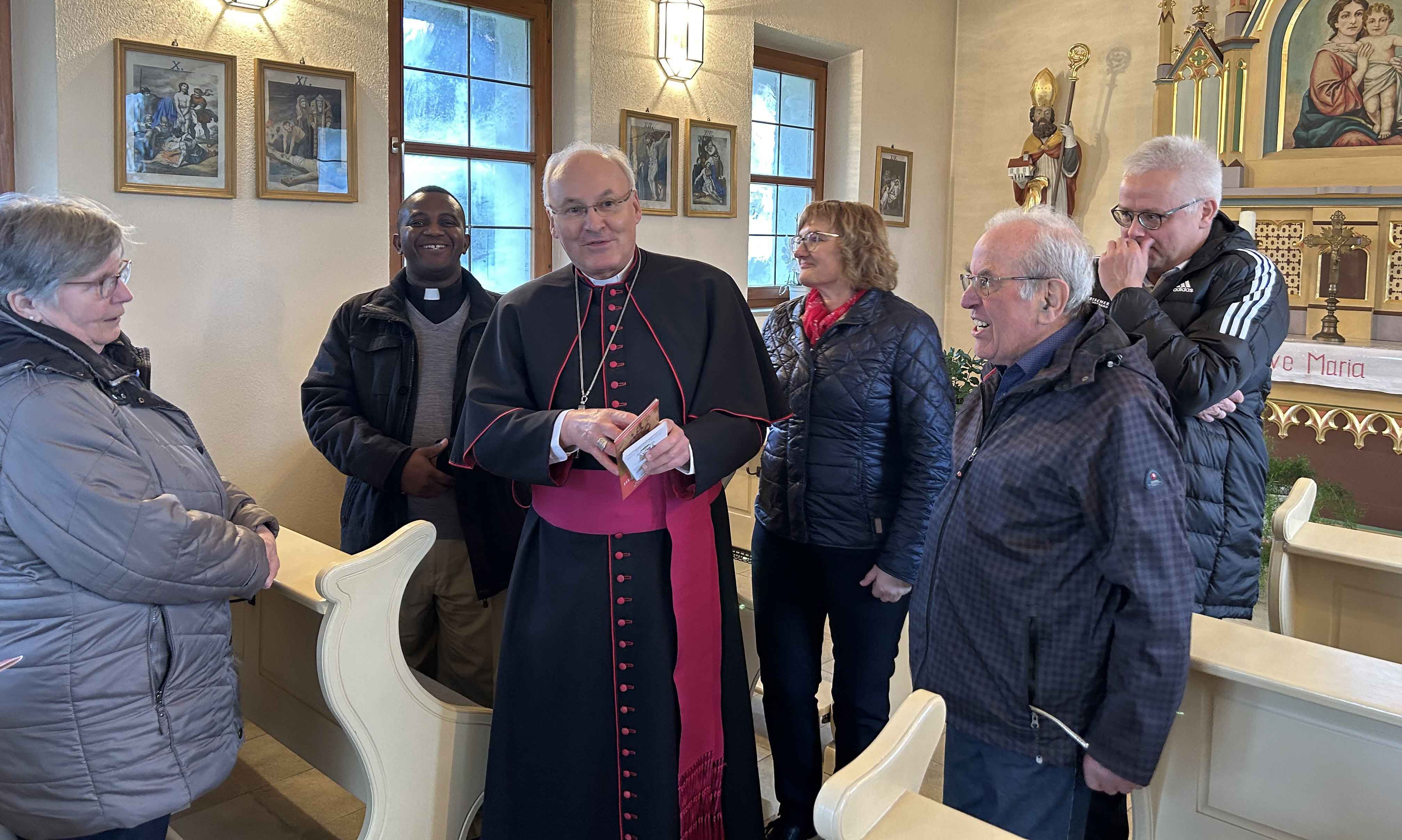 Der festliche Gottesdienst wurde musikalisch gestaltet vom Kirchenchor Immenreuth unter der Leitung von Michael Scherm sowie der Jugendsinggruppe „Bunte Töne“ unter der Leitung von Elisabeth Schupfner und Katharina Hößl. Pfarrgemeinderatssprecher Roman Melzner und dessen Stellvertreterin Maria Bock dankten dem Bischof für seinen Besuch und überreichten einen Präsentkorb mit regionalen Spezialitäten. Zum Abschluss des Gottesdienstes spendete der Bischof den Kindern den Einzelsegen. Spontan entschied sich Bischof Rudolf Voderholzer nach Gesprächen mit Gottesdienstteilnehmern auf dem Kirchplatz und einem Mittagessen im Pfarrheim zu Abstechern zu den Kapellen in den Ortsteilen Ahornberg und Döberein. Nach dem Besuch in Ahornberg, bei dem der Bischof sich auch über die geschichtliche Entwicklung der ehemaligen Gemeinde interessiert zeigte, ging es nach Döberein. Dort war gerade das Rosenkranzgebet zu Ende. Umso größer war die Freude, als der Bischof höchstpersönlich plötzlich die Kapelle betrat. Alois Schmid, Gründungsmitglied und ehemaliger Vorsitzender des Kapellenbauvereins, nutzte zusammen mit der aktuellen Vorsitzenden Erna Raps die Gelegenheit, den Bischof auch hier über die historische Entwicklung zu informieren bis zum Bau der aktuellen Kapelle.