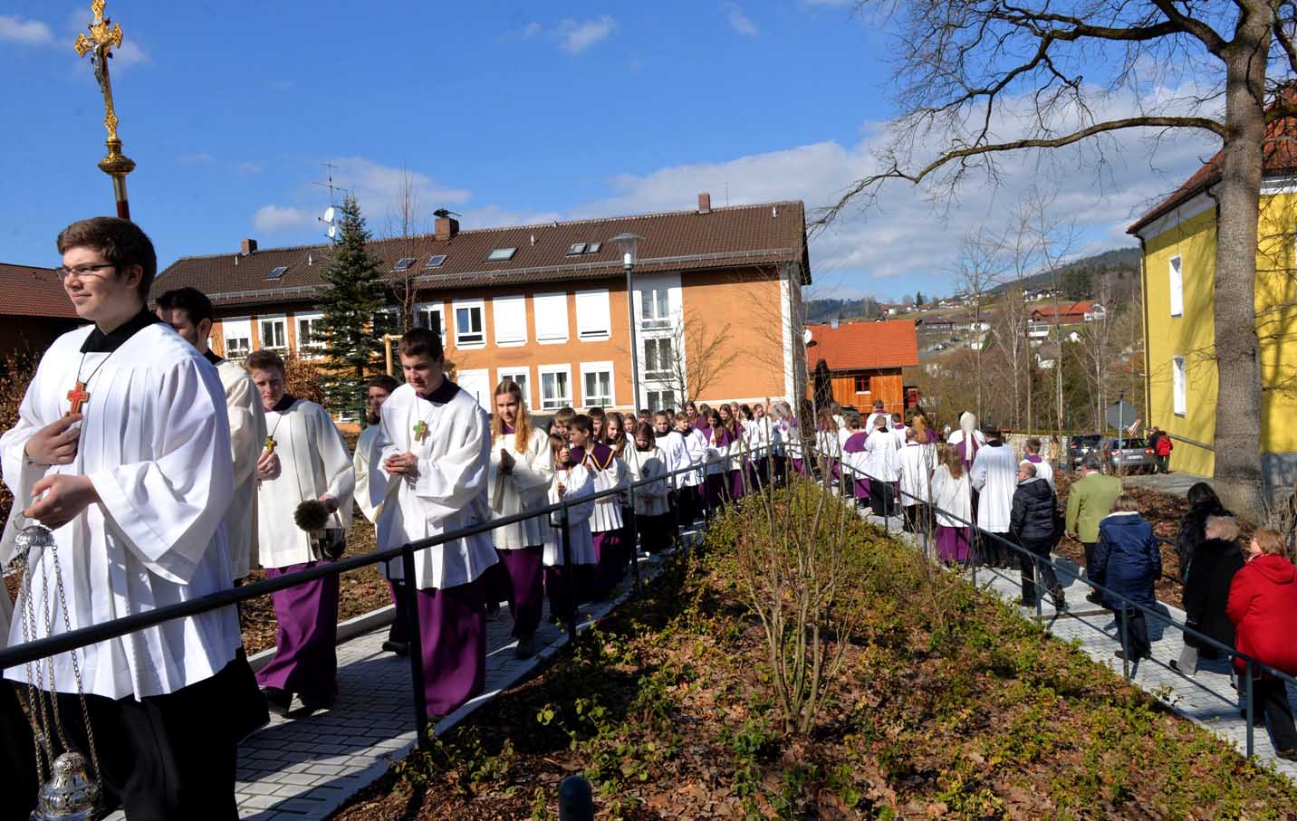 Nach dem feierlichen Pontifikalsegen ging es im gemeinsamen Zug über den Hildegard-von-Bingen-Platz zur Segnung des Kreuzweges im Bürgerpark. Bischof Rudolf freute sich, dass in der "Herzmitte des Ortes Teisnach" ein Kreuzweg in sehr schöner und gelungener Umsetzung integriert wurde. Er wünschte, dass dieser Kreuzweg angenommen wird, dass es ein Treffpunkt zum Meditieren, zum Betrachten, zum Nachdenken, zum sich Identifizieren wird. Wunderbar sei, dass auch eine fünfzehnte Station eingearbeitet sei, die Auferstehung und dies soll überall bezeugt werden.