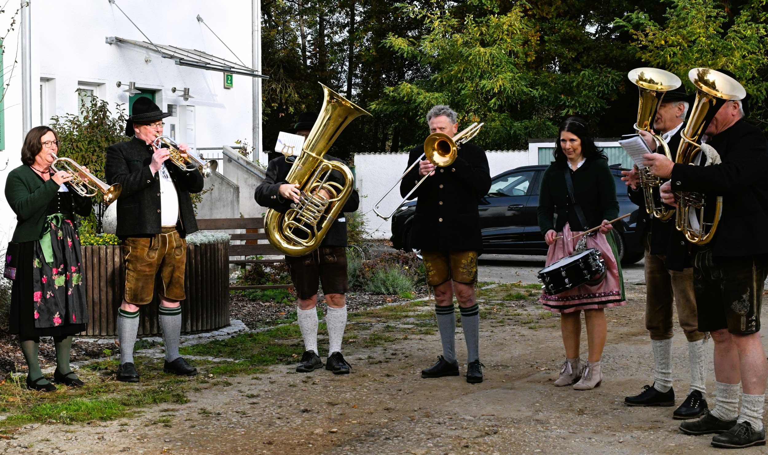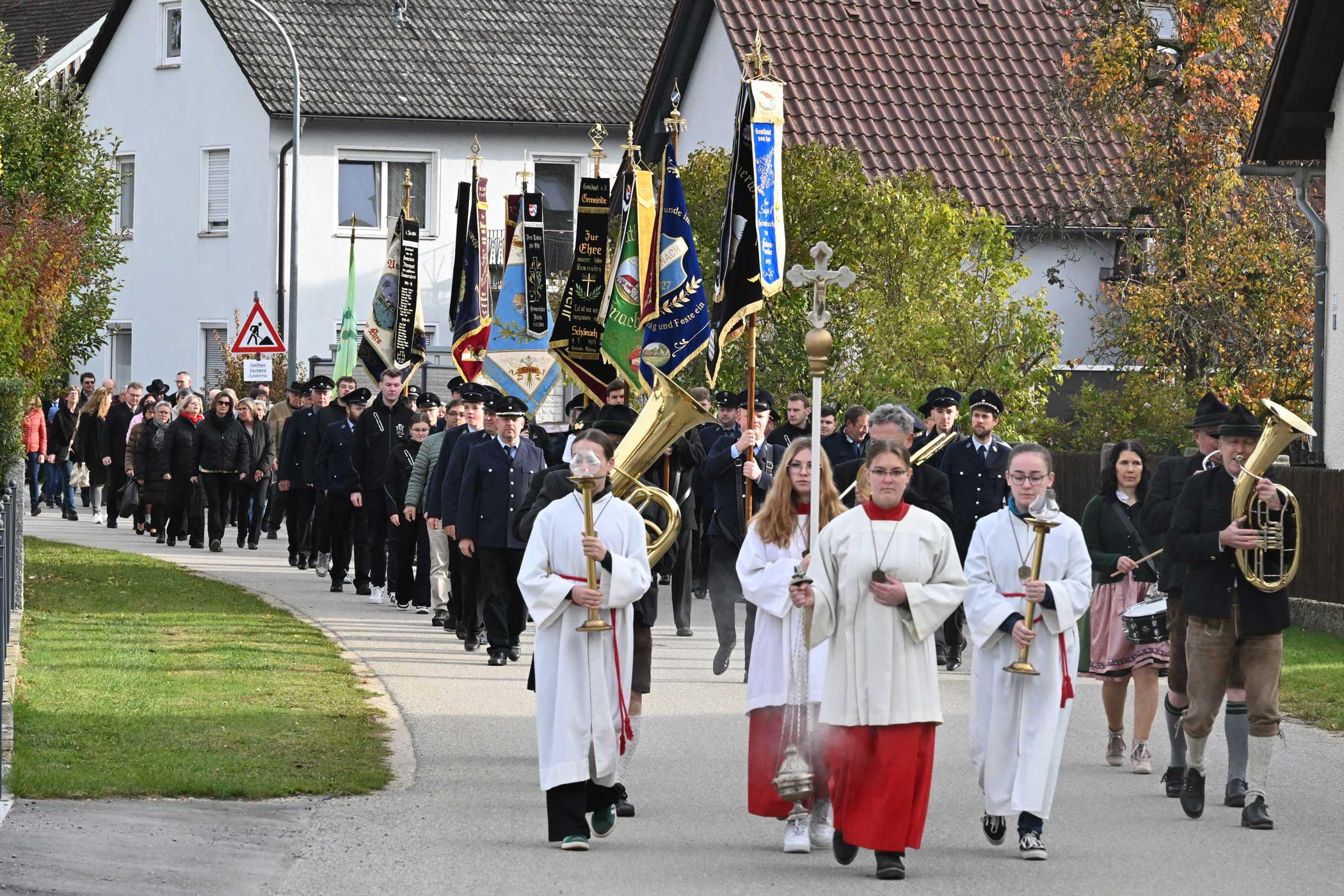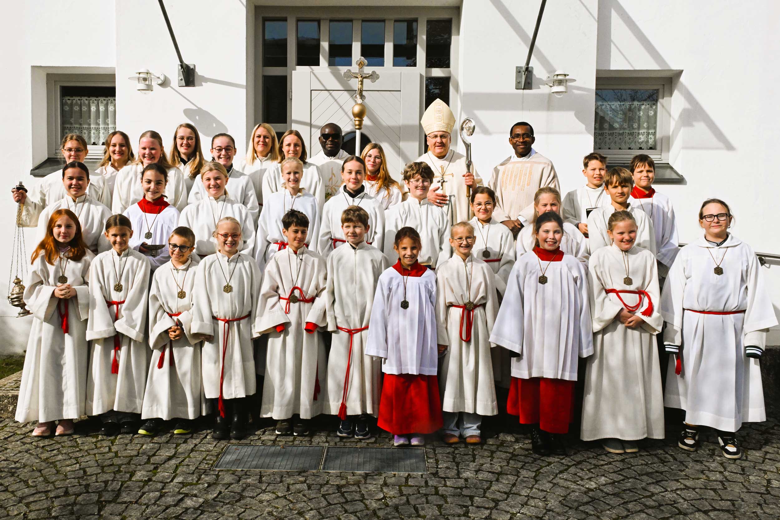 Freundliche Begrüßungsworte fanden Pfarrer P. Dr. Alexander Abasili SMMM und Pfarrvikar P. Kessington Anyanwu SMMM. Herzlich begrüßt wurde der Regensburger Oberhirte bei der Ankunft von Marlene Mühlbauer und Valentina Schütz mit einem Blumenstrauß. Und die „Pfatterer Buam“ mit Mädchengruppe spielten zünftig auf. Versammelt hatten sich die vielen Ortsvereine, um dann gemeinsam mit ihren Fahnen unter den Klängen der Blasmusik zur Pfarrkirche in Schönach zu ziehen. Allein 26 Ministranten und Ministrantinnen folgten dem Vortragekreuz.
