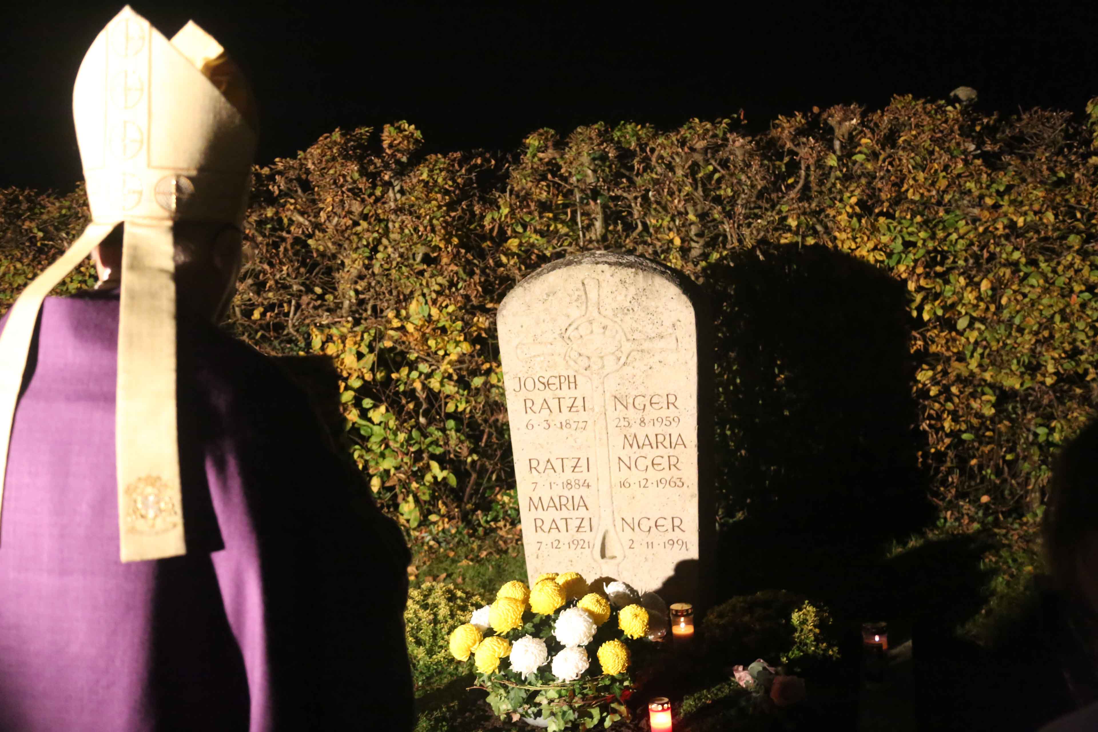 Nach dem Pontifikalamt begab sich Bischof Rudolf mit dem Liturgischen Dienst und einigen Gläubigen auf den benachbarten Friedhof zur letzten Ruhestätte der Familie Ratzinger. Die Schwester der Ratzinger-Brüder, Maria Ratzinger (1921-1991), war zum Allerseelentag 1991 wie immer bereits einige Tage zuvor von Rom nach Regensburg gekommen, um noch einige Besorgungen zu machen und verstarb dort am 2. November. Joseph Kardinal Ratzinger schrieb damals in seinem Kondolenz-Dankschreiben: "... ihre Seele aber wissen wir in Gottes gütigen Händen geborgen, der ihr all das vergelten wird, was sie so still und unauffällig Tag um Tag ohne Schonung ihrer Kräfte getan hat". Im Familiengrab auf dem Ziegetsdorfer Friedhof wurde sie dann neben ihren Eltern Joseph Ratzinger (1877-1959) und Maria Ratzinger geb. Peintner (1884-1963) beigesetzt, die die drei Geschwister 1974 von Traunstein hatten umbetten lassen. Ihr Bruder, der Apostolische Protonotar und Domkapellmeister, Georg Ratzinger (1924-2020) fand seine letzte Ruhestätte in der Stiftungsgruft der Domspatzen auf dem „Unteren Katholischen Friedhof“ neben seinem Vorgänger Theobald Schrems (1893-1963). Ihr Bruder Papst emeritus Benedikt XVI., geb. Joseph Aloys Ratzinger (1927-2022), wurde in den vatikanischen Grotten von St. Peter in Rom im ehemaligen Grab seines Vorgängers, Papst Johannes Paul II. (1920-2005), beigesetzt.