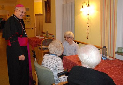 Nach dem feierlichen Gottesdienst führte Monsignore Dr. Paul Mai zusammen mit dem stellvertretenden Vorstandsvorsitzenden des Alten- und Pflegeheims Deutschordenshaus St. Josef, Dr. Karlheinz Götz, durch die Räumlichkeiten des Altenheims. Dabei hatte der Bischof die Gelegenheit, die dort lebenden Senioren zu besuchen. Diese zeigten sich sehr erfreut über den unerwarteten Besuch des Regensburger Oberhirten . Bischof Rudolf nahm sich viel Zeit für einen Plausch mit den Heimbewohnern aber auch für Gespräche mit den Ordensschwestern, die im Alten-und Pflegeheim tätig sind. Sehr interessiert zeigte sich Bischof Rudolf an dem Wirken der polnischen Schwesterngemeinschaft des Altenheims und informierte sich bei den Ordensschwestern über deren Ordensgründer, den Seligen Edmund von Bojanowski. Die Schwestern der „ Schwesterngemeinschaft der Dienerinnen der unbefleckten Gottesmutter Jungfrau Maria“ leben und arbeiten seit drei Jahren im Deutschordenshaus und verrichten ihren Dienst in der Pflege, in der sozialen Betreuung sowie in der Seelsorge.