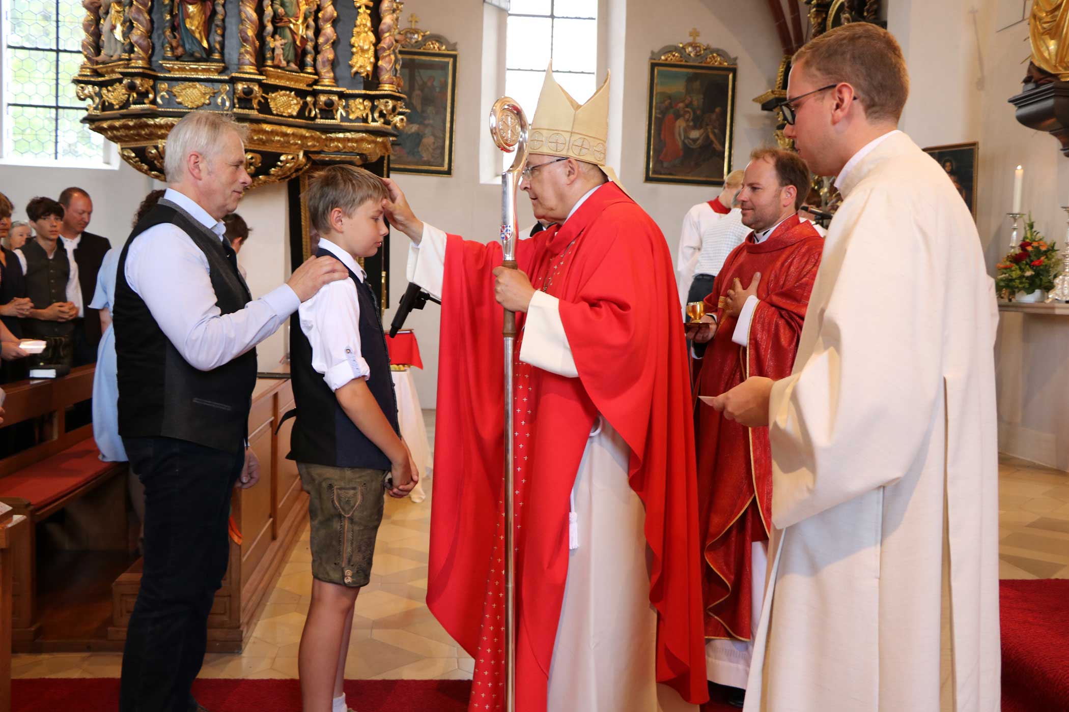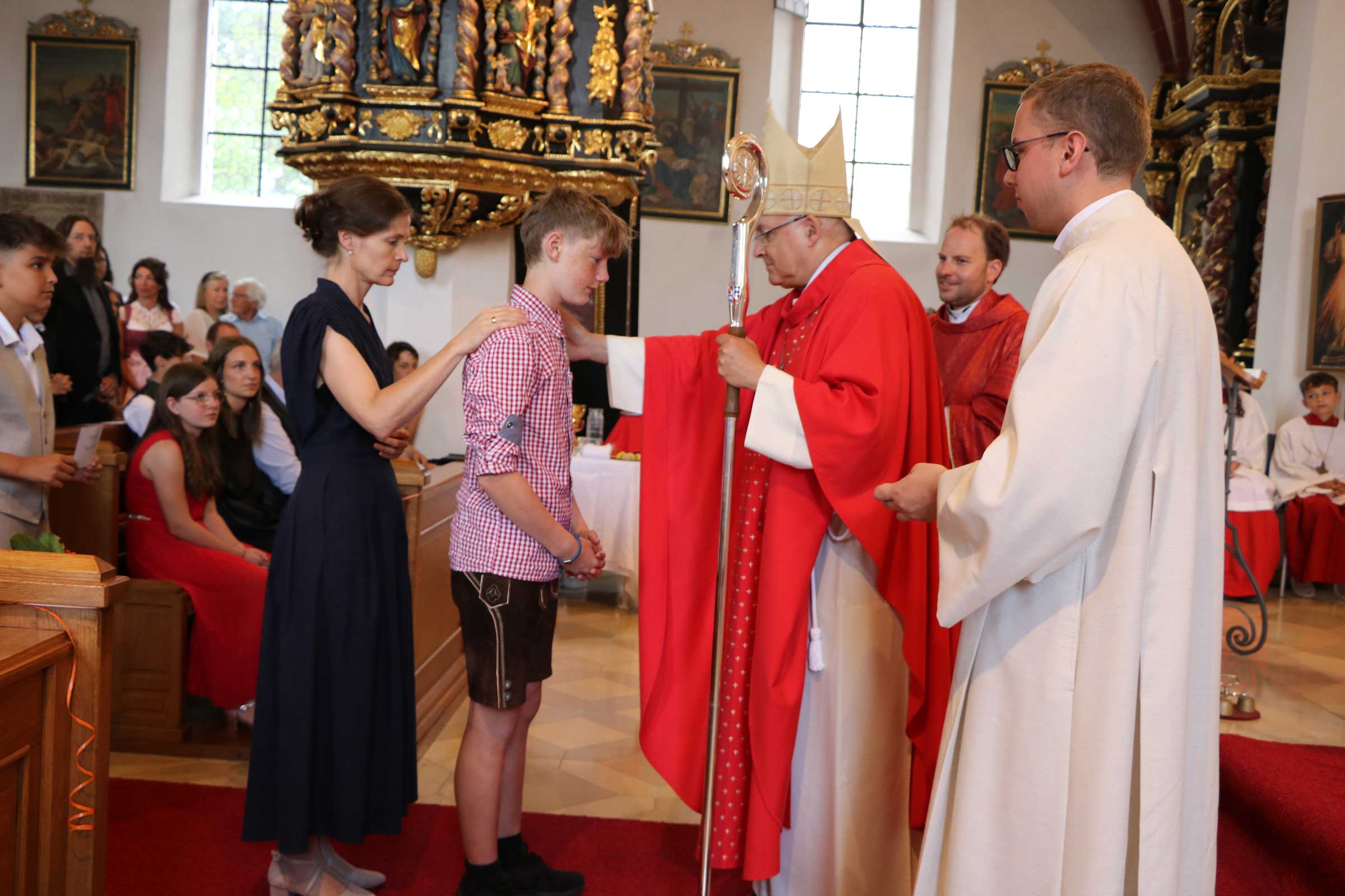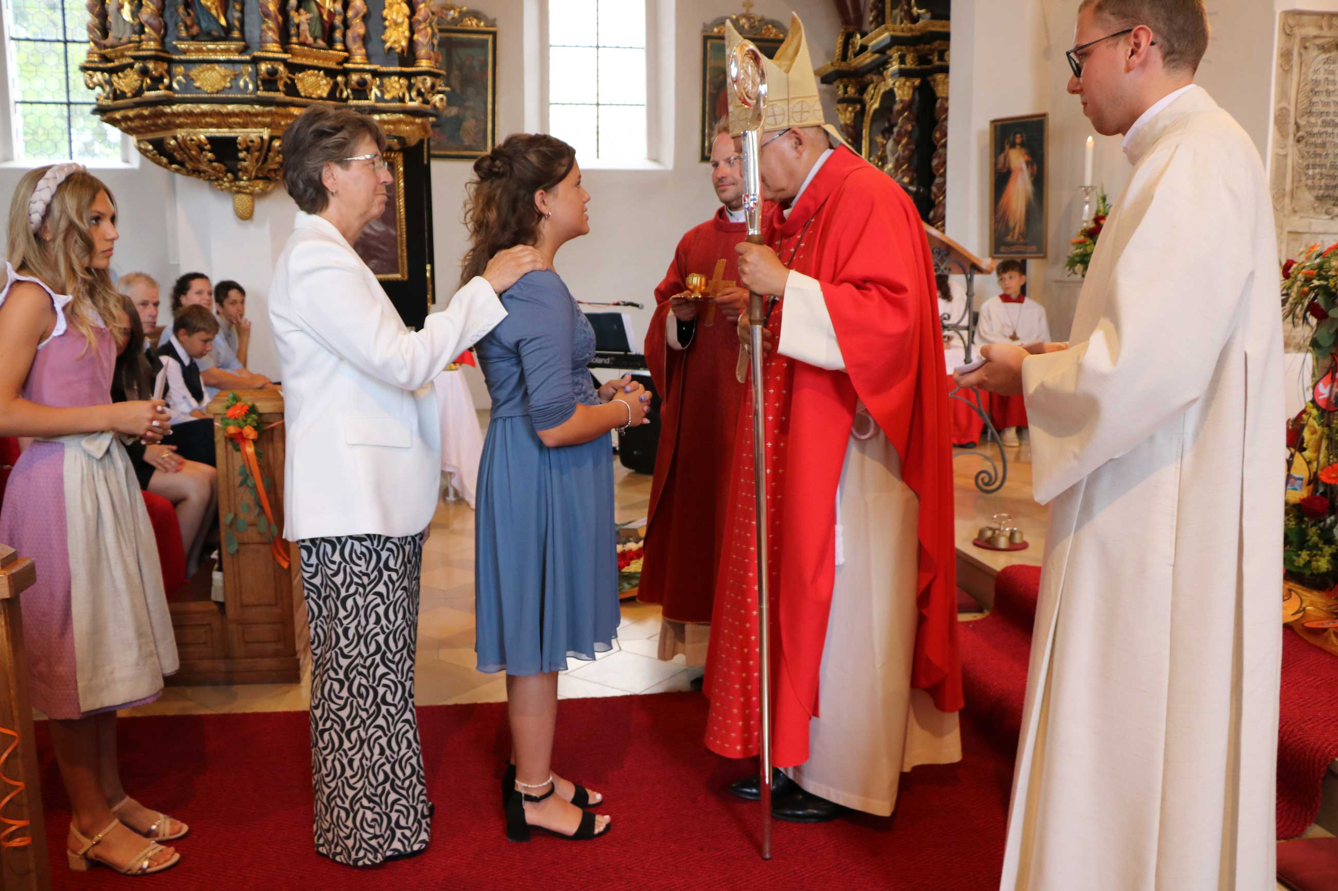 Bischof Rudolf dankte für den herzlichen Empfang und bekundete seine Freude darüber, den jungen Christen das Sakrament der Mündigkeit spenden zu dürfen. Sein besonderer Gruß galt den Firmbewerbern aus allen fünf Pfarreien, den Paten und Familien. Er begrüßte die priesterlichen Mitbrüder Pfarrer Martin Popp, Pfarrer Daniel Nowak (Urlaubsvertretung) und Pfarrvikar Micheal Amuthavalan aus Bernhardswald, Pastoralassistent Sebastian Göttl, Christoph Müller, dem Direktor des Maristen-Gymnasiums Furth, sowie Bürgermeister und Kirchenpfleger Michael Ostermayr. Der Bischof erklärte, „im Altarraum dominiert die Farbe Rot. Die Priester tragen ein rotes Messgewand als ein geistiges Zeugnis, ein Bekenntnis zur Kraft des Heiligen Geistes, der in Feuerzungen auf die Apostel herabgekommen ist“. Die Firmbewerber dürften ihr persönliches Pfingstfest feiern und ganz innig um die Gabe des Heiligen Geistes bitten. Der Geist möge sie zu feurigen Christen machen, dafür stünden die Flammen vor dem Altar mit den roten Rosen im Blumengebinde.