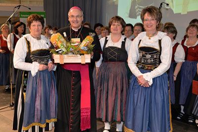 „Pflegt eine gute Sonntagskultur“ warb er für den gemeinsamen sonntäglichen Kirchgang, das Vorleben eines gläubigen Lebens und das Aufzeigen der Glaubensquellen des Glaubens. Ein starkes Plädoyer hielt Bischof Rudolf zum Wert von Ehe und Familie, besonders der Ehe von Mann und Frau, die im christlichen Sinn einzig die Basis für die Zukunft der Schöpfung ist. Die Gender-Philosophie, nach denen Mann- und Frau-Sein mehr kulturelle Erscheinungsform sei, bereite ihm Sorge. „Gott hat die Welt so eingerichtet und in diesem Unterschied von Mann und Frau liegt die Zukunft der Schöpfung. Denn auch in hundert und in tausend Jahren werden die Frauen die Kinder zur Welt bringen“ betonte der Bischof. Ein weiteres Kapitel widmete Bischof Rudolf dem „Miteinander der Generationen“. Verschiedene Generationen unter einem Dach gehört mit zum Charme eines bäuerlichen Anwesens. Hier erlebe man das „geboren werden“ und „sterben müssen“ sowohl bei Mensch als auch beim Tier mit. Sein besonderer Dank galt allen Frauen, die es mit ihrer Altenpflege ermöglichen, dass die ältere Generation so lange wie möglich zu Hause bleiben kann. „Das Leben ist in all seinen Phasen unantastbar“ betonte der Bischof und bat um Unterstützung, dies auch in der Gesellschaft vehement zu vertreten, sich nicht als Herr über Leben und Tod aufzuspielen. Damit verwies er sorgenvoll auf die Tendenzen der Gesellschaft in Europa hin, das Tabu der Sterbehilfe, der Euthanasie und des Suizids zu brechen. „Sonst wird aus der Möglichkeit schnell eine Verpflichtung“ warnte er. Abschließend lud Bischof Rudolf alle zum Katholikentag ein, bei dem es viele Möglichkeiten zum Brücken schlagen gibt in die verschiedenen Bereiche des Lebens. „Bringen Sie sich ein, übernehmen Sie Mitverantwortung“ warb der Regensburger Oberhirte. „Tragen wir gemeinsam dazu bei, dass unsere Heimat lebens- und liebenswert bleibt und wir gemeinsam Dienst am Menschen tun und uns auf Gott hin ausrichten“ schloss Bischof Rudolf sein Referat. Kreisbäuerin Margret Stadler dankte ihm gemeinsam mit ihren Stellvertreterinnen mit der Überreichung einer regionalen Schmankerlkiste. Der Landfrauenchor Straubing-Bogen gestaltete den Nachmittag unter der Leitung von Inge Heinrich mit bayerischen Liedern.