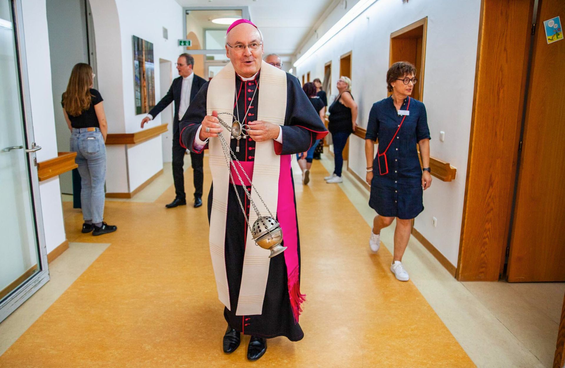 Bischof Dr. Rudolf Voderholzer segnete jedes Stockwerk einzeln im neuen „Caritas Marienheim – ein beschützendes Dach für Frauen“: die NOAH-Notunterkunft für Frauen im Erdgeschoss, die NOAH-Nachsorge im ersten Stock, die Wohngruppe St. Rita im zweiten Stock und auch das Projekt „Wohnen für Hilfe“ im Dachgeschoss. Dort werden zeitnah Zimmer für Studentinnen günstig vermietet, die sich im Haus ehrenamtlich engagieren.