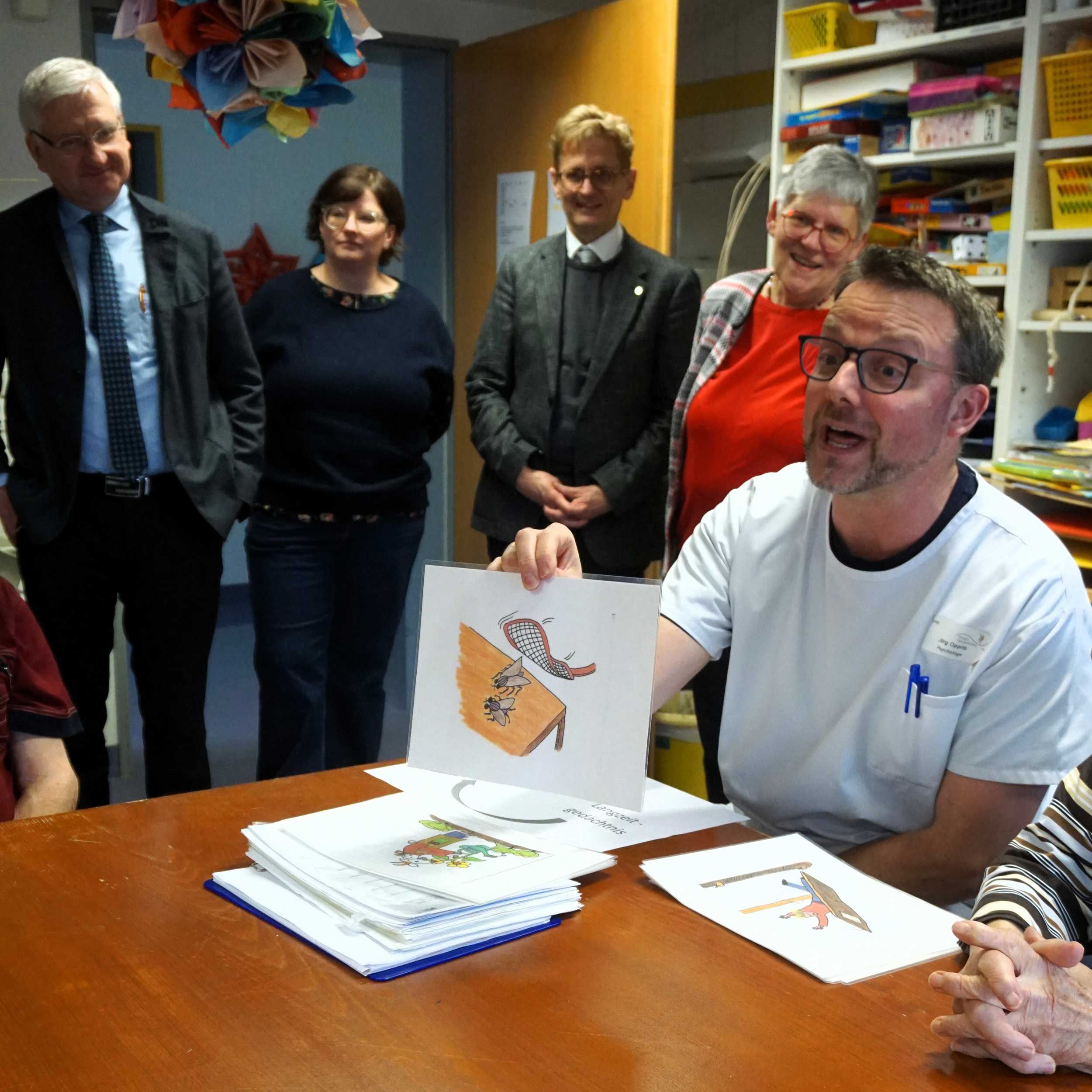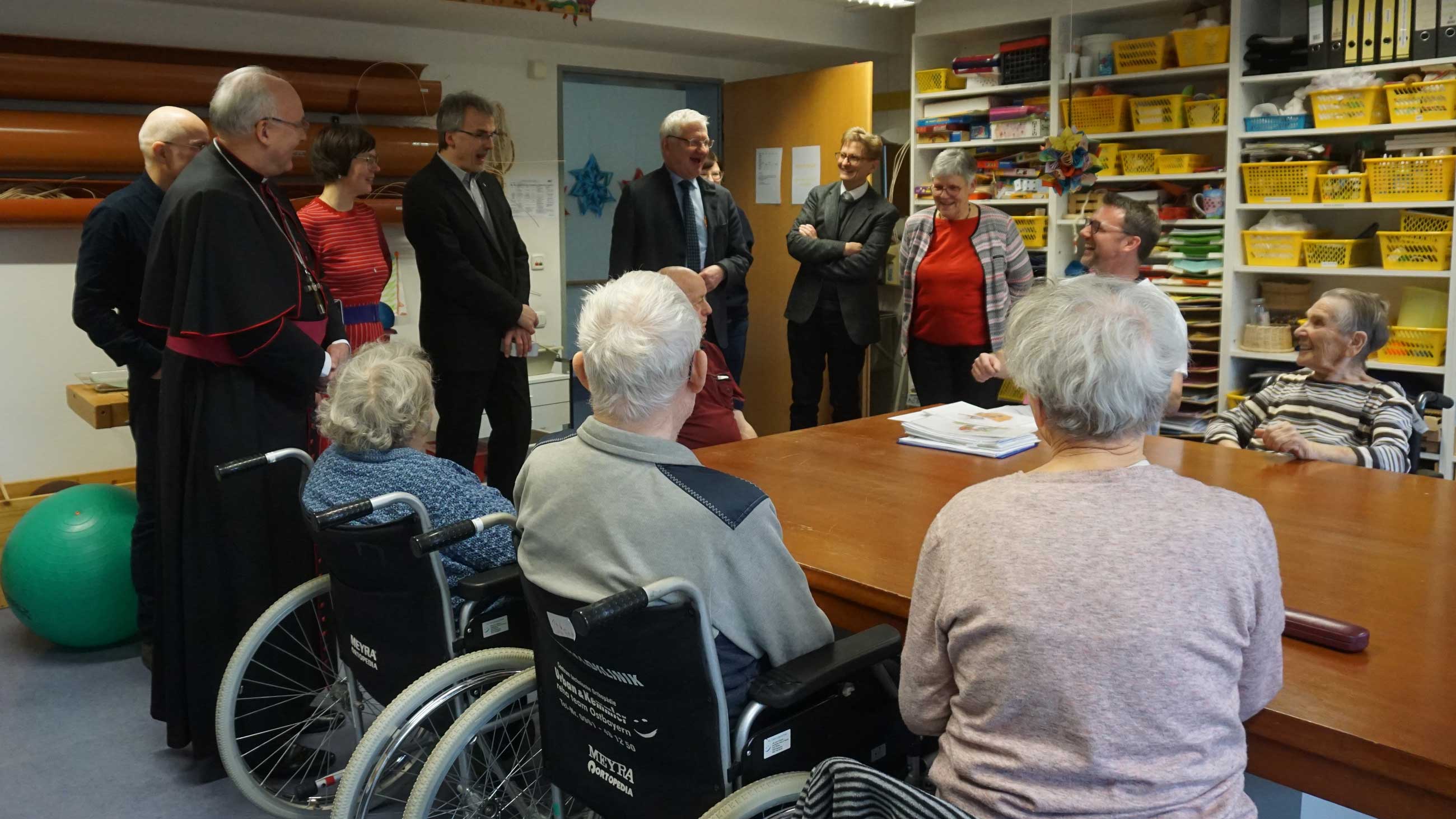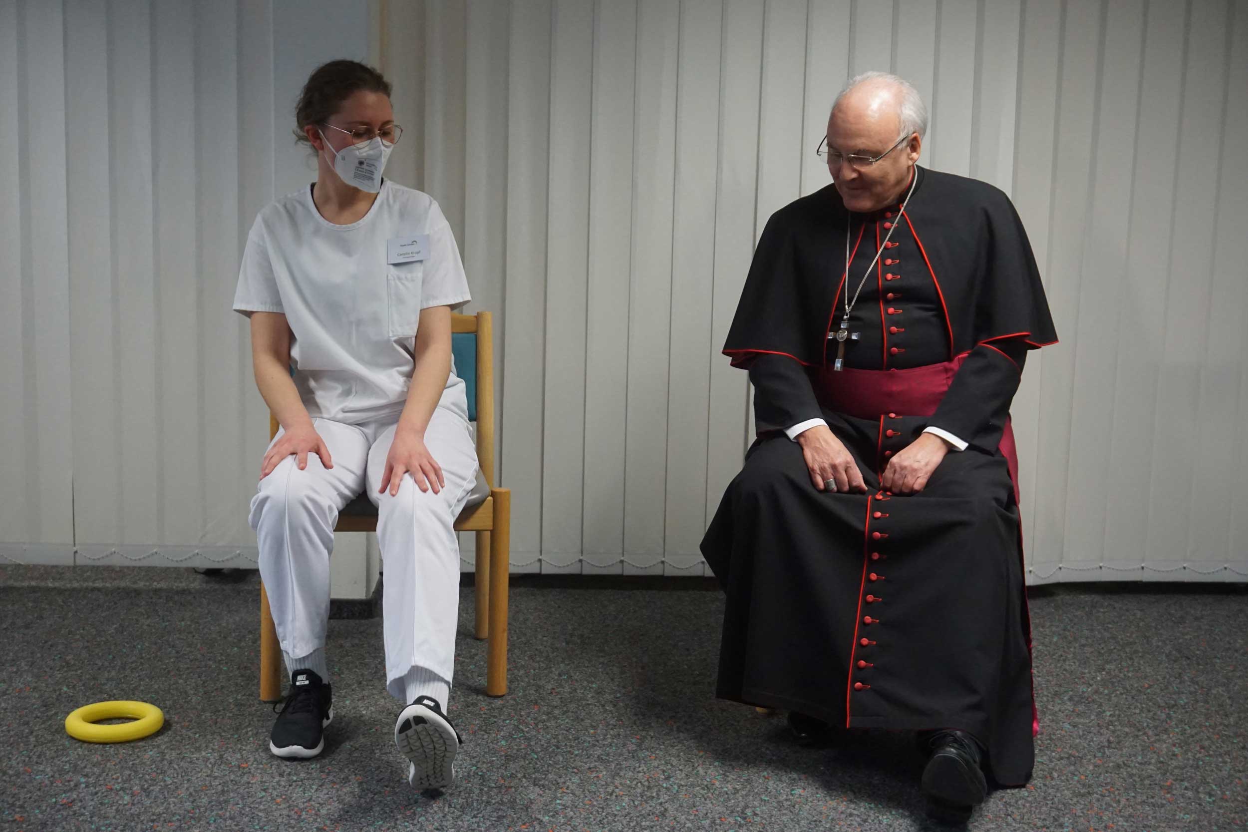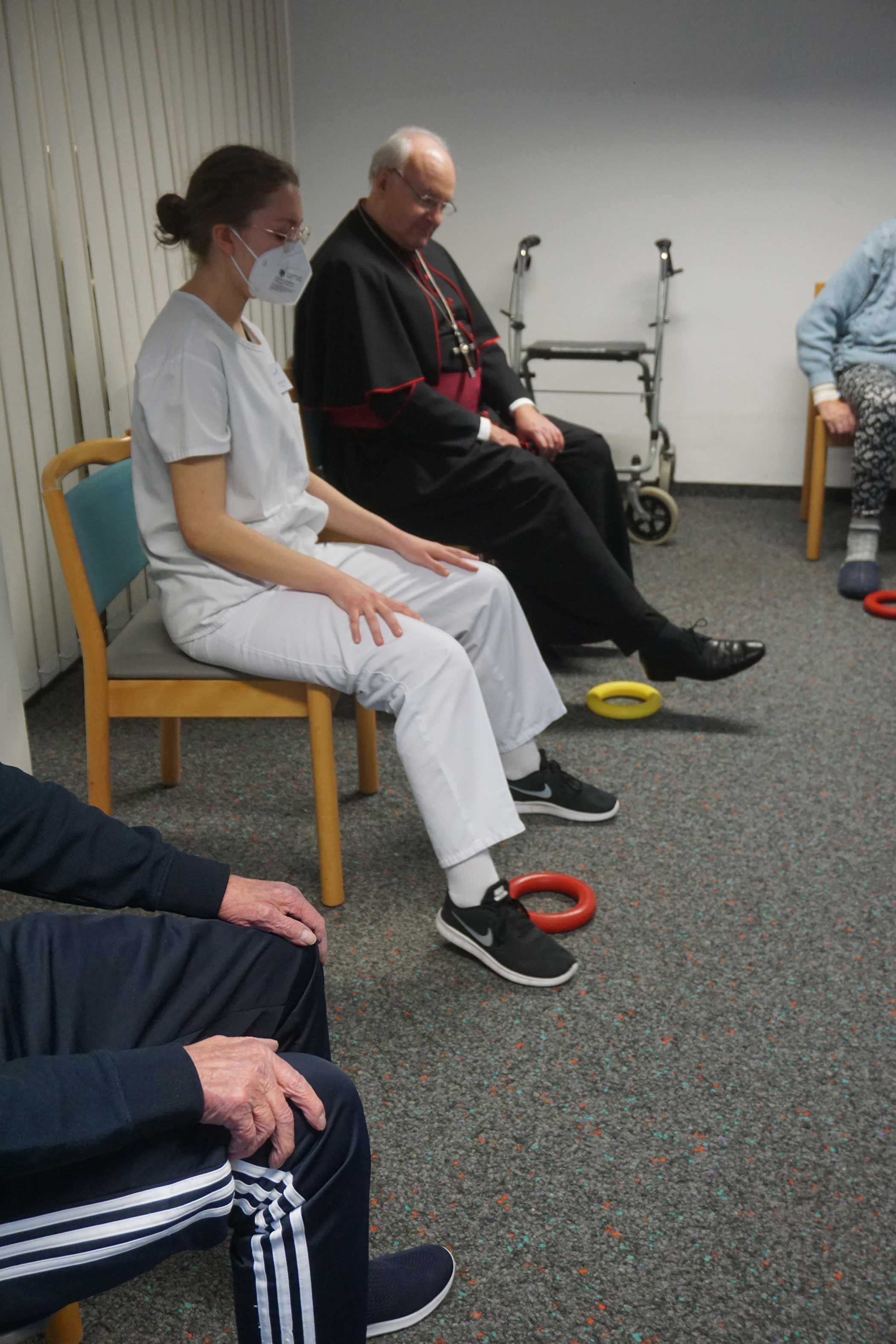 In Gesprächen mit dem Chefarzt Michael Schornbaum, der Pflegedienstleiterin Elfriede Schwarzmeier, der Oberärztin Dr. Bettina Schwarzmeier und weiteren Mitarbeitern und Mitarbeiterinnen aus dem Ärzte- und Pflegeteam ließ sich Bischof Voderholzer die Therapieangebote erläutern. Er nutzte die Gelegenheit, einen direkten Einblick in die „Gedächtnisgruppe“ zu nehmen. Hier arbeitete Psychologe Jörg Oppitz gerade mit sechs älteren Menschen. Es geht darum, Erfahrungen und Erlebnisse, die im Langzeitgedächtnis gespeichert sind, in das Kurzzeitgedächtnis zurückzuholen und zu nutzen. In der Gymnastikgruppe ging es um die Beweglichkeit der Beine und Füße. Mit einigen Patienten konnte der Diözesanbischof auf ihren Zimmern persönlich sprechen. Er fragte, wo sie herkämen, wie es ihnen gehe und was ihnen in der Steinwaldklinik gefalle. Und er hörte von den Fortschritten, die die Rehabilitation schon gebracht habe, von der sehr guten Betreuung durch das Ärzte- und Pflegeteam, vom guten Essen und von den Hoffnungen darauf, dass sie nach dem Reha-Aufenthalt wieder mit weniger Einschränkungen leben können.