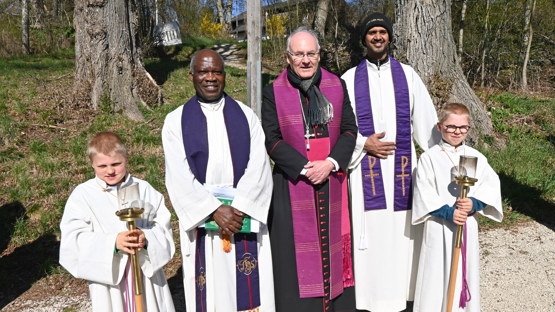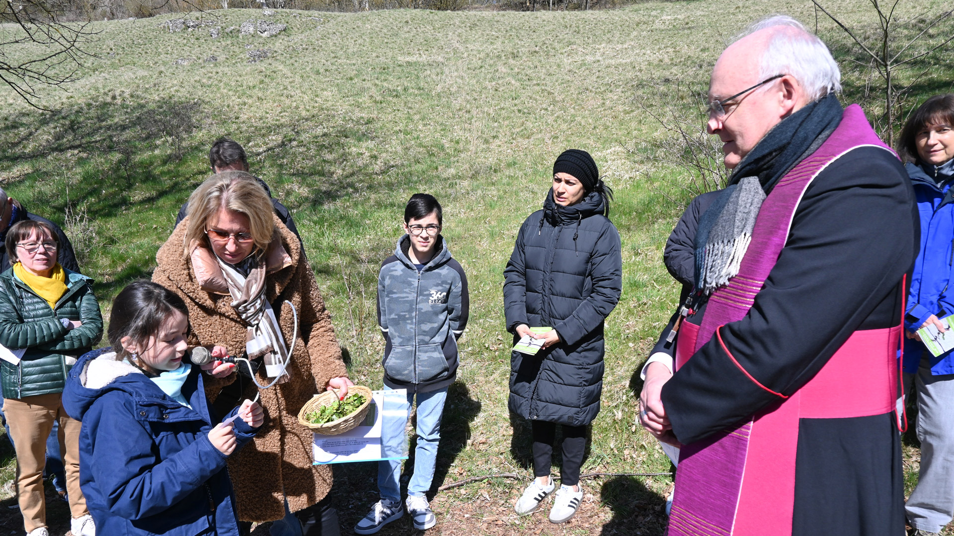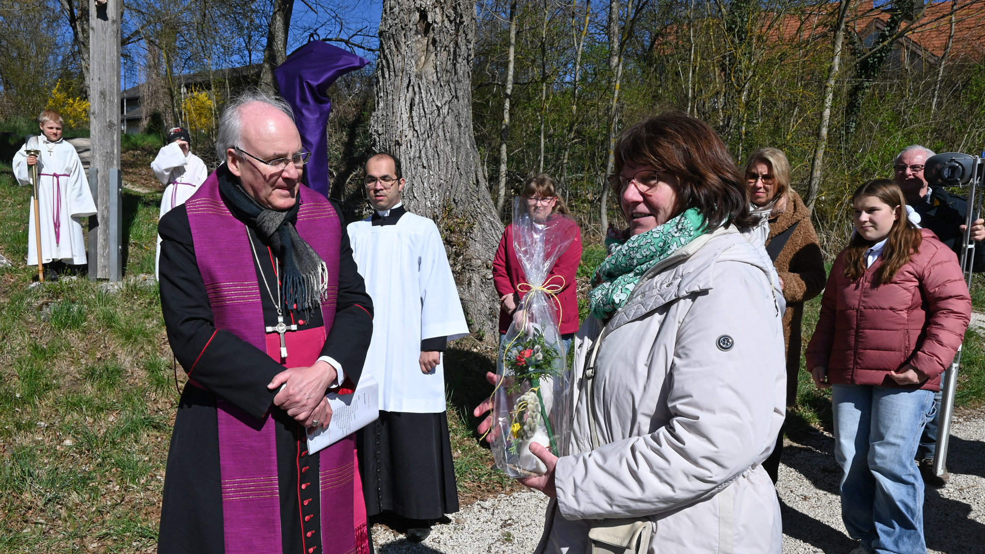 Die Kommunionkinder hießen zunächst den Oberhirten willkommen, Pfarrer Dr. Innocent Nwokenna stellte in seiner Begrüßung den Bezug zum Heiligen Jahr 2025 und dessen Thema „Pilger der Hoffnung“ her. Mit der „Bitte um die Gnade Gottes, dass wir auf dem Glaubensweg nie die Hoffnung verlieren“, übergab der örtliche Seelsorger das Wort an Bischof Voderholzer. Dieser dankte vorab den Lektoren, dem Kantor und den Ministranten und freute sich über den schönen Ausblick unter anderem auch auf die Pfarrkirche St. Martin. Kurz ging der Bischof auf die in vielen Orten präsenten Kalvarienberge ein: deren Bedeutung liege darin, auf einem Hügel in der Nähe der Kirche das Heilsgeschehen „in die eigene Umgebung hereinzuholen und so dem Heilsgeschehen nahe zu sein.“ Besonders freute ihn auch, dass die Bronzerelieftafeln des Kreuzwegs von Günter Mauermann, einem Künstler aus dem Sudetenland stammend, geschaffen worden waren.