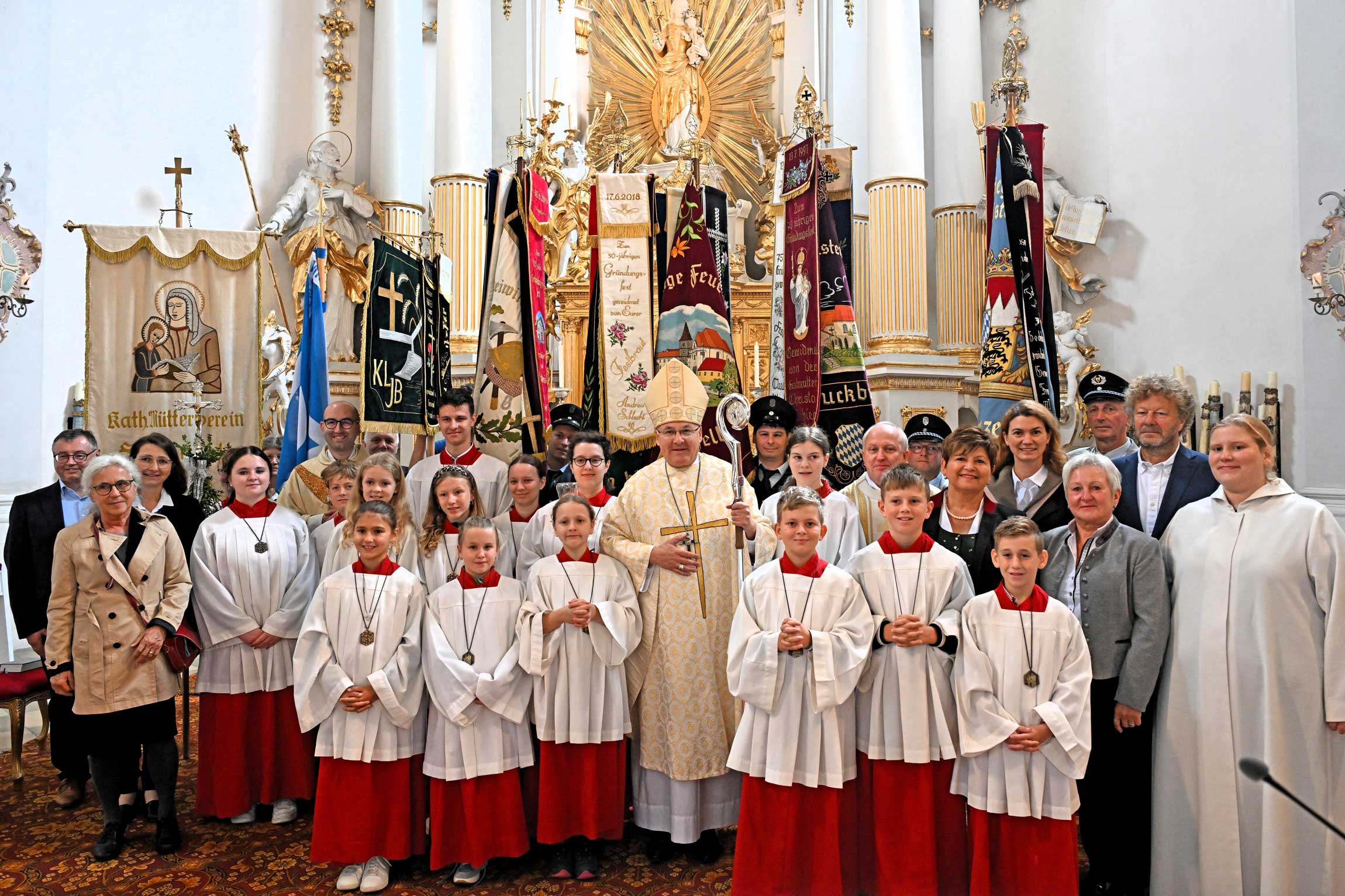 Dem feierlichen Pontifikalamt ging ein festlicher Kirchenzug mit zahlreichen kirchlichen und weltlichen Vereinen, Ministrantinnen und Ministranten, Pfarrer Florian Rein, Diakon Johann Emmerl sowie Gemeindereferentin Dorothea Stadler voraus. „So ein Jubiläum darf mit Pauken und Trompeten gefeiert werden“, sagte Bischof Voderholzer lachend und begrüßte unter anderem Bürgermeisterin Irmgard Sauerer, Landrätin Tanja Schweiger sowie die Vereine, die mit ihren Fahnen „noch mehr Farbe“ in den ohnehin prächtigen Kirchenraum brachten. Die Kirche wurde vor 25 Jahren umfassend renoviert und präsentiert sich noch immer wie neu – ein Umstand, den der Bischof mit Freude würdigte. Gleichzeitig erinnerte er an seinen ersten Besuch in Frauenzell vor elf Jahren, als dort das Requiem für Bischof Johannes Jobst, der viele Jahre in Australien gewirkt hatte, gefeiert wurde.