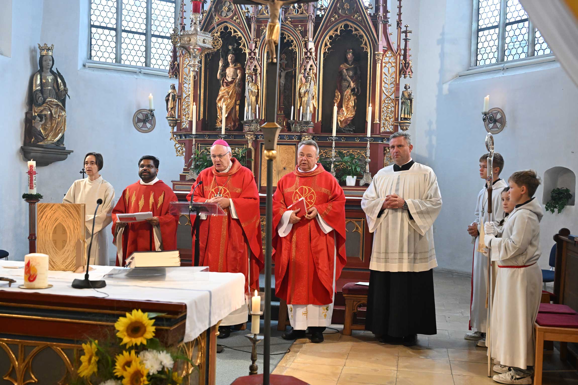 Die Fürbitten wurden von den Jugendlichen selbst gesprochen. Der Jugendchor unter Leitung von Veronika Münch gestaltete die Liturgie musikalisch. Die Eucharistie feierte Bischof Rudolf gemeinsam mit Pfarrer Thomas Kattayl V.C. Johnson, Pfarrvikar Prof. Dr. Josef Waleszcuzuk und der versammelten Gemeinde. Am Ende des Gottesdienstes bedankte sich Firmling Florian im Namen aller bei allen Beteiligten für die Vorbereitung und Durchführung der Feier.