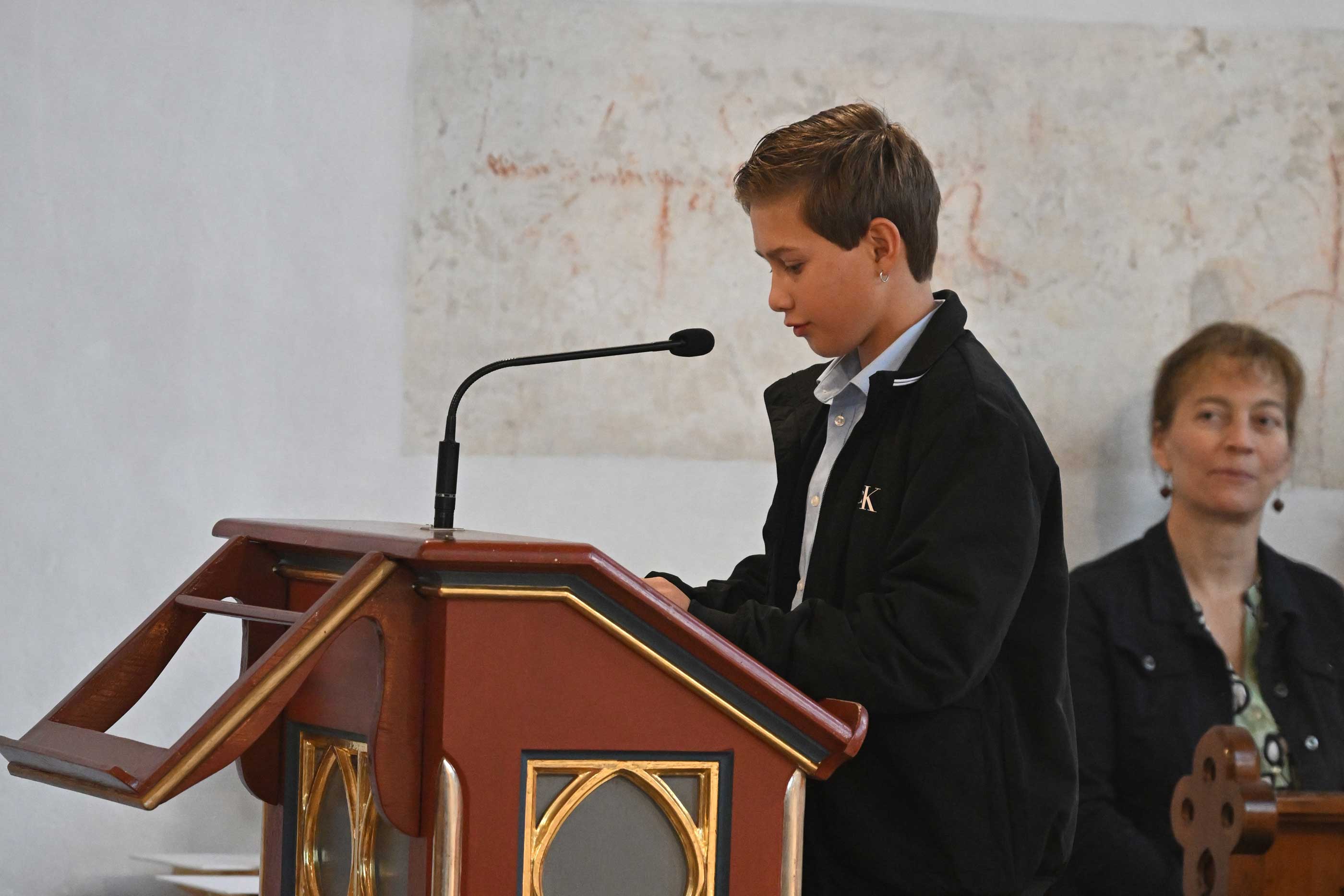 Besonderes Augenmerk legte der Bischof auf die zwölf brennenden Apostelleuchter, die symbolisieren, wie die Flamme des Glaubens auf die Apostel übergegangen ist – und nun auch auf die Firmlinge übergehen solle. Firmling Valentino trug die Pfingstlesung vor, die vom Kommen des Heiligen Geistes auf die Apostel berichtet: Ein Brausen wie ein Sturm erfüllte das Haus, Zungen wie von Feuer setzten sich auf sie und befähigten sie, in verschiedenen Sprachen zu sprechen und einander zu verstehen.