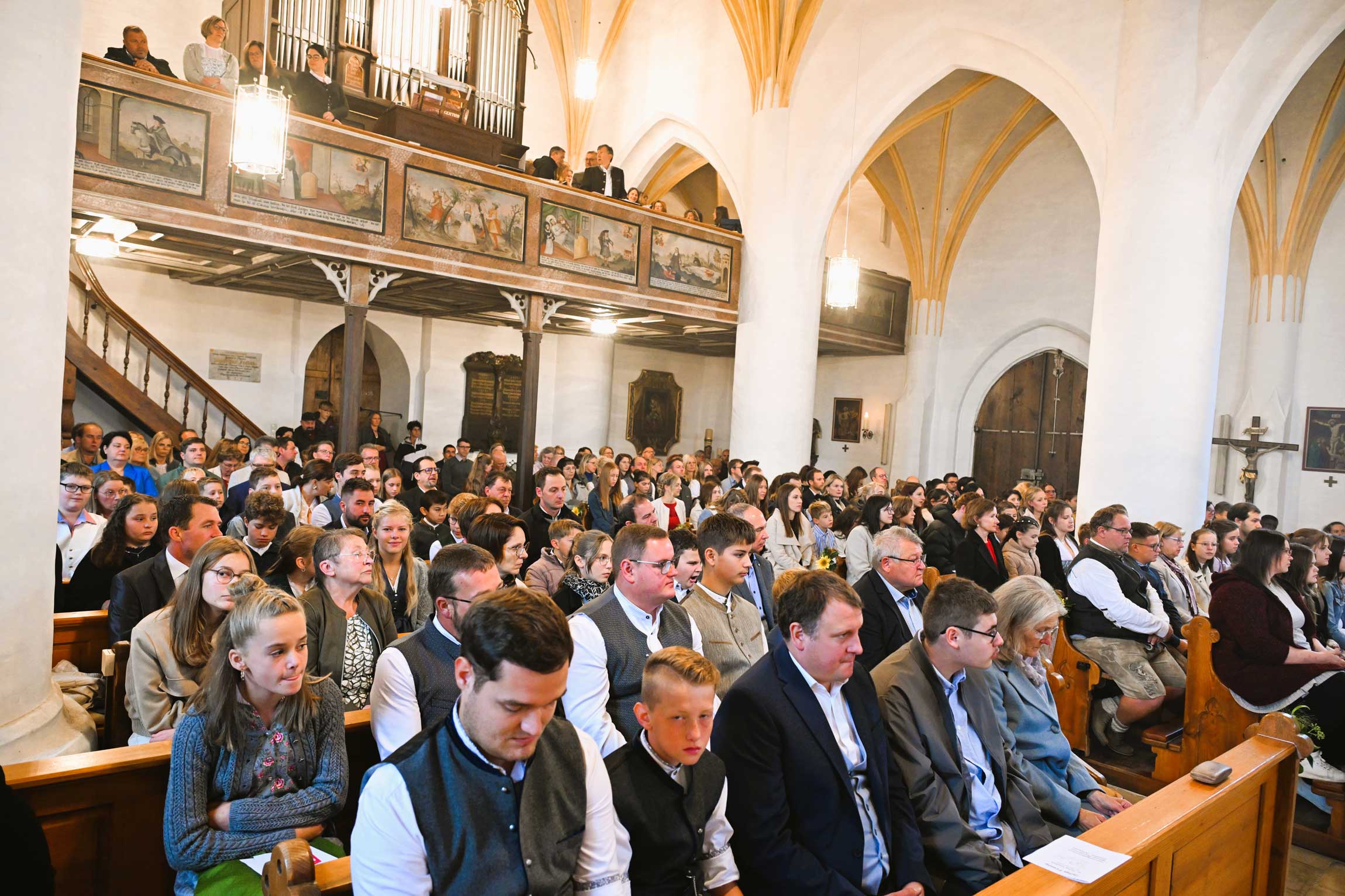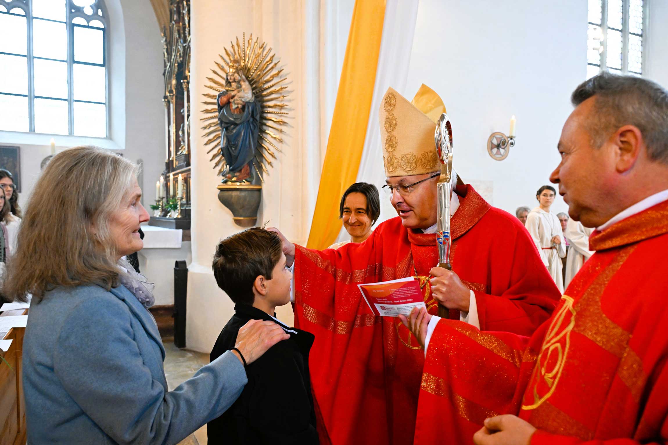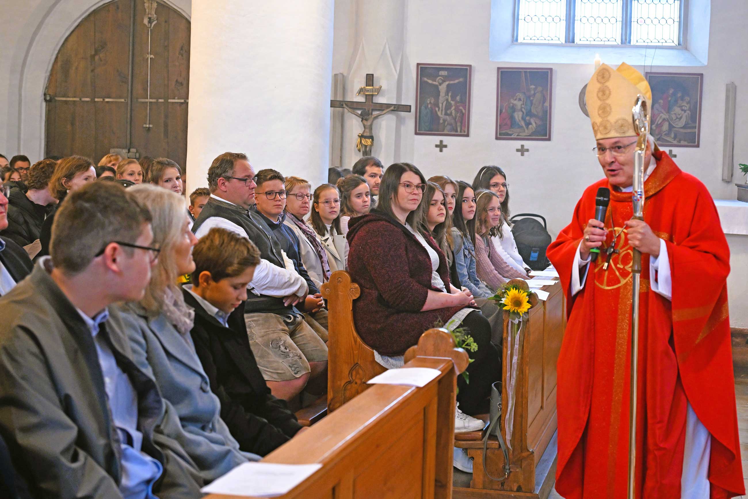 Die Kirche St. Corona war bis auf den letzten Platz mit Firmlingen, Paten und Eltern gefüllt. Bischof Rudolf erinnerte daran, dass die Heilige Corona, deren große Figur im Altarraum aufgestellt ist, in schwierigen Zeiten eine wichtige Fürsprecherin gewesen sei. Nun könne ein gemeinsames Fest der Freude gefeiert werden.
