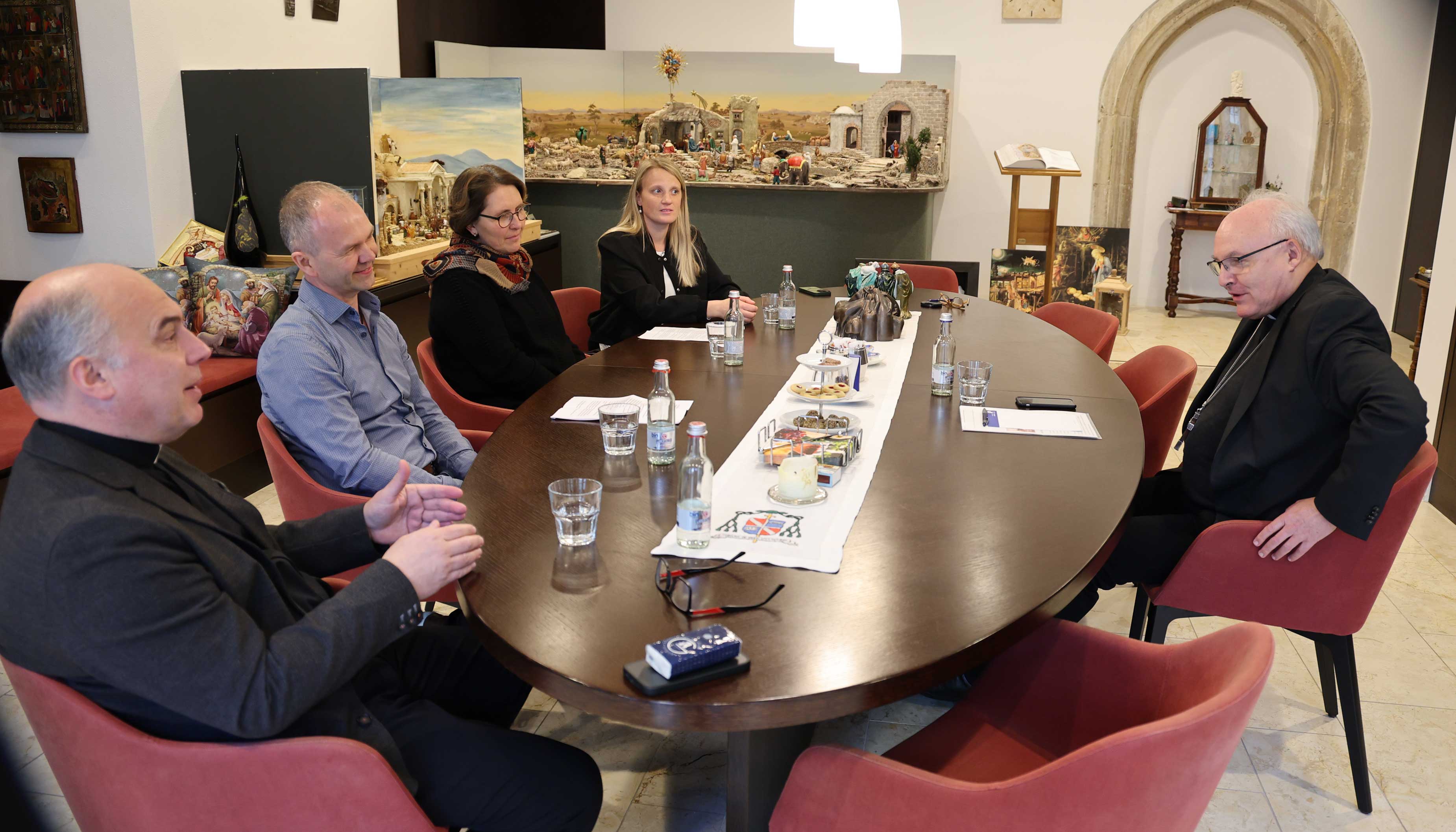 Bei einem gemeinsamen Treffen im Bischöflichen Ordinariat tauschte sich Bischof Dr. Rudolf Voderholzer vergangene Woche mit Mitgliedern der Pfarrgemeinderäte der Pfarreiengemeinschaft Attenhofen-Pötzmes-Walkertshofen und Pfarrer Pater Paul Binkowski OSPPE aus. Dabei wurden die Herausforderungen der Zusammenlegung von Pfarreien und das große ehrenamtliche Engagement der Gläubigen für einen lebendigen Glauben in den Pfarreien in den Mittelpunkt des Gesprächs gerückt.