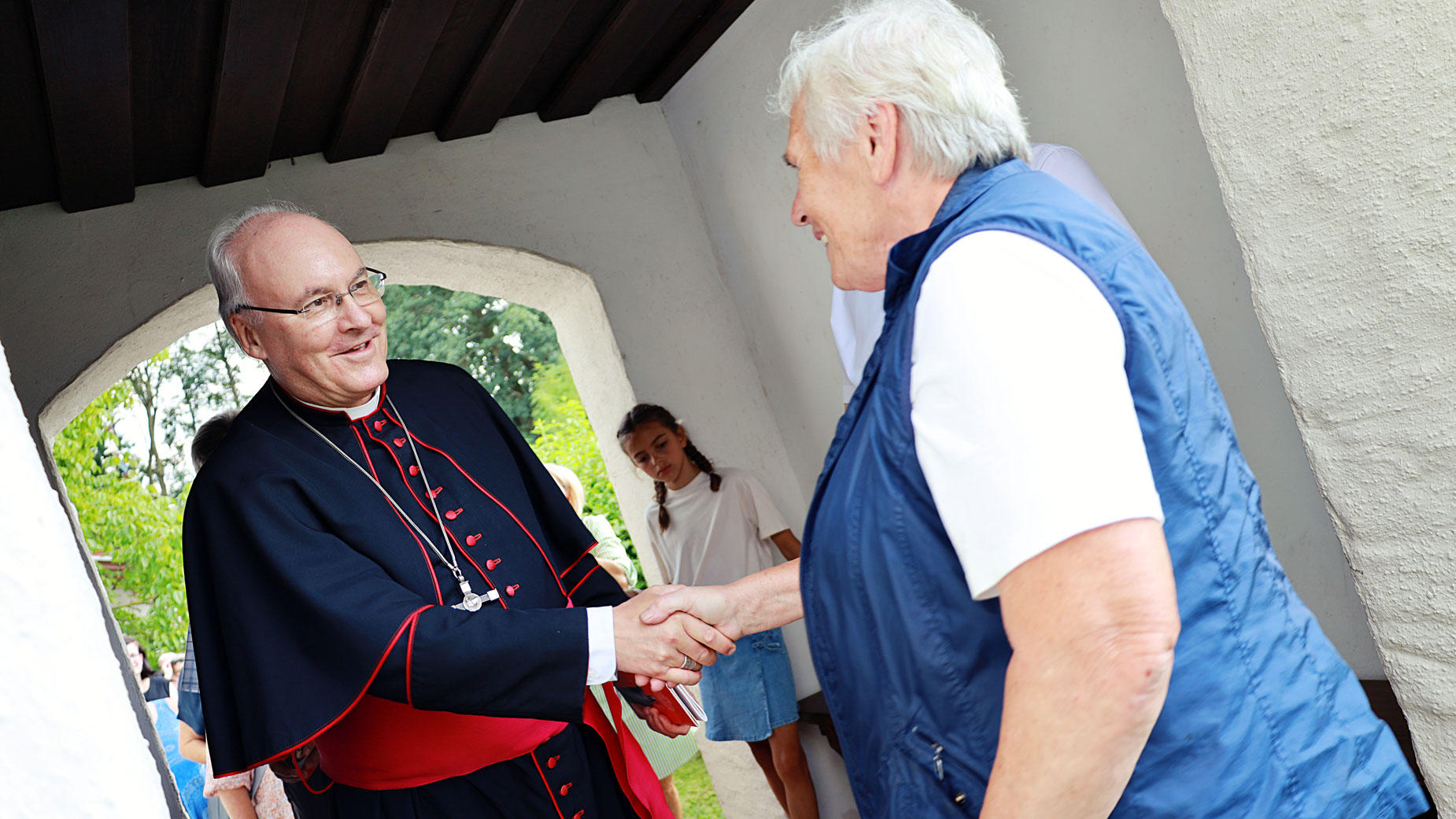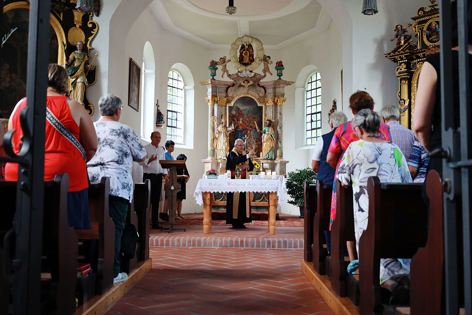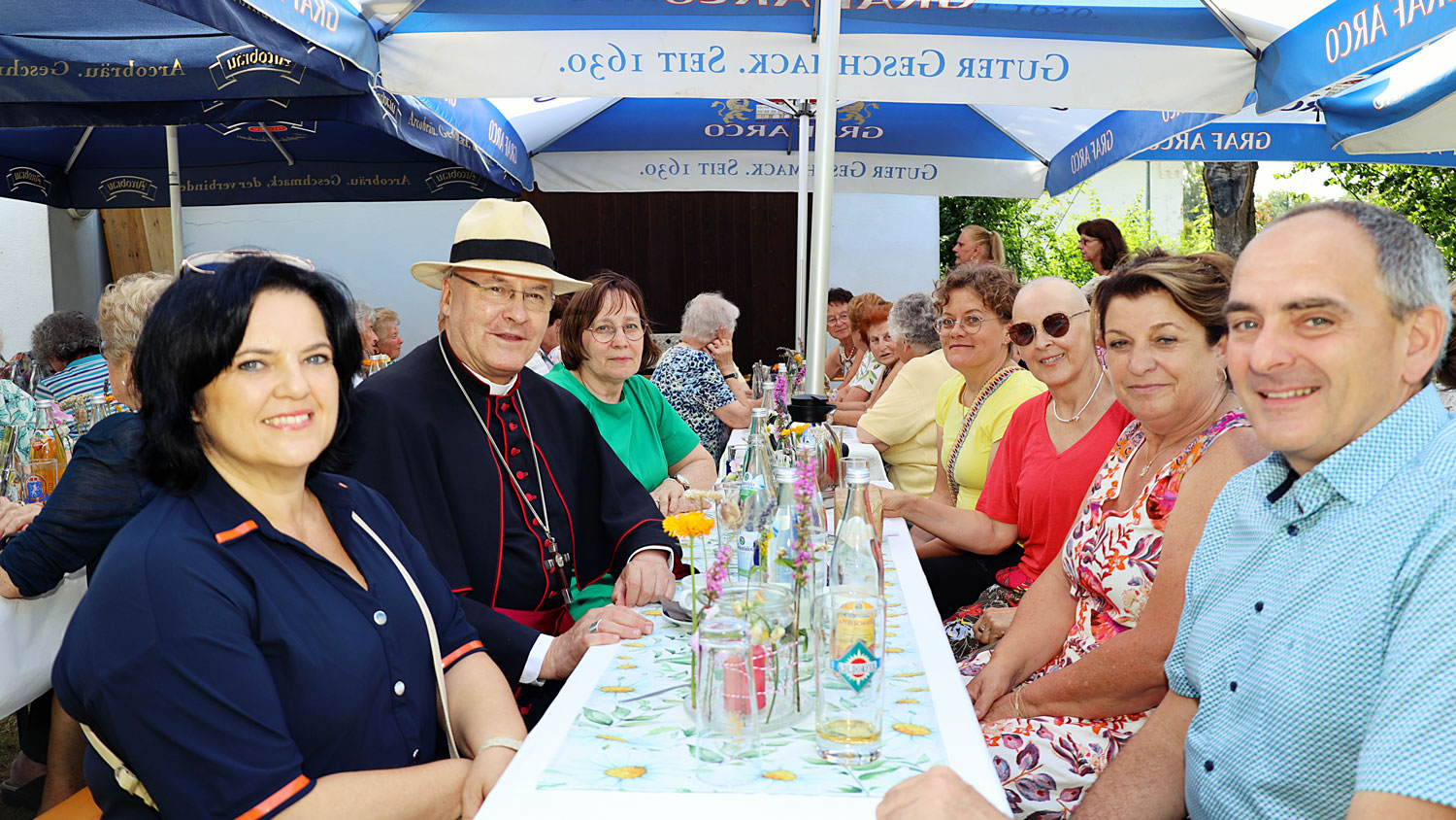 Nach dem Einzelsegen in der Filialkirche St. Wolfgang waren die Teilnehmer zu einem kühlen Umtrunk eingeladen, den die Mesnerfamilien hergerichtet hatte. Dabei bestand die Gelegenheit, mit Bischof Rudolf ins Gespräch zu kommen, der sich dafür ausgiebig Zeit nahm. Am 14. September führen die „Wolfgangsspuren“ nach Nittendorf im Landkreis Regensburg.
