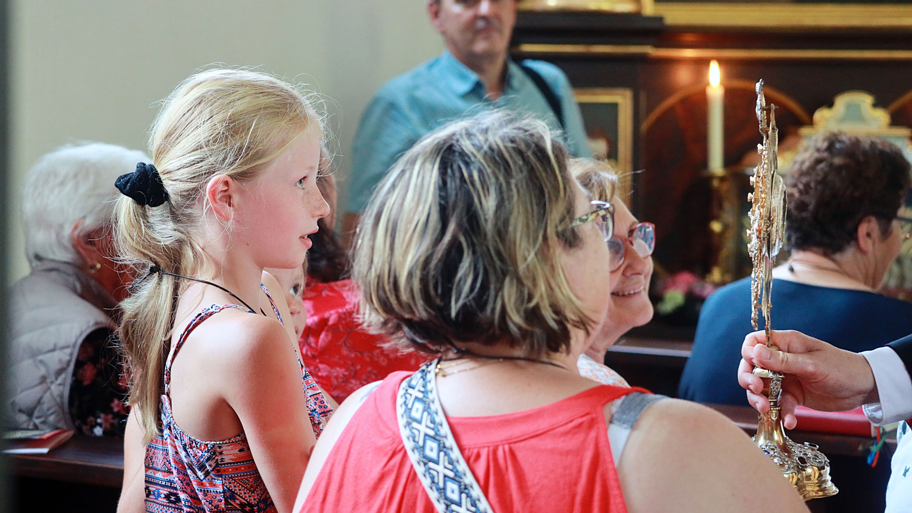 Die erste Station war die Pfarrkirche St. Jakob. Mit den Teilnehmern, die aufgrund der hohen Temperaturen nicht am Pilgerweg nach Loitersdorf teilnehmen konnten, wurde eine Andacht gefeiert. Hier gab Bischof Rudolf Einblicke in das Leben des Bistumspatrons. Ursprünglich sei er ein leidenschaftlicher Lehrer gewesen, der eine gute Ausbildung an der Klosterschule Reichenau erhalten und diese durch seine Studien an der Domschule in Würzburg vertieft habe. Selbst hatte Wolfgang nie das Amt des Bischofs angestrebt. Später hat er in Trier die Leitung der Domschule übernommen. „Das freut mich, weil ich in Trier auch Professor war“, fügte Bischof Rudolf hinzu. Dort bildete Wolfgang bereits Priester aus, obwohl er selbst noch kein Priester war. Später in Köln übte er eine Verwaltungstätigkeit aus. Bereits da hatte man einen Blick auf ihn geworfen, sah in ihm bereits den nächsten Erzbischof von Köln. Doch Wolfgang ging einen anderen Weg. Er wurde Mönch im Benediktiner-Kloster Einsiedeln in der Schweiz. Damals war das Kloster für seinen Reformeifer berühmt. Letztendlich hat er dort das gefunden, nach dem er gesucht hat: ein Leben, ganz dem Rhythmus des Gebets unterworfen, aber auch des Studiums und der Lehre. Aber das war noch nicht die Endstation seines Lebens. Ulrich von Augsburg, ein väterlicher Freund Wolfgangs, überredete ihn doch noch Priester zu werden, ruhten in ihm doch „begnadete Fähigkeiten und pastorale Leidenschaft“. Damals hatte Ulrich versucht, Augsburg zu schützen, indem er gegen Ungarn zu Felde zog. Wolfgang zog zur Verkündigung des Evangeliums nach Ungarn. Damals waren die Ungarn noch nicht christlich. Wolfgang hat sich dann – ziemlich allein – nach Ungarn begeben, doch die Mission scheiterte. Sein großes Engagement für den Glauben hatte Bischof Pilgrim von Passau derart begeistert, dass er Wolfgang zu sich kommen ließ, weil er wissen wollte, was dies für ein sonderbarer Priester-Mönch war, der allein in Ungarn missionieren wollte. Der Passauer Bischof hatte erkannt, welch große Persönlichkeit Wolfgang sei und welch großer missionarischer Ernst ihn antrieb. Bischof Pilgrim von Passau empfahl ihn für den Bischofsstuhl in Regensburg. „Nochmal Nein sagen konnte er nicht“, sagte Bischof Rudolf und lachte, „und jetzt sind wir hier.“ Mit der Reliquie des Heiligen Wolfgang, eingebettet in eine kunstvolle Monstranz, empfingen die Teilnehmer der Andacht einzeln den Segen. „Die Zeit nehmen wir uns noch“, sagte Pfarrer Thomas Diermeier. Die Pilger erhielten dann alle eine Medaille mit dem Diözesanpatron anlässlich seines 1.100 Geburtstages.