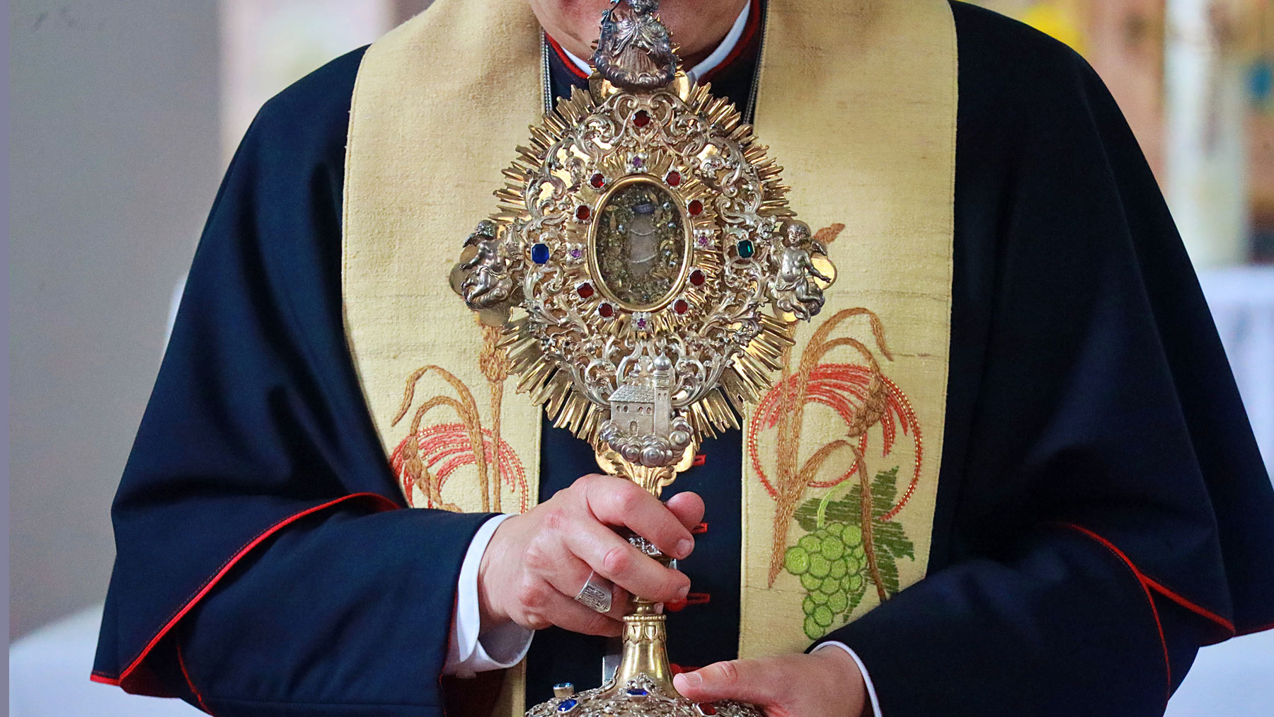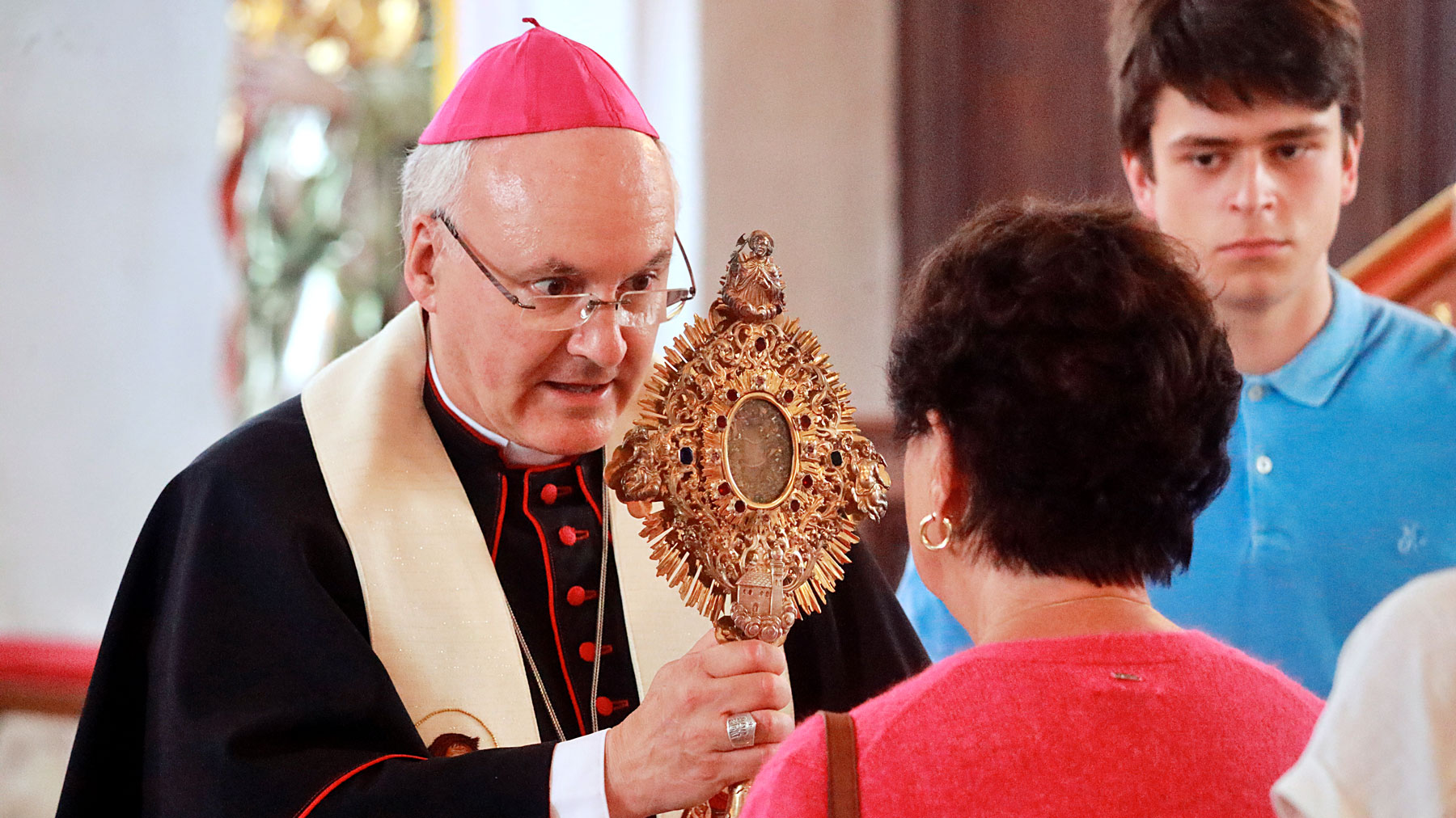 Bischof Rudolf bedankte sich bei seiner Ankunft bei allen, die in die kleine Filialkirche gekommen waren. „Ich komm‘ von einem Staunen ins andere, wenn ich mir hier anschaue, wie viele verschiedene Wolfgangskirchen ich schon habe kennenlernen dürfen!“ Zugleich fragte er: „Was ist das Besondere an eurer Wolfgangsdarstellung?“. Mit der barock eingefassten Wolfgangsreliquie aus Matting ging er auf die Gläubigen zu. „Wenn man genau hinschaut, sieht man, dass es eindeutig eine Wolfgangsreliquie ist!“ Gut zu erkennen ist Wolfgang mit den Bischofsattributen, der Mitra und dem Bischofsstab, mit der Kirche vor sich und dem Beil in der Hand. „Das unverwechselbare Kennzeichen, das Hackl, das gehört immer dazu“, sagte Bischof Rudolf, „es ist nur die Frage: wo tun wir das Hackl hin?“ Das Beil bei der Wolfgangsstatue in Loitersdorf steckt mitten im Kirchendach. „Wenn jemand reinkommt, der sich mit dem Heiligen Wolfgang nicht so gut auskennt, der könnte fast der Meinung sein, der Heilige Wolfgang sei gekommen, um die Kirche abzureißen“, sagte er. „Aber das Gegenteil war der Fall!“