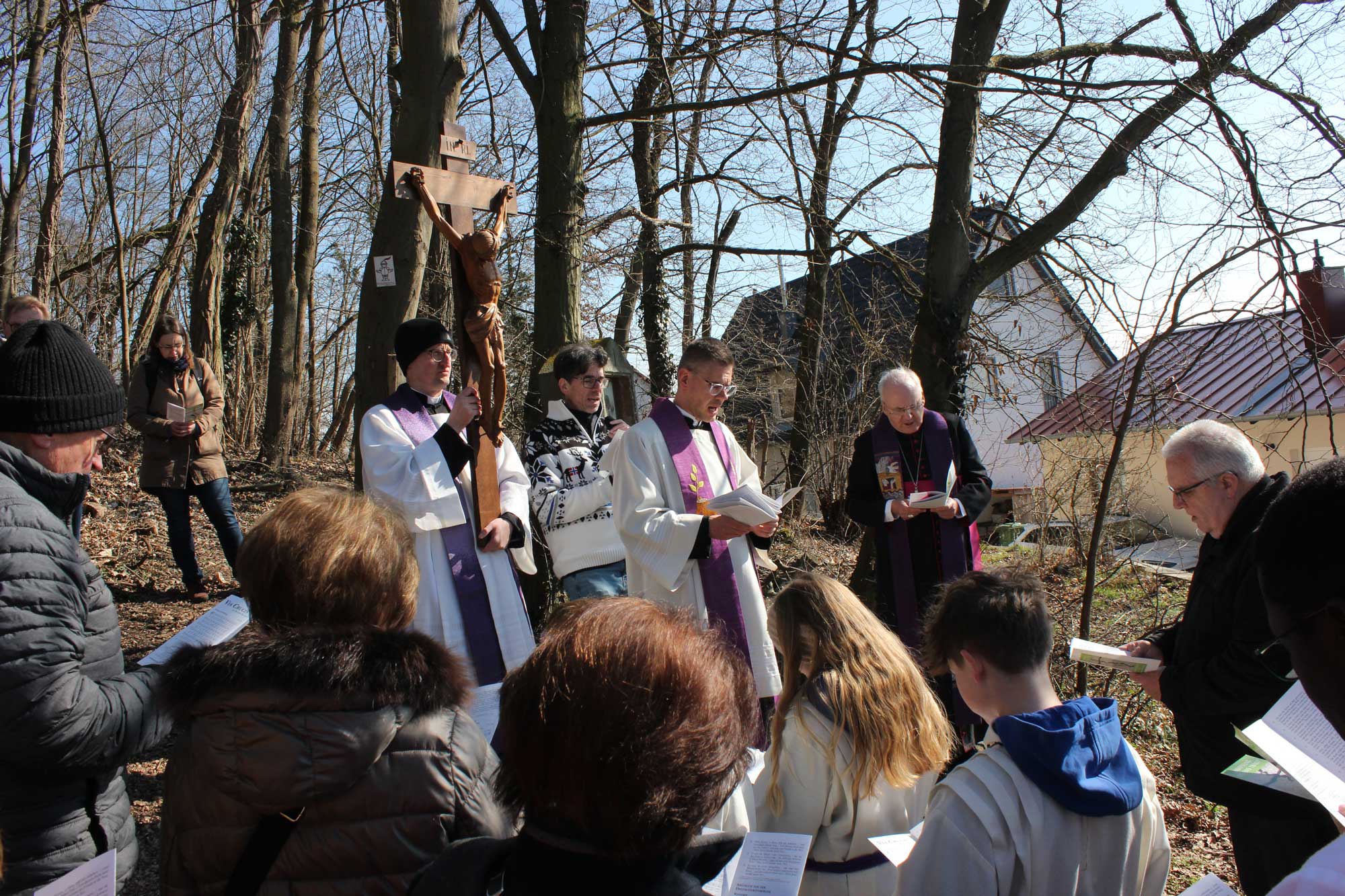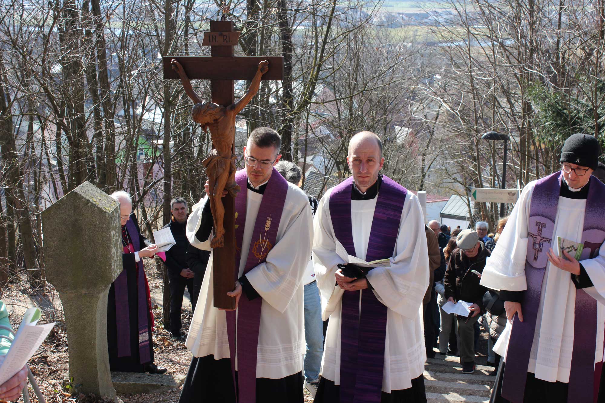 Vor dem Kreuz am Schlossberg endete die Prozession. Der Bischof dankte hier allen Gläubigen, die ihn auf dem Kreuzweg begleitet hatten und allen Helfern, die an der Durchführung und Gestaltung der Feier mitgewirkt hatten. Er erinnerte an den kranken Papst Franziskus, der aufgerufen habe, in diesem Heiligen Jahr Pilger der Hoffnung zu sein und bat darum, die Genesung des Heiligen Vaters weiterhin mit Gebeten zu unterstützen. Der Papst habe auf eine weit verbreitete Hoffnungslosigkeit in den westlichen Gesellschaften hingewiesen, verbunden mit einem schwindenden Glauben. Umso wichtiger sei es, so Bischof Rudolf „dass wir als Christen Pilger der Hoffnung, Zeugen der Hoffnung sind“, und wir jetzt diese vorösterlichen Tage nützten, uns innerlich im Glauben und in der Liebe aufbauen zu lassen. Wer um eine von Gott geschenkte, geborgene Zukunft wisse und sie im Glauben erhoffe, erhalte Kräfte, die für ein gutes Miteinander der Menschen sorgten und die auch dem Frieden dienten, so der Regensburger Oberhirte. Er verwies auf das Osterfest als Zeichen, dass das Leben stärker sei als der Tod und dass die Auferstehung stärker sei als alle Finsternis. Zum Schluss wünschte der Bischof den Gläubigen „eine gute, geistlich stärkende und die Hoffnung nährende Zeit der Vorbereitungen auf Ostern“ und beendete den Kreuzweg mit seinem Segen.