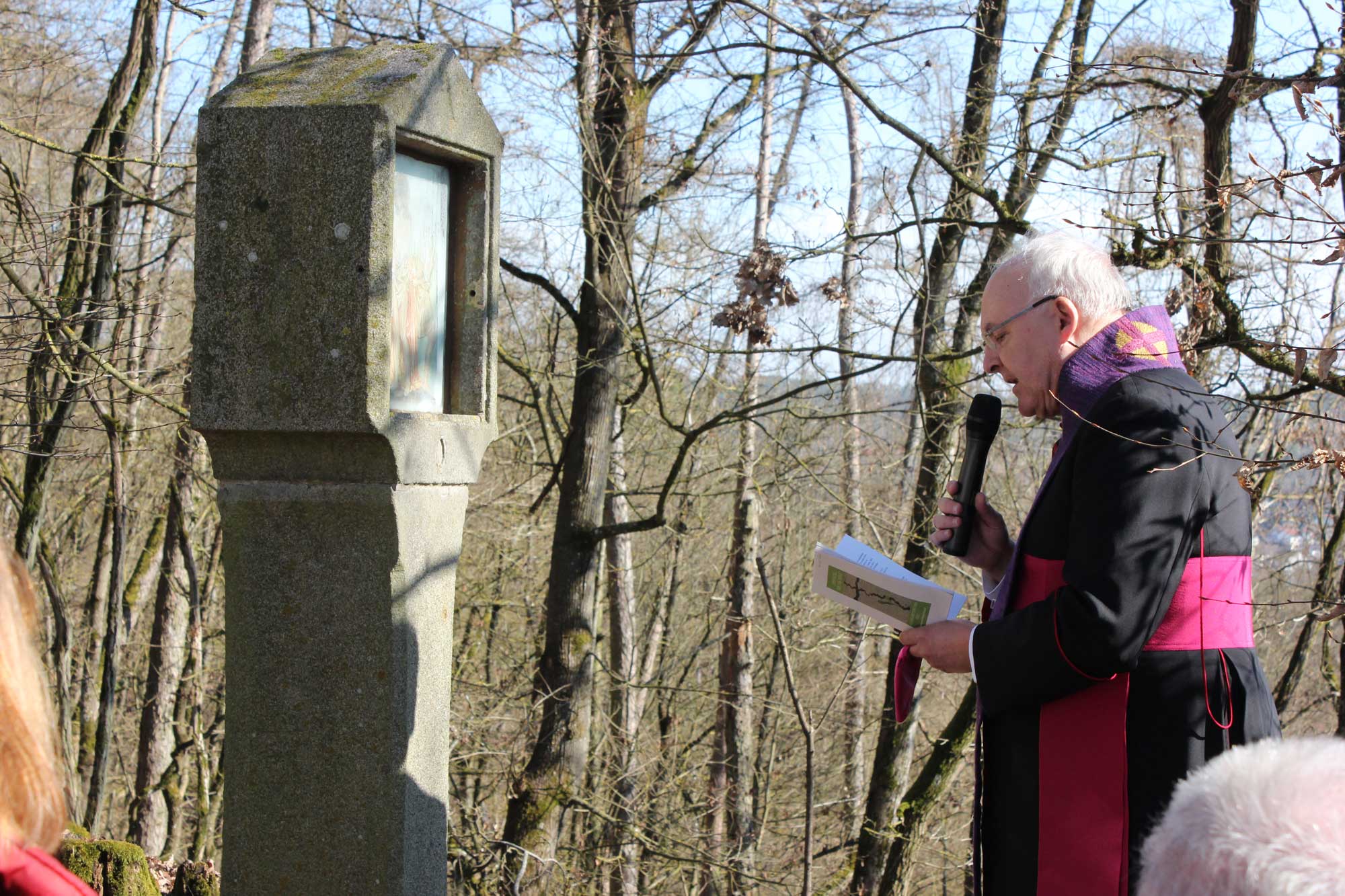 Zu Beginn begrüßte Pfarrer Christian Blank den Regensburger Bischof und die Teilnehmer der Prozession und drückte seine Freude über die große Zahl der Gläubigen aus dem ganzen Pfarrgemeindeverband aus, die sich bei schönstem Wetter und im Grünen eingefunden hatten, um den Kreuzweg zu beten.