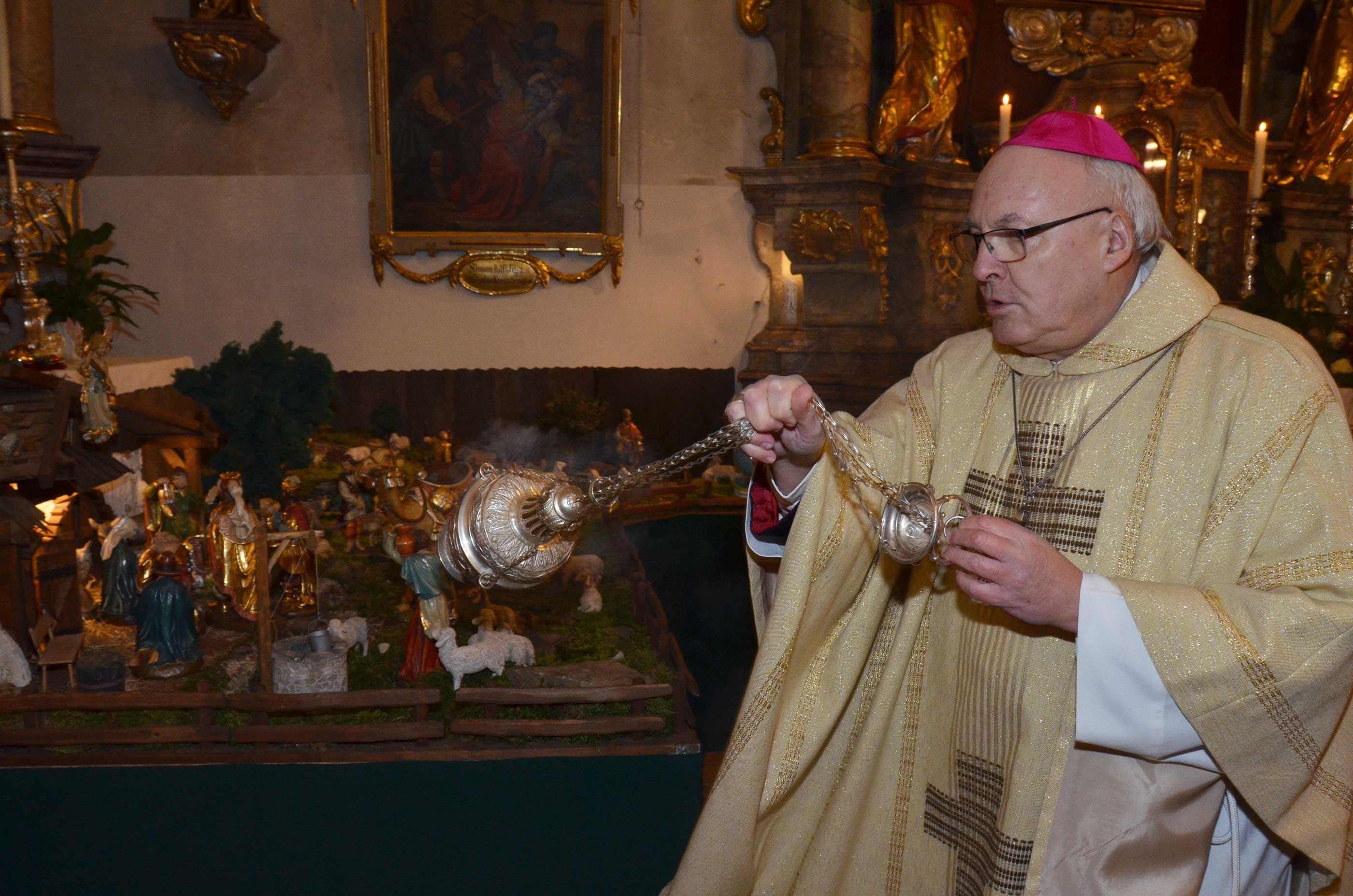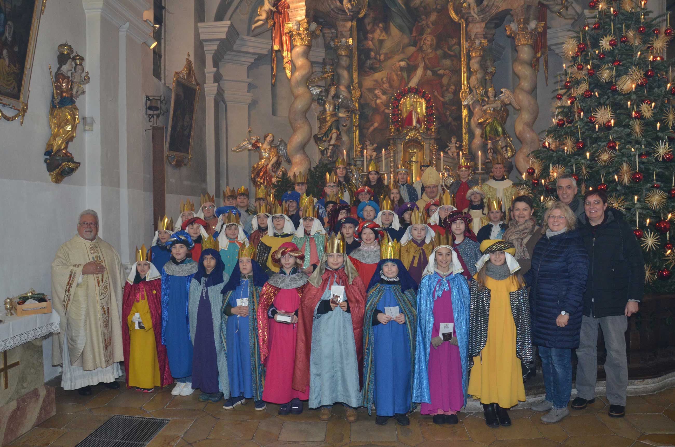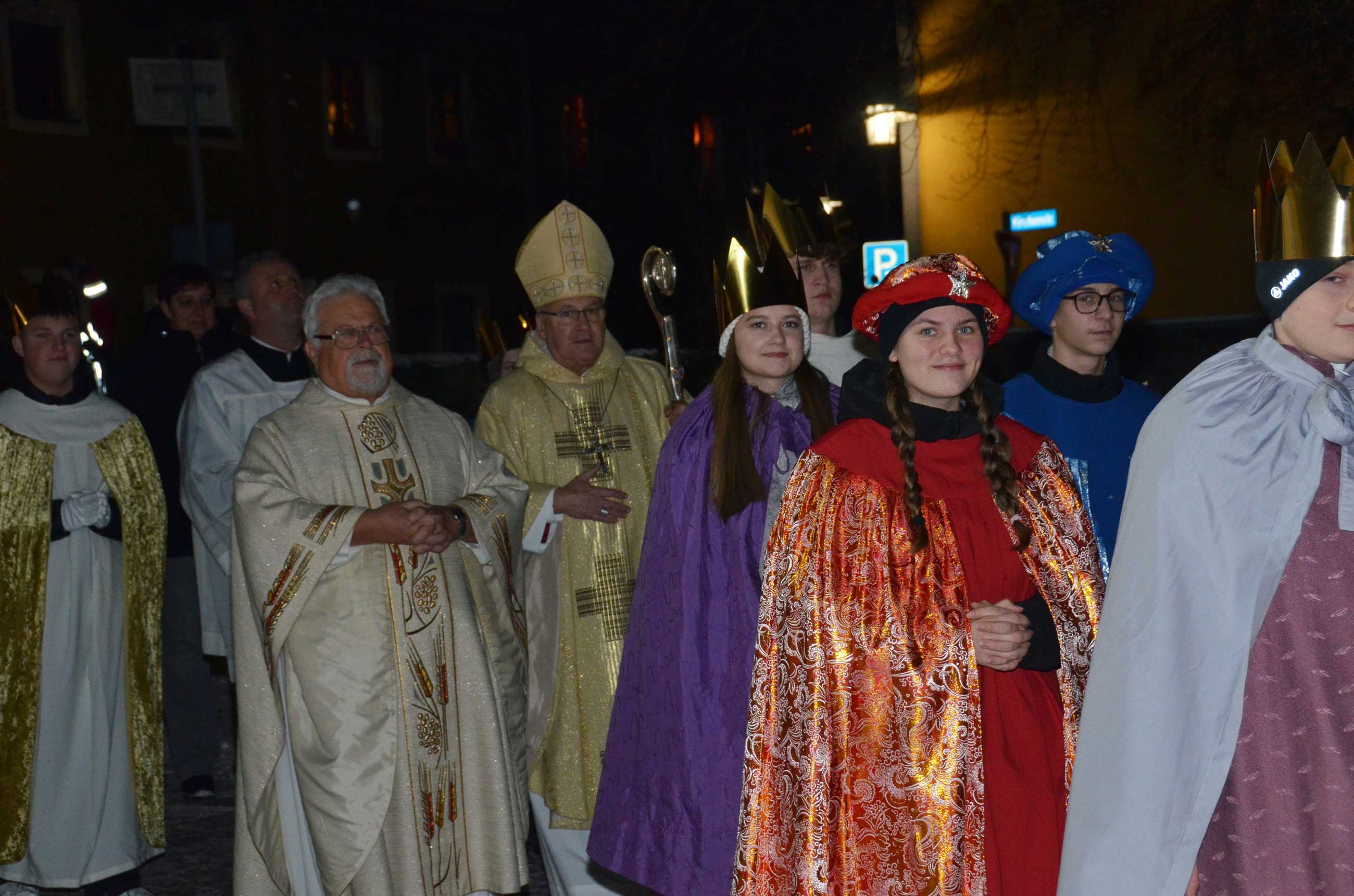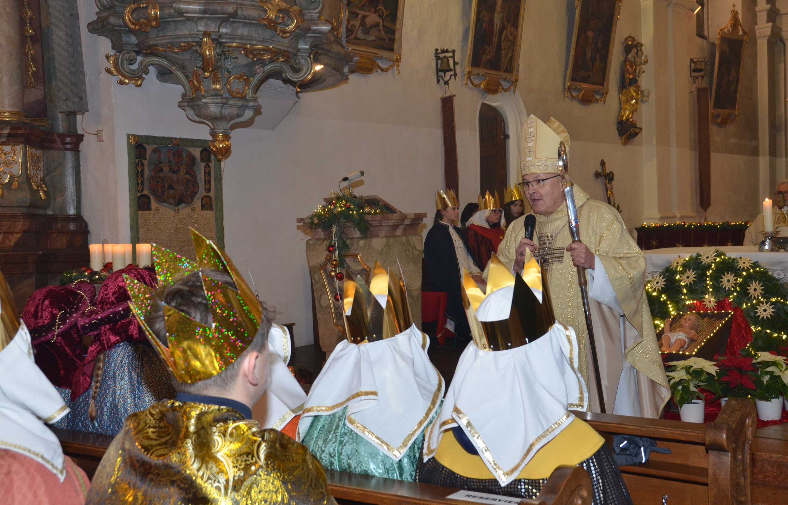 43 prächtig gekleidete Sternsinger zogen zusammen mit dem Bischof in das weihnachtlich geschmückte Gotteshaus ein und machten schon beim Einzug deutlich, wofür sie in diesen Tagen unterwegs waren. Unter dem diesjährigen Motto des Dreikönigssingens „Schule statt Fabrik – Sternsingen gegen Kinderarbeit“ sammelten die Buben und Mädchen trotz eisiger Kälte Spenden für benachteiligte Kinder in Bangladesch und weiteren Ländern. Mit Liedern, Texten und dem Segensspruch „Christus mansionem benedicat“ brachten sie den Segen in die Häuser und verdeutlichten als Caspar, Melchior und Balthasar die überlieferte Heilsgeschichte.