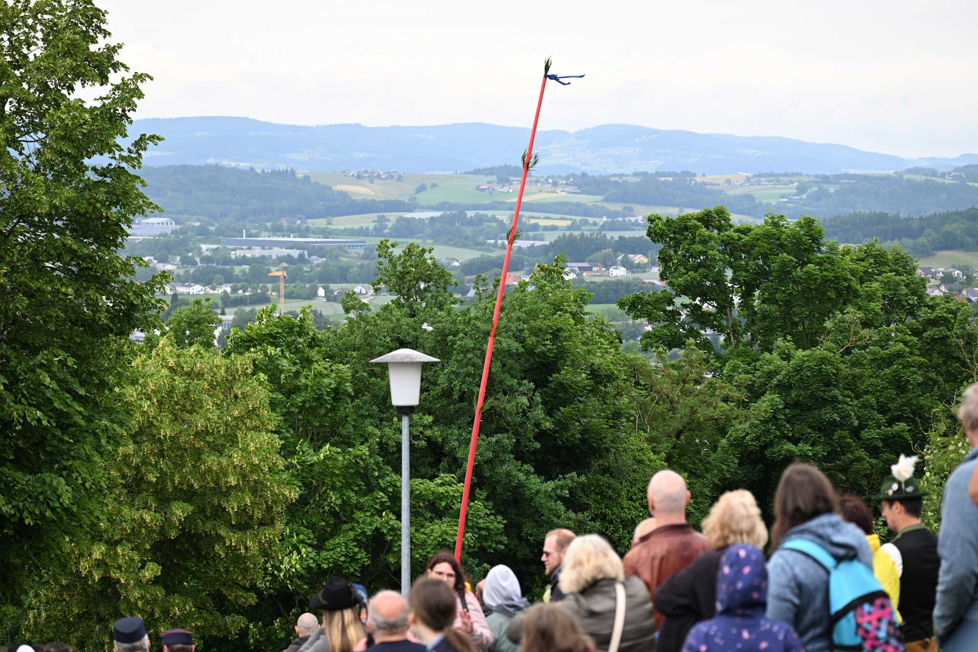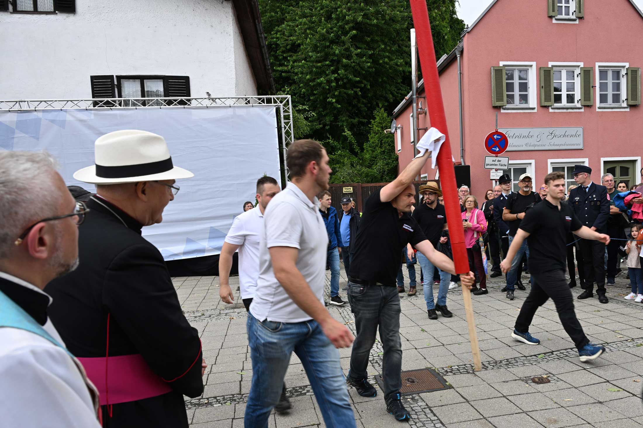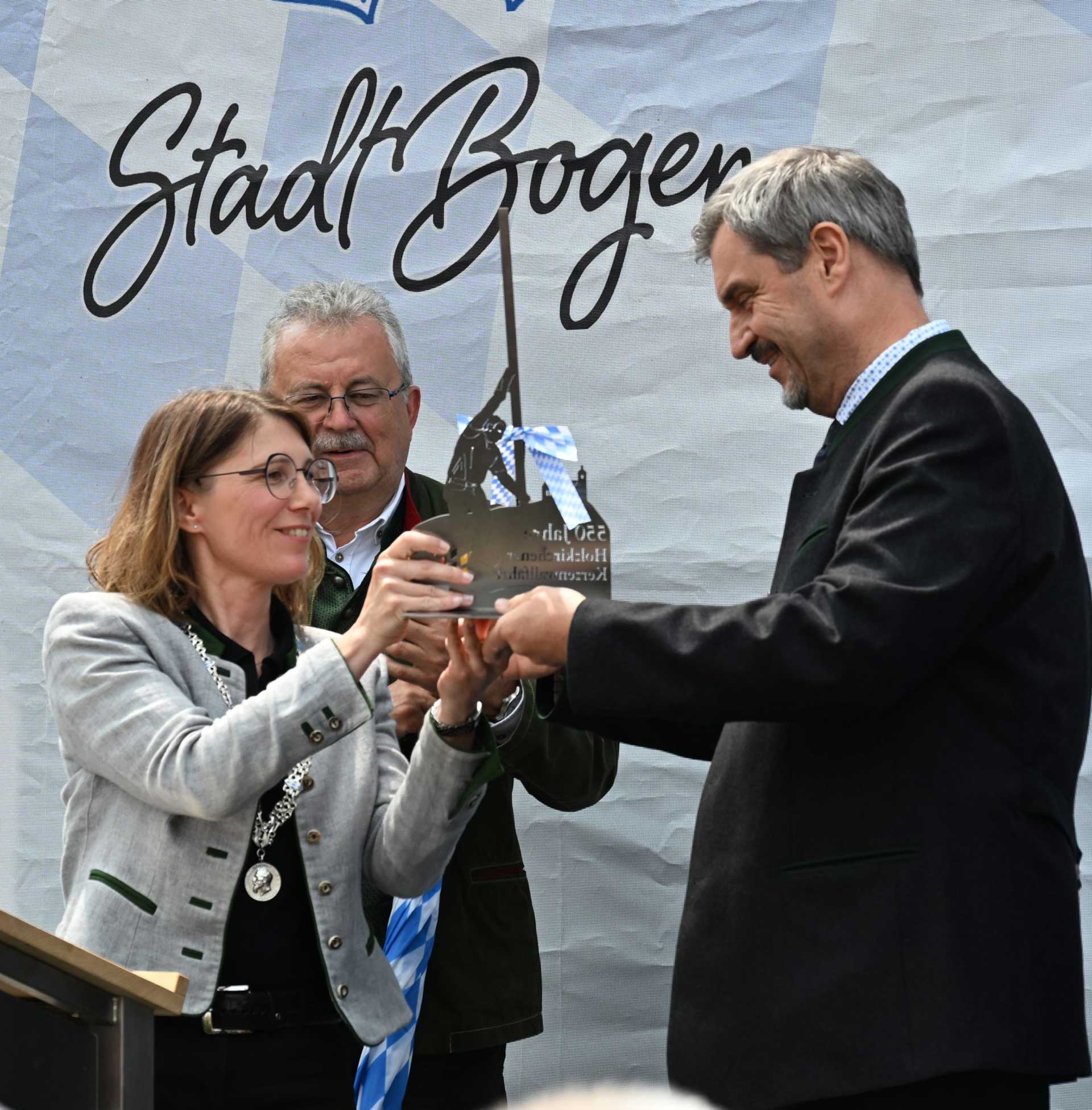 „Seit 550 Jahren bringen die Holzkirchner ‚die lange Stang‘ nach Bogen und zum Heiligen Berg Niederbayerns. Nur gemeinsam kann das geschafft werden“, betonte Bürgermeisterin Andrea Probst bei ihrer Begrüßung auf dem Stadtplatz von Bogen. Noch nie waren so viele Ehrengäste dabei wie 2025. Neben Diözesanbischof Dr. Rudolf Voderholzer, der das zweite Mal an der Holzkirchener Pfingstkerzenwallfahrt teilnahm, empfing auch Bayerns Ministerpräsident Markus Söder die Wallfahrer auf dem Stadtplatz in Bogen. In seinem Grußwort lobte er das Zeugnis des Glaubens unserer christlich-abendländischen Kultur, plädierte dafür, offen für den Glauben einzutreten und bekräftigte seine Zusage, dass in Bayern „keine Kreuze abgehängt werden oder der Religionsunterricht abgeschafft“ wird.