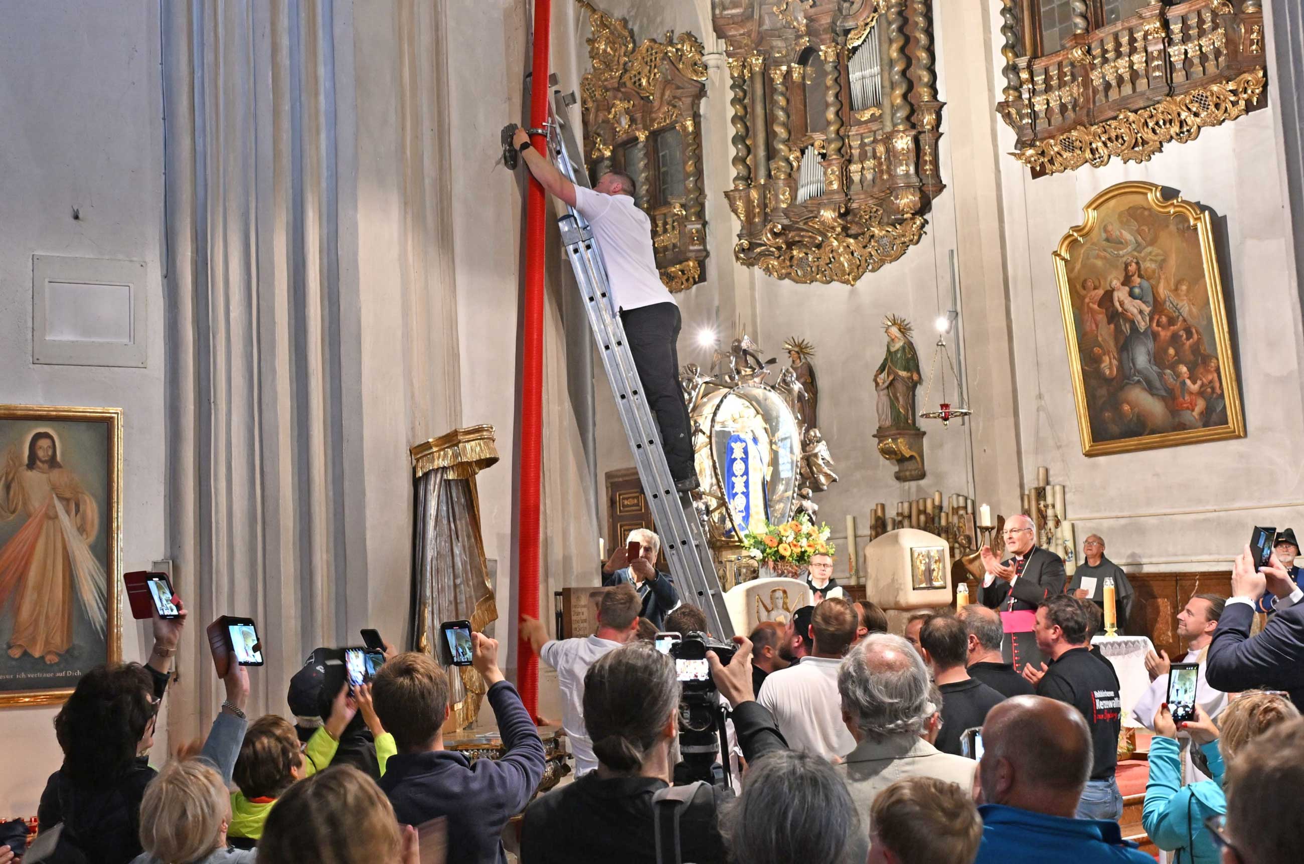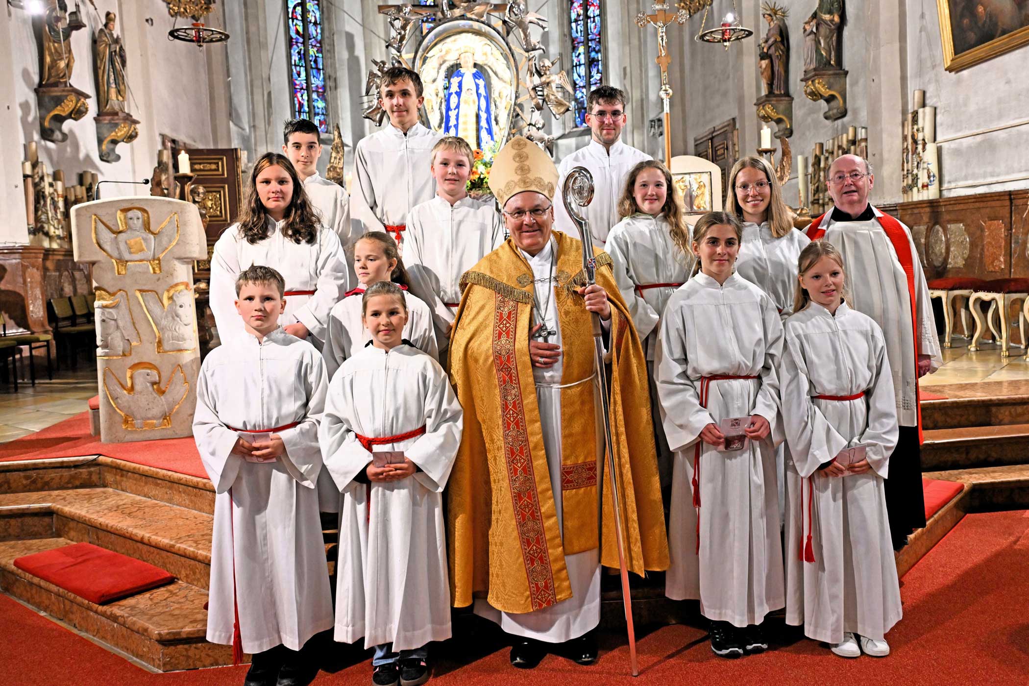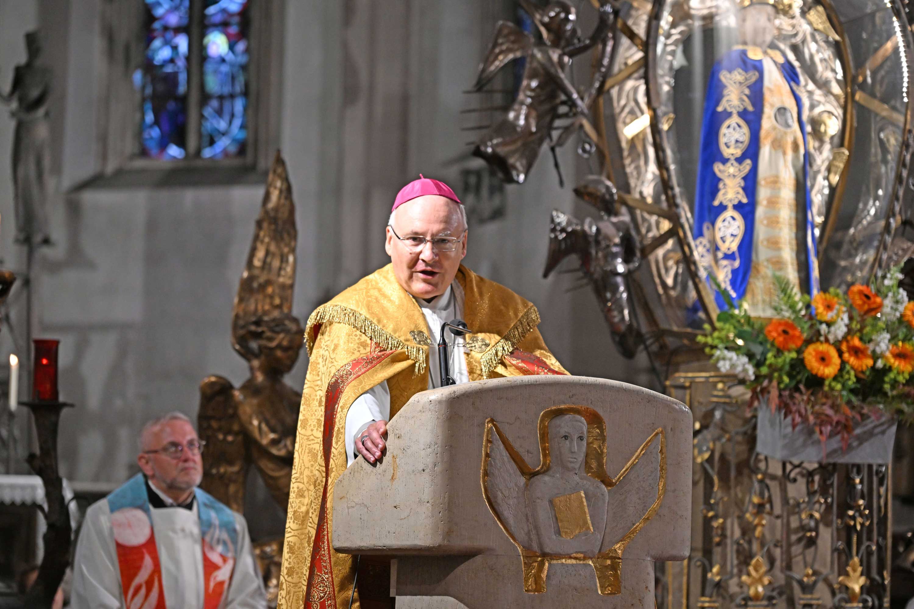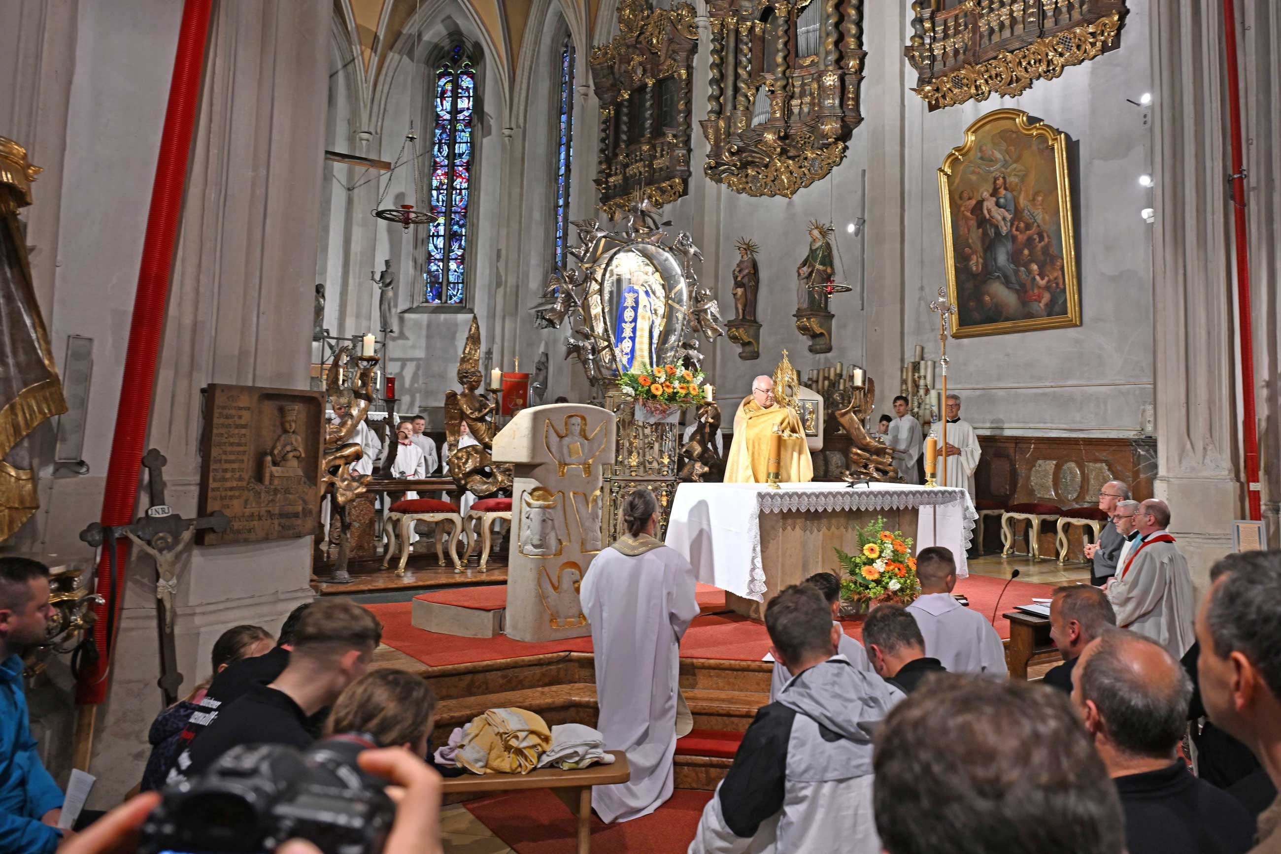 Wallfahrtspfarrer P. Witold erinnerte am Anfang der Dankandacht in der vollbesetzten Wallfahrtskirche an den Pilgerweg der Hoffnung. Das Heilige Jahr 2025 lade dazu ein, sich auf den Weg des Glaubens zu machen. Das 550jährige Jubiläum sei Grund zum Danken und zum Feiern. „Mit großer Erleichterung sind wir wieder da. Die Kerze steht an ihrem Ort und wir gratulieren zuerst einmal sehr herzlich den Kerzenträgern für das großartige Werk“, sagte Bischof Rudolf Voderholzer zu Beginn seiner Predigt. Er war den steilen Pilgerweg vom Stadtplatz zum Bogenberg hinter den Kerzenträgern mitgegangen und bezeichnete es als „Schauspiel der besonderen Art“. Heuer sei es ziemlich spannend gewesen: er habe mitgefiebert, mitgebetet und mitgezittert. Immer im Bewusstsein um die große Erfahrung und die Kraft der Kerzenträger. Er lobte den Teamgeist, bei dem sich jeder auf den anderen verlassen kann. Und das sei ansteckend. „Vergelts Gott“ auch dafür, so der Bischof. Danke sagte er auch für das Aufrechterhalten, das Lebendig halten dieser Tradition, nunmehr seit 550 Jahren.