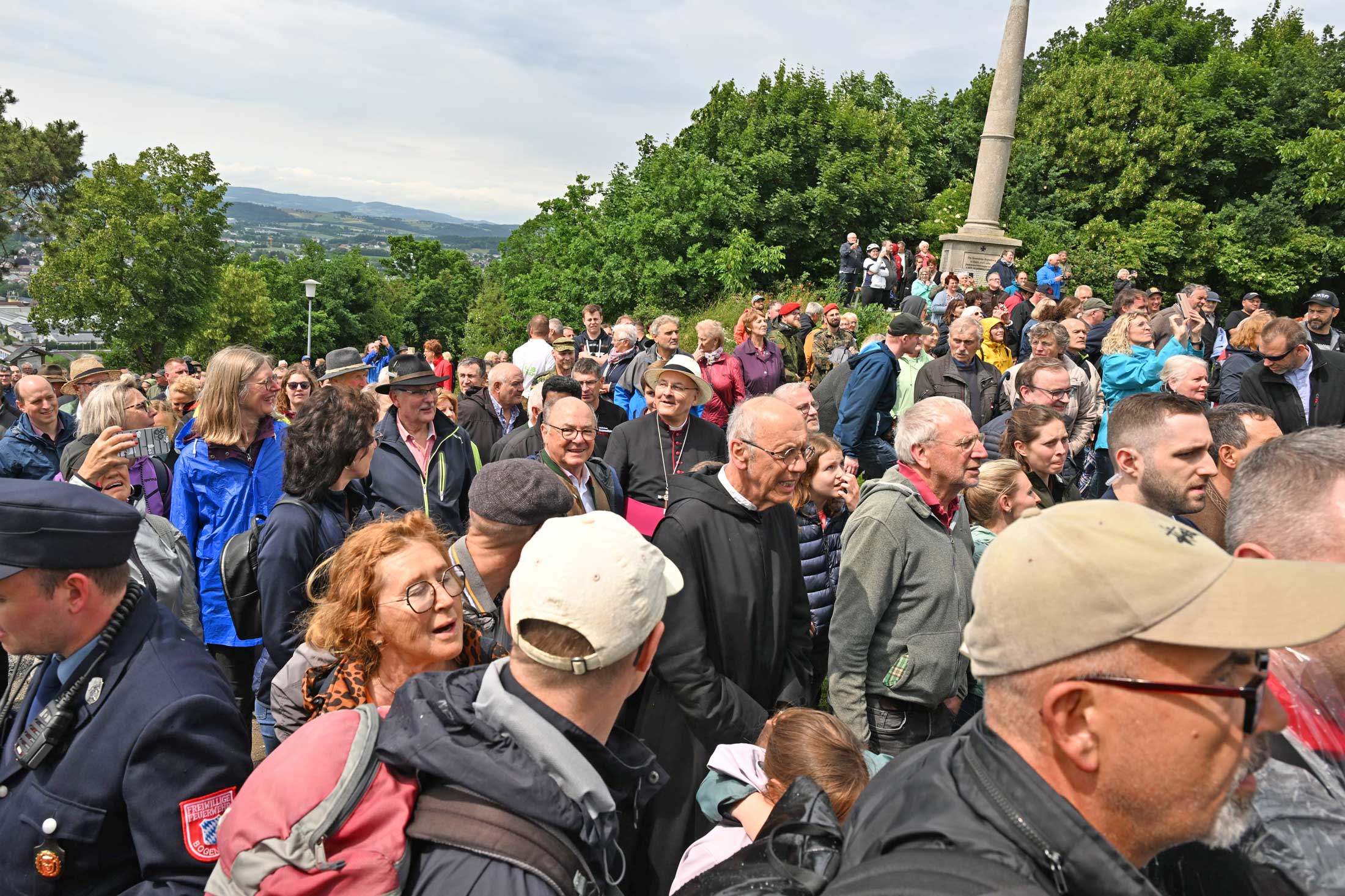 Im weiteren Verlauf der Predigt ging der Bischof auf das Pfingstfest ein, die Geburtsstunde der Kirche. Auch damals habe es sich um einen Wallfahrtstag gehandelt, denn aus der ganzen bekannten Welt seien die Menschen nach Jerusalem gepilgert. Sie durften die Ausgießung des Heiligen Geistes über die Jünger erfahren. Gerade in den südbayerischen Bistümern sei Pfingsten ein Wallfahrtsfest geblieben. Damit schlug der Bischof die Brücke zu den schönen Glaubenszeichen im Bistum mit der Altöttinger Fußwallfahrt aus Regensburg und Straubing. „Danke für dieses Beten mit den Füßen – und Danke für das Beten mit den Armen. Danke für das Beten auch mit dem heutigen Kraftakt“, sagte der Bischof. Pfingstlich gesprochen sei dies eine Sprache, die alle verstehen und er wünscht und betet, dass diese Sprache auch verstanden wird und dieses Glaubenszeugnis auch andere Menschen beeindruckt. Vermutlich frage sich auch so mancher, warum man diese Strapazen auf sich nimmt. Der Gang auf den Berg sei ja nur das „Sahnehäubchen“, der Wallfahrtsweg sei 75 Kilometer lang und die Pilger bereits unterwegs, wenn andere noch schlafen. Es sei ein Bekenntnis des Glaubens an die Wirkmächtigkeit im Namen Gottes. Am Ursprung steht die Erfahrung der Not und die Erfahrung, auf den Segen Gottes angewiesen zu sein. Hier erinnerte Bischof Rudolf an den Borkenkäfer, Seuchen und die Pest, aber auch an Corona. Gerade dies habe uns gezeigt, dass wir nicht alles im Griff haben. „Wir waren und sind auf Gottes Gnade angewiesen“ so der Bischof, der noch einmal für das öffentliche Zeugnis dankte, das auf den Segen des Dreifaltigen Gottes hinweist.