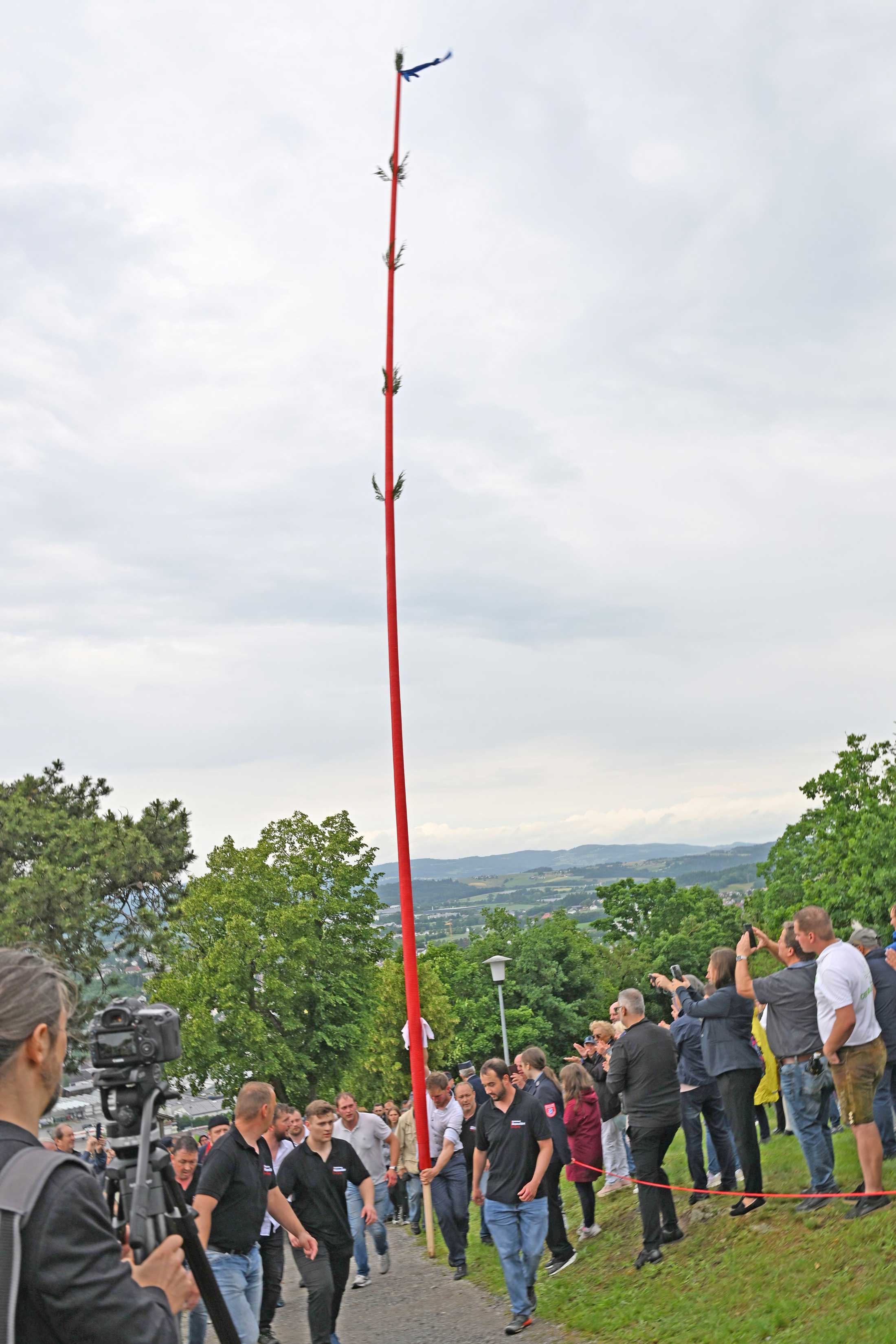 Der lange Wallfahrtszug formierte sich auf dem Stadtplatz: Zeremoniar Rudi Nowak, Blaskapelle, Kreuzträger, die Burschen der Degernbacher Katholischen Landjugend mit der Muttergottes und zahlreiche Pilger. Dazwischen die Lautsprecher und Vorbeter. Zwischen 10 und 15 kräftige Männer übernahmen ab dem „Edenhofer Haus“ über den Stadtplatz und dann den steilen Wallfahrtsweg hinauf abwechselnd die schwere Aufgabe des Tragens der Kerze. Sie sind dabei mit dem aufrechten Tragen der 13 Meter langen und rund 50 Kilogramm schweren Kerze enorm gefordert und wechseln sich immer wieder ab. Kräftige Sturmböen und starke Regenschauer erschwerten in diesem Jahr den Marsch zusätzlich. Bei der Wallfahrtskirche angelangt, wurde „die lange Stang“ einmal um das Gotteshaus herumgetragen, dann umgelegt und unter dem Applaus der Gottesdienstbesucher in der Kirche gegenüber der Kerze aus dem Vorjahr aufgestellt.