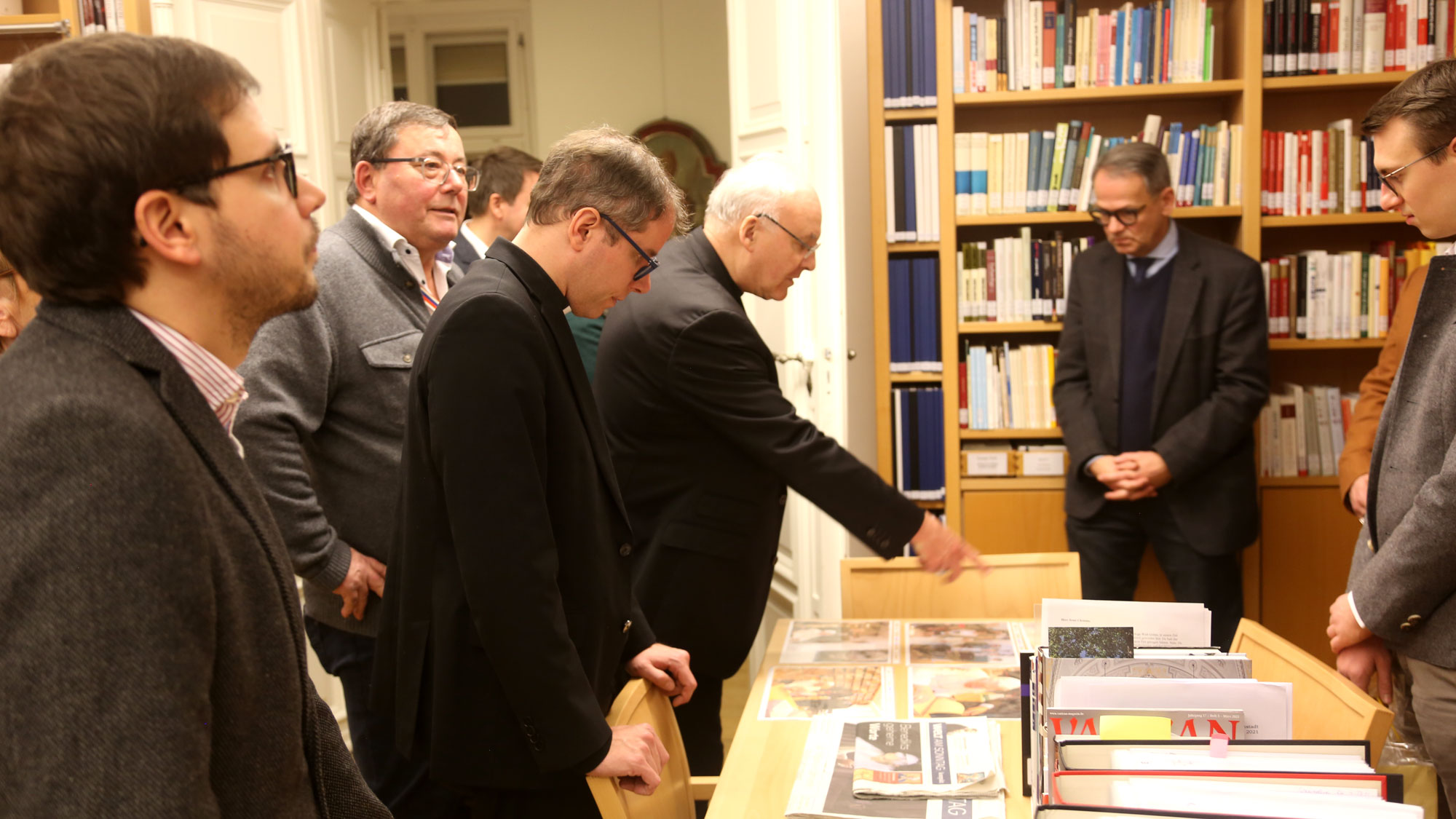 Zu Beginn des Instituts-Besuches durfte eine kleine Einführung in die bewegte Geschichte des Hauses nicht fehlen, vom iro-schottischen Benediktinerkloster zum Priesterseminar St. Wolfgang, das neben der Ausbildungsstätte für die Regensburger Diözesanpriester auch das Bischöfliche Studium Rudolphinum und eben das Institut Papst Benedikt XVI. beheimatet. Seit der Gründung 2008 steht Bischof Rudolf dem Institut als Direktor vor, bis 2012 noch als Dogmatik-Professor an der Trierer Universität. So konnte er der interessierten Zuhörerschaft von vielen Details der Entstehung und von der Arbeit der wissenschaftlichen Einrichtung berichten. Bilder-, Ton- und Filmdokumente vom Leben Joseph Ratzingers, die der wissenschaftliche Mitarbeiter Dr. Franz-Xaver Heibl zusammengestellt hatte, brachte den jungen und alten Ruperten ihr langjähriges Ehrenmitglied eindrucksvoll näher. Die älteren kannten ihn noch als Professor in Regensburg oder als Erzbischof von München-Freising. Neben zahlreichen Büchern von oder über Joseph Ratzinger, dazu unzählige theologische Fachliteratur, gab es auch Raritäten und Ausstellungsstücke zum Schmunzeln. Besonderes Augenmerk schenkten die Besucher jener Ausgabe der Bildzeitung vom 20. April 2005 - „Wir sind Papst!“ - die der damalige frischgebackene Trierer Professor Dr. Voderholzer morgens beim Bäcker in Kasel gekauft hatte oder drei verschiedene Varianten des Primizbildes des späteren Papstes. Modelleisenbahnfreunde schmunzelten beim Anblick des Ratzinger-Geburtshauses in Marktl am Inn als Bausatz.