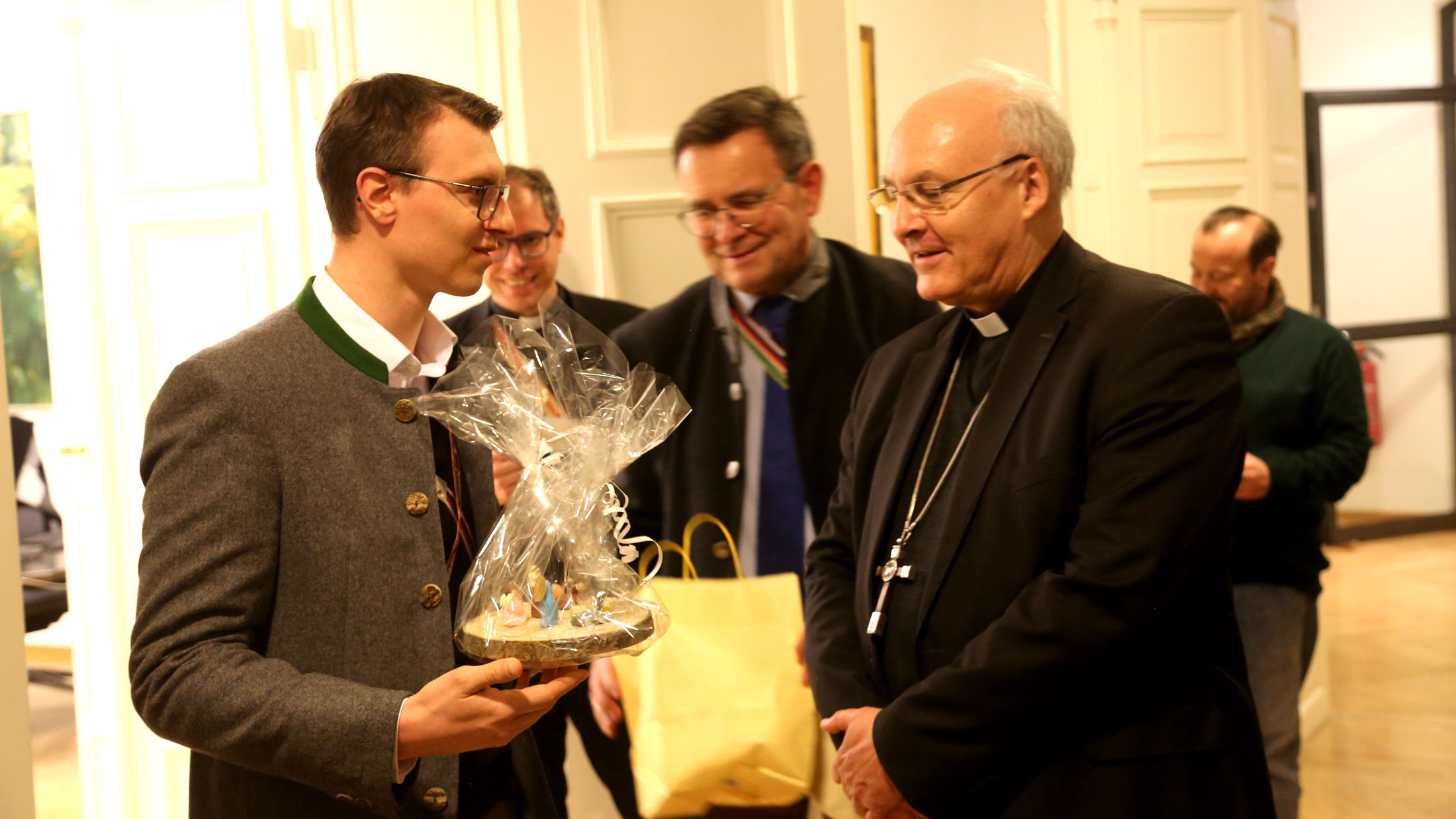 Unter den Ruperten waren auch einige Priester, die sich schon während des Studiums mit der Theologie Ratzingers beschäftigt hatten. Aber auch für Betriebswirte, Lehramtsstudenten oder Historiker wurde an diesem Tag ein ganz neues, vertieftes Bild des prominenten Ehrenmitgliedes gezeichnet. Da faszinierte das umfangreiche eigene theologische Werk Joseph Ratzingers genau so wie all das, was über ihn geschrieben wurde, von der Diplomarbeit bis hin zu Promotionen und Habilitationen. Als Dankeschön für diese anspruchsvolle Führung konnte Aktivensenior Joseph Mehler Bischof Rudolf ein weiteres Exponat für seine Krippensammlung schenken, eine Weihnachtskrippe von der Insel Mallorca, die eben nicht nur Ballermann zu bieten hat, sondern auch farbenfrohe Volkskunst. Wenn nun wieder bei der Rupertia von Joseph Ratzinger/ Papst Benedikt XVI. die Rede sein wird, dann haben junge wie alte Verbindungsmitglieder ein noch präziseres Bild von der theologischen Größe ihres Ehrenmitgliedes.