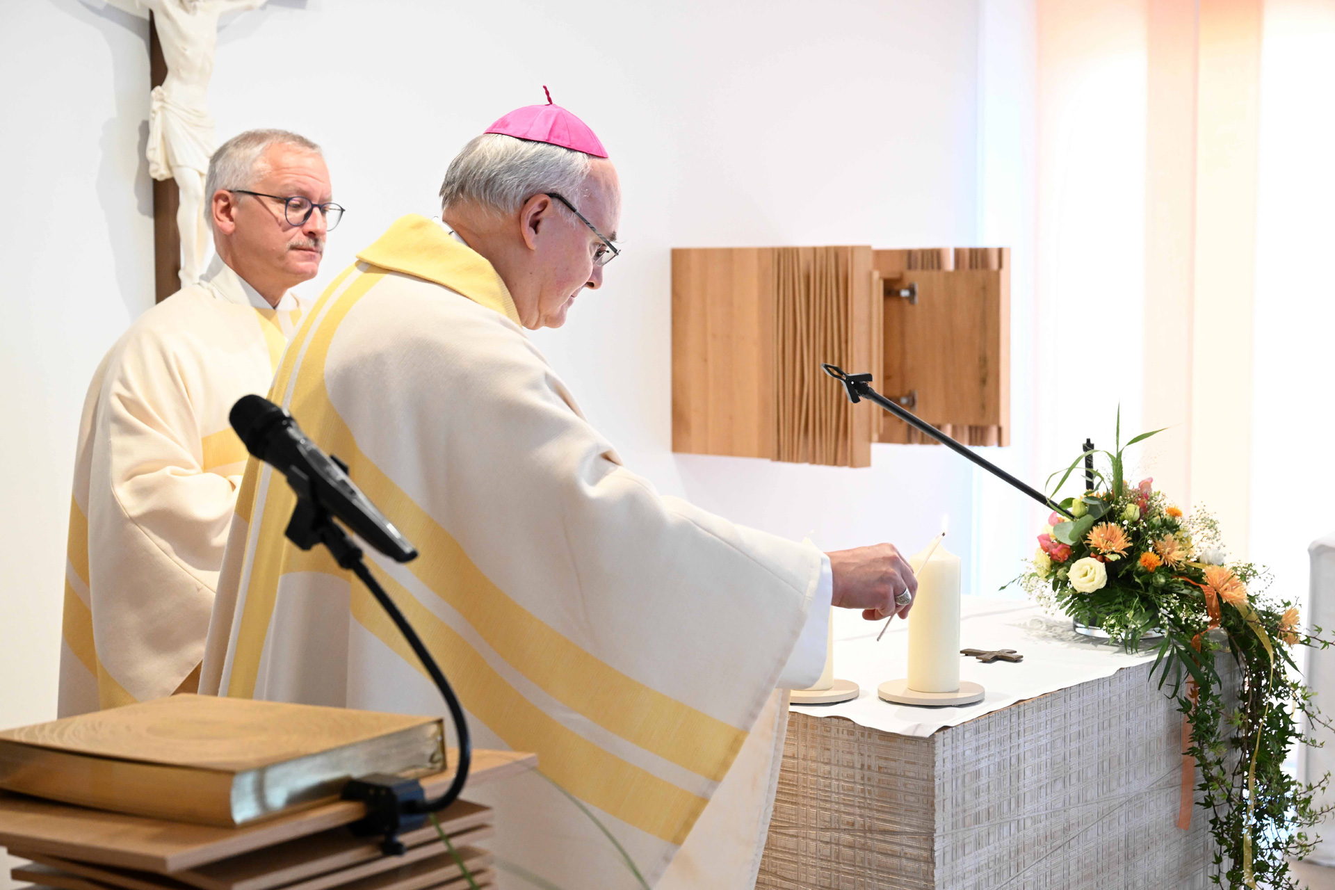 Nach der Segnungsfeier besuchte und segnete Diözesanbischof Dr. Rudolf Voderholzer die Pflegeoase, die beiden Stockwerke des Hermann-Grötsch-Hauses und die Wohnungen im Nachbarbau. Zur Feier waren die ehemaligen Heimleiter Michael Drindl und Heimleiterin Maria Seidl gekommen. Bürgermeister Josef Schindler und Landrätin Tanja Schweiger sprachen kurze Grußworte und überreichten Geschenke an die jetzige Heimleiterin Ricarda Hochmuth, die mit ihrem Team die Feier vorbereitet hatte. Auch die Bewohnerinnen und Bewohner wurden in die Segensfeier einbezogen. Sie durften nach der Segnung durch den Bischof den neuen Altar mit einem Tuch, einem Kreuz, Kerzen und einem Blumengesteck schmücken. Altar, Ambo und Tabernakel hat der Bildhauer Dominik Schleicher aus Fensterbach gestaltet. „Der Altar besteht komplett aus Eichenholz. Einzelne Kanthölzer bilden zusammen den Altarblock. Ihre Oberfläche ist an den Seiten geprägt von einzelnen Sägeschnitten, die sehr dicht aneinander und in verschiedenen Tiefen angeordnet sind. Dadurch entsteht eine lebhafte aber gleichzeitig schlichte Oberfläche, die sinnbildlich für das gelebte Leben eines einzelnen Menschen steht“, erklärte der anwesende Künstler sein eindrucksvolles Werk, „der Altar bildet ein festes Zentrum im Raum.“