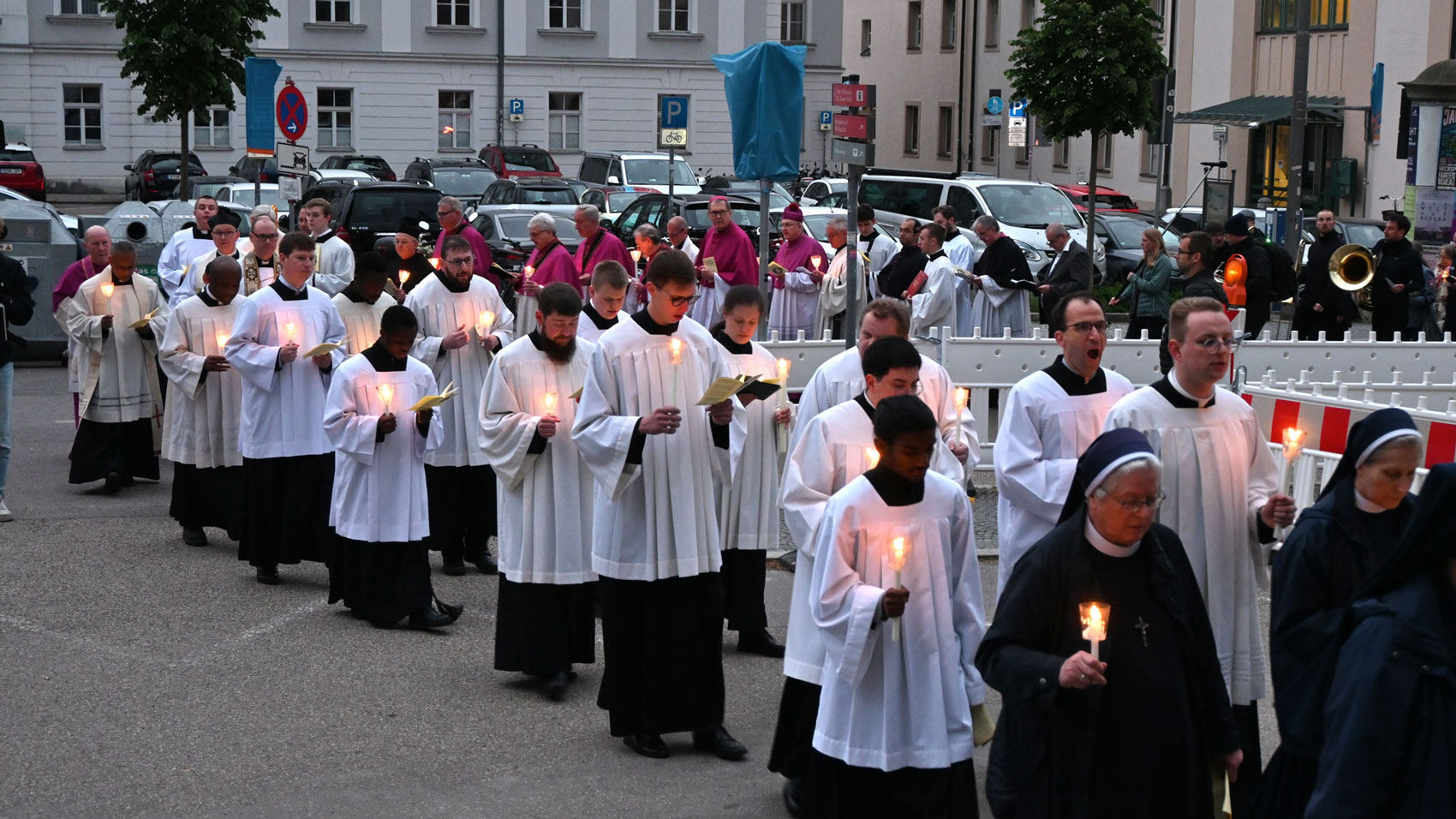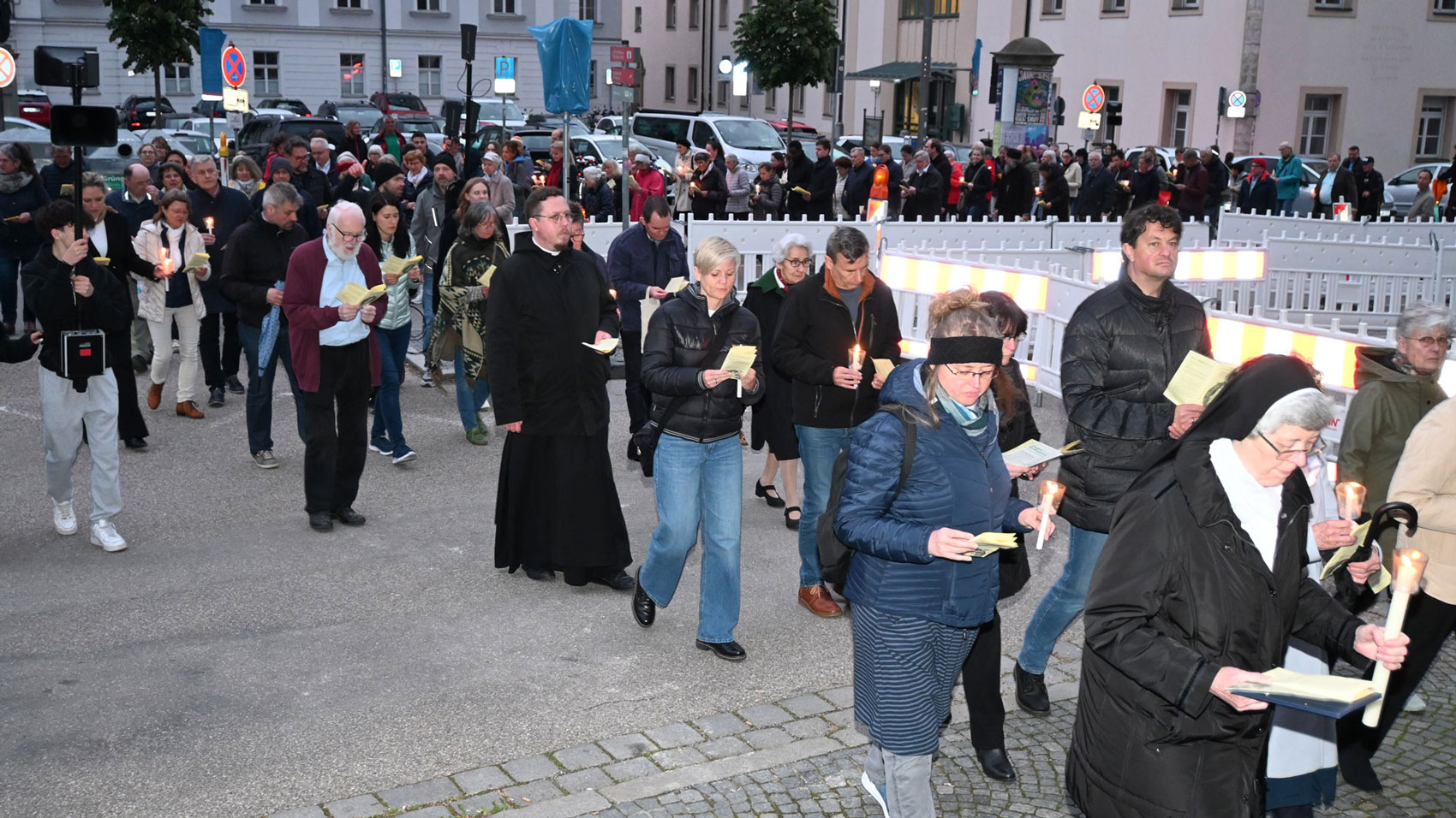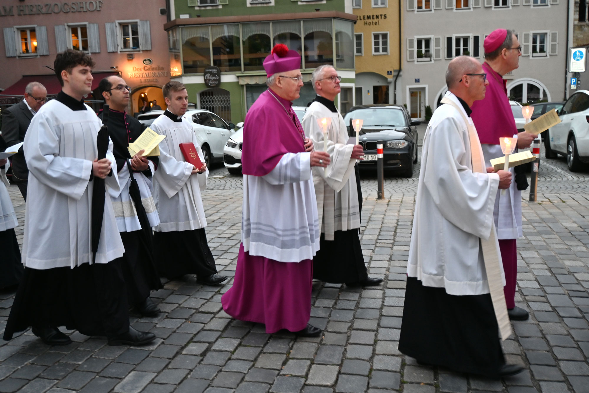 Schließlich erinnerte er in seiner Predigt an den in diesem Jahr begangenen 1100. Geburtstag des heiligen Wolfgang, der gleich zu Beginn seiner Amtszeit das Amt des Abtes von St. Emmeram vom Amt des Bischofs abkoppelte. Damit habe Wolfgang jedem der beiden Ämter sein eigenes seelsorgliches Profil gegeben. Und damit war Bischof Rudolf wieder bei der Bittprozession: „Wolfgang selbst bewegte sich gewissermaßen von St. Emmeram hierher in den Dombezirk. Wir gehen heute Abend den umgekehrten Weg, vom Dom nach St. Emmeram (…) sozusagen als Zeichen für ein Zurück zu den Quellen. Zurück zur Wiege des Bistums, Hinwendung zu den Ursprüngen und gesegneten Anfängen (…) In diesem Vertrauen dürfen wir heute Abend wieder die Flagge unseres Glaubens zeigen“, fasste der Oberhirte zusammen. Außerdem könne die Bittprozession Anlass sein, alle im Geiste mitzunehmen, ins Gebet einzuschließen und mit unserem Glauben und Gottvertrauen anzustecken.