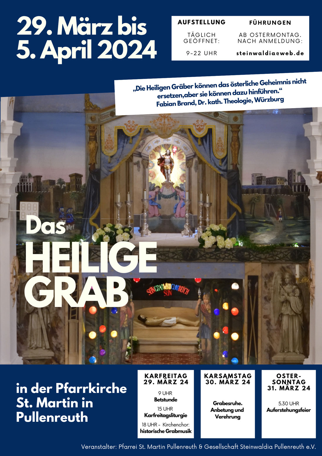 Das Heilige Grab ist von Karfreitag, den 29. März, bis zum 5. April in der Pfarrkirche St. Martin in Pullenreuth aufgebaut. Es kann in dieser Zeit täglich von 9 bis 22 Uhr besichtigt werden.