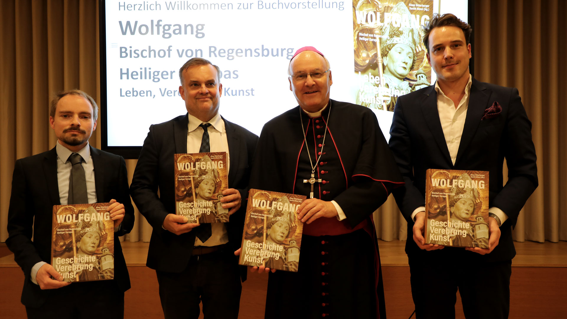 Im Jubiläumsjahr zum 1100. Geburtstags unseres Bistumspatrons, dem heiligen Wolfgang, konnte ein weiteres Buch aufgelegt werden. Prof. Dr. Klaus Unterburger und Dr. Daniel Rimsl, die als Herausgeber verantwortlich zeichnen, stellten das über 500-seitige Werk am Montagabend vor und überreichten an Diözesanbischof Dr. Rudolf Voderholzer ein erstes Exemplar. Der Band wurde im Regensburger Verlag Schnell & Steiner produziert.