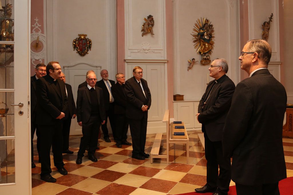 Heuer war es wieder soweit: Bischof Rudolf Voderholzer hat sich mit ehemaligen und verdienten Mitarbeitern getroffen. Als Dank für ihren Dienst an der Kirche hat er mit den neun Gästen eine Vesper in der Hauskapelle des Bischöflichen Ordinariats gefeiert. Im Anschluss an die Vesper waren alle zum Abendessen im Bischofshof eingeladen.