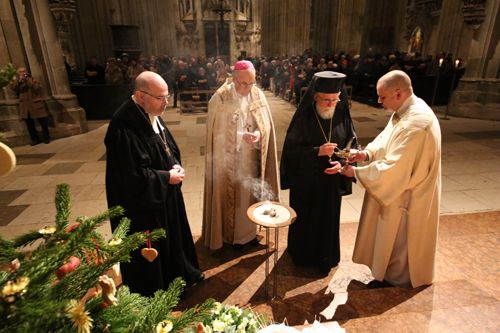 Bischof Rudolf Voderholzer, Bischof Vassilios von Aristi und Apostolos Malamoussis von der griechisch-orthodoxen Kirche und der evangelische Regionalbischof Hans-Martin Weiss haben am Sonntag eine ökumenische Vesper im Hohen Dom St. Peter in Regensburg gefeiert. Anschließend segneten sie von der Steinernen Brücke aus die Donau. Anlass des gemeinsamen Gottesdienstes war das Fest der Taufe des Herrn. Die musikalische Gestaltung lag bei den Regensburger Domspatzen und bei dem Byzantinischen Kantorenchor München.