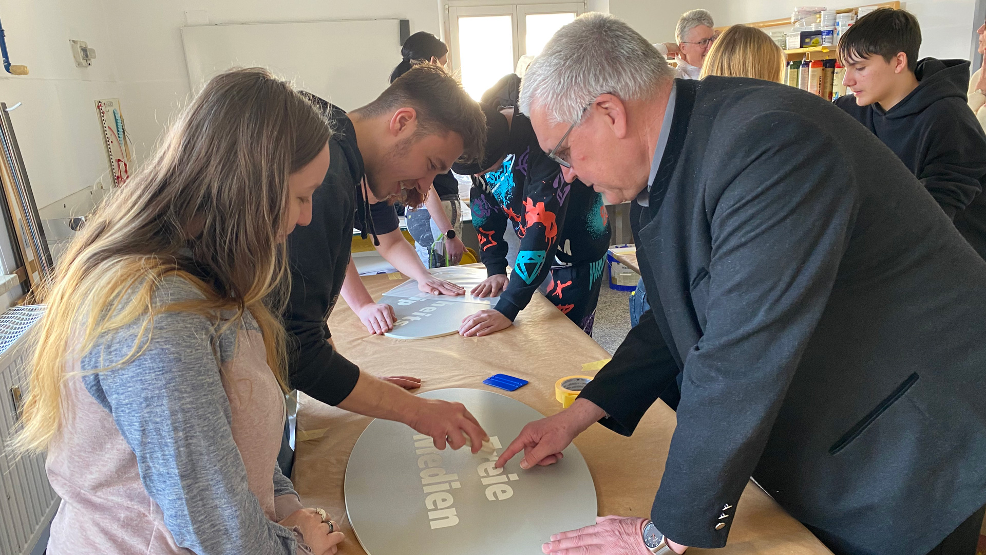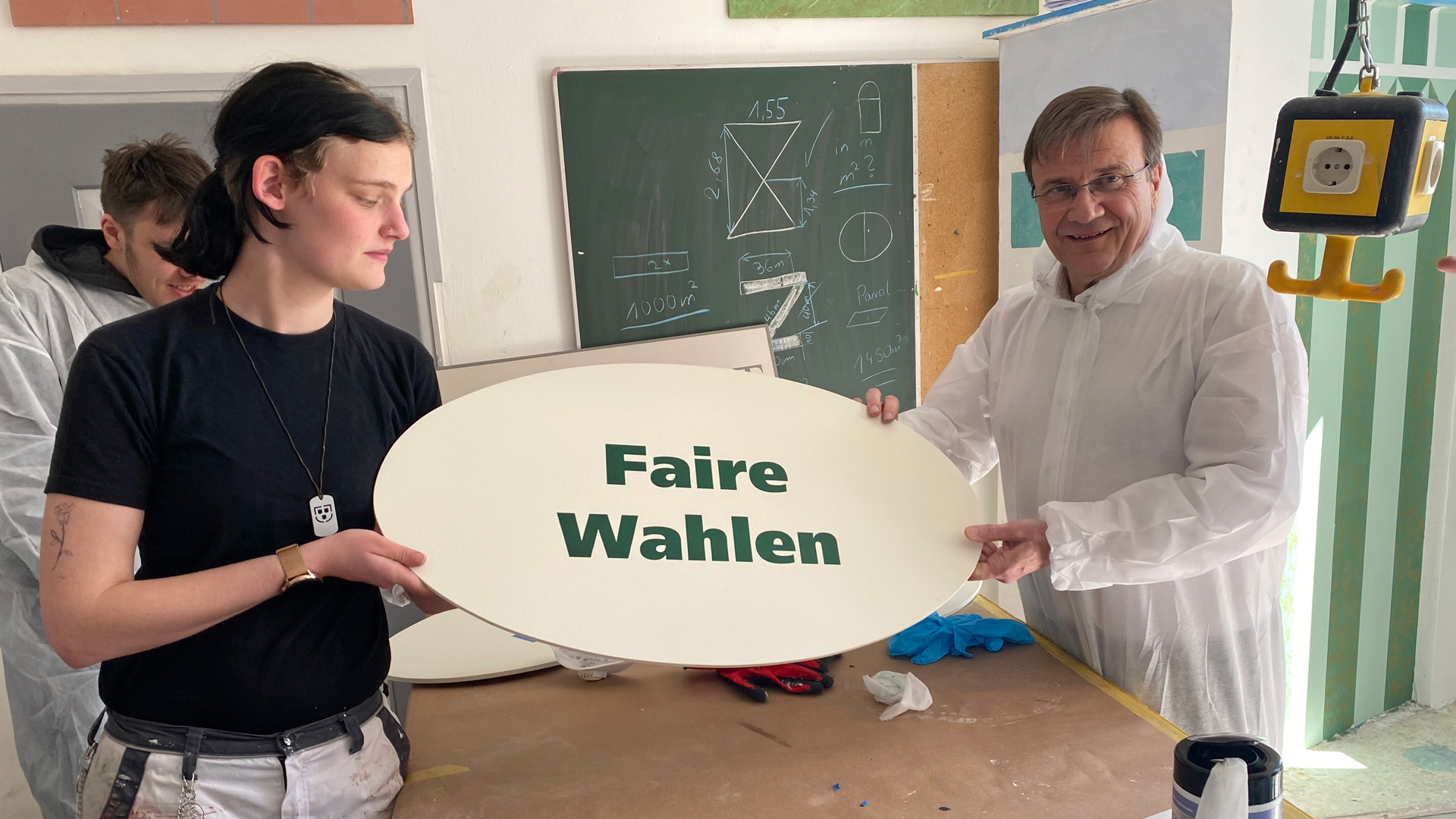 Anschließend ging es für die Gäste und die Mitglieder des Jugendparlaments in die Malerwerkstatt: Gemeinsam mit Berufsschulleiter Tobias Mandl und Einrichtungsleiterin Frauke Riegelsberger-Ganglmeier sprayten sie Demokratiebegriffe wie Wahlurne, Mehrheitsprinzip, faire Wahlen, freie Medien oder Meinungsfreiheit. Ausbilder Alexander Schwarzhuber hatte Schablonen und Schilder dazu vorbereitet und gab Tipps im Umgang mit der Spraydose. Die Schilder werden im großen Stucksaal im Haus des Guten Hirten ausgestellt.