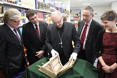 Dr. Rolf Griebel, Generaldirektor der Bayerischen Staatsbibliothek in München, hat am Donnerstagvormittag in der Staatlichen Bibliothek Regensburg ein Faksimile des Sakramentars Kaiser Heinrich II. an Dr. Bernhard Lübbers, den Leiter der Einrichtung, übergeben. Es besteht Gewissheit, dass das Sakramentar in St. Emmeram Regensburg angefertigt wurde. Es ist eine der bedeutendsten Handschriften des Mittelalters und wurde vom späteren Kaiser Heinrich II. in Auftrag gegeben. Das Original, das von unschätzbarem Wert ist, befindet sich in der Staatsbibliothek in München, wohin es 1803 in die Hofbibliothek verbracht worden war. Bischof Rudolf Voderholzer war während der Feierstunde anwesend und nahm – mit weißen Handschuhen versehen – die ca. vier Kilogramm wiegende imposante Nachbildung des geistlichen Werkes in Augenschein. Anhand der Angaben zum Heiligenkalender wurde festgestellt, dass bereits damals, im 11. Jahrhundert, der Festtag des heiligen Erhard auf dem 8. Januar lag.