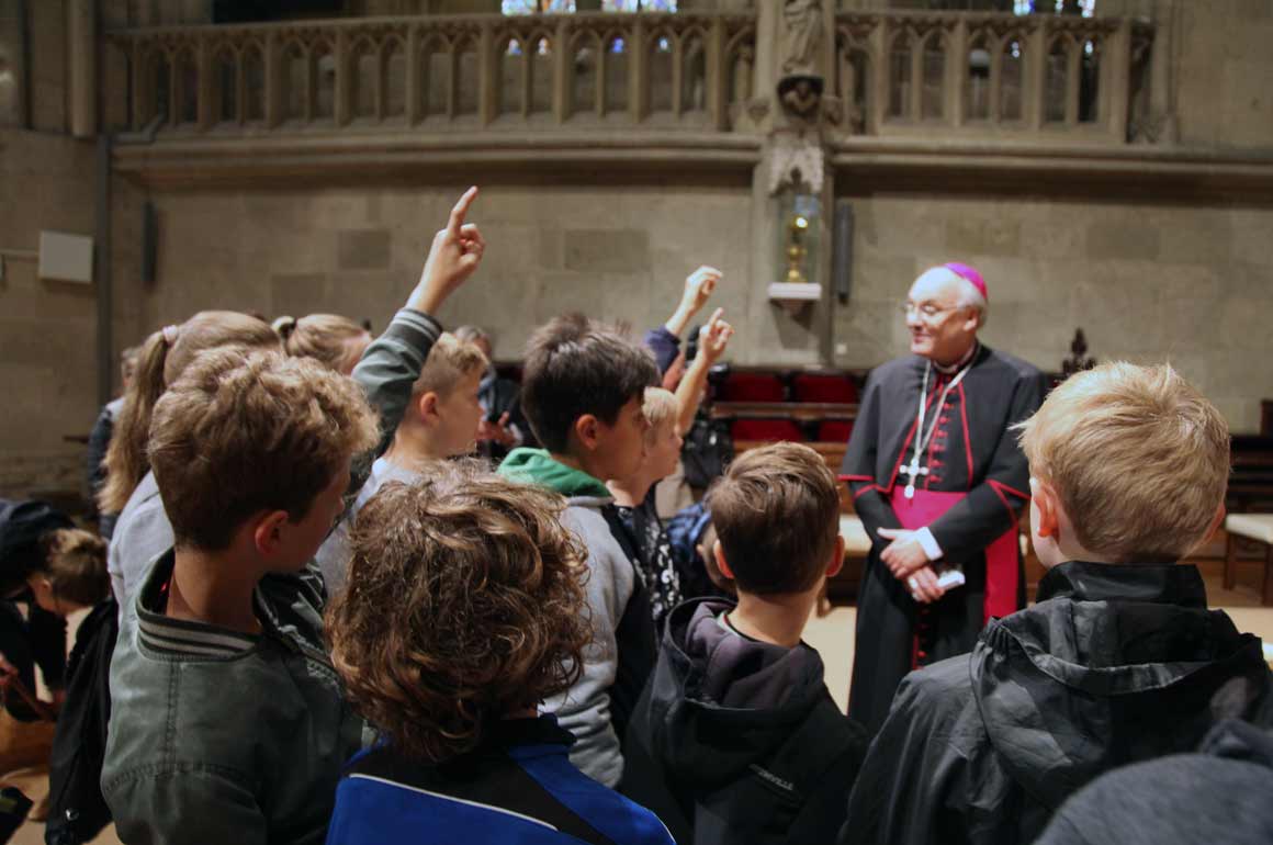 Viele Besucher kommen von weit her, um den lachenden Engel im Dom St. Peter zu sehen, den auch der Bischof bei seiner Domführung nicht ausgelassen hat. Hier hatten die Fünftklässler/-innen die Möglichkeit, Fragen an den Oberhirten zu richten: Der Lieblingsurlaubsort (Südtirol), Hobbies (Musik hören, Wandern, Sport machen), ob er denn Haustiere hat (nein) und der für ihn schönste Platz im Regensburger Dom (die Sailerkapelle). Dieser Lieblingsplatz stellte dann auch die letzte Station dar: In der Sailerkapelle fand die Führung mit einem Gebet ihren Abschluss. Als kleines Andenken überreichte Bischof Rudolf den Kindern noch einen Rosenkranz und ein Gedenkbild.