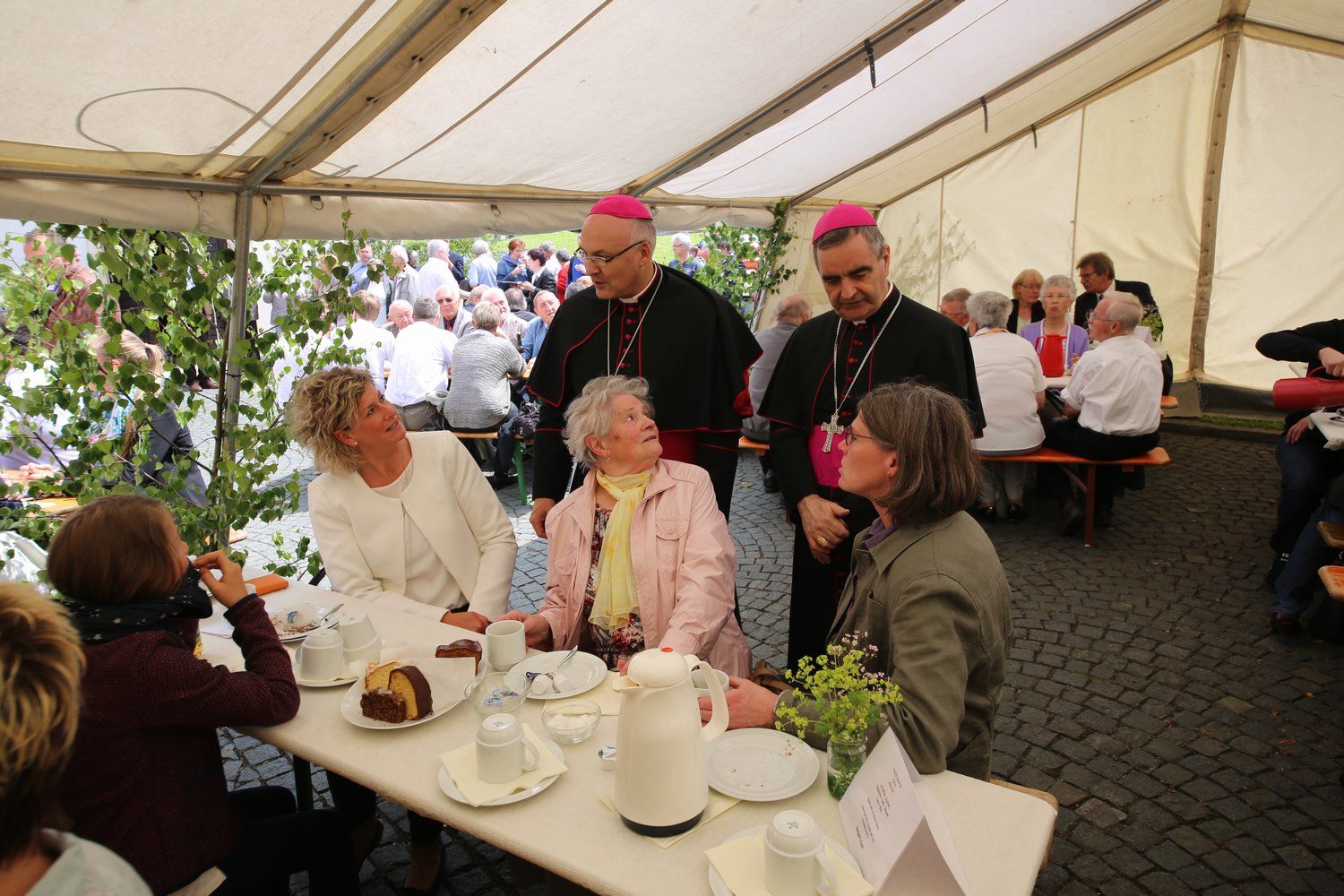 Nach dem Pontifikalamt fanden sich die Katholiken auf dem Kirchplatz zusammen, um mit den beiden Bischöfen ins Gespräch zu kommen. Der Schönwalder Bürgermeister Klaus Jaschke und Carsten Hentschel für den Rat der Stadt Selb betonten mit Ihren Grußworten die besondere Bedeutung des Anlasses. Pfarrgemeinderatssprecher Reinhard Frenzl bedankte sich mit Blumen bei Monika Spörl, die für die Organisation verantwortlich zeichnete. Zurecht möchte man meinen, wenn man die heitere und gesprächsintensive Stimmung des Treffens erleben durfte.