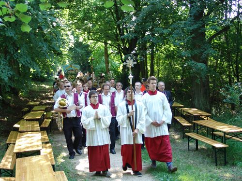 Autos aus München, Böblingen, Landshut und vielen anderen Orten stehen vor der Wallfahrtskirche auf den eigens gemähten Wiesen, weil die regulären Parkplätze an diesem Tag für die rund 500 Gläubigen nicht ausreichend sind. Tschechische Autos und Busse teilen sich den Platz unterhalb der Kirche St. Anna. Alle, die gut zu Fuß sind, reihen sich ein in die Prozession, die am Marktplatz in Planá beginnt. Auf diese letzten Kilometer schließt sich die Tirschenreuther Wallfahrtsgruppe an, die bereits seit dem Morgengrauen unterwegs ist, von der Grenze bei Mähring mit dem Ziel St. Anna.