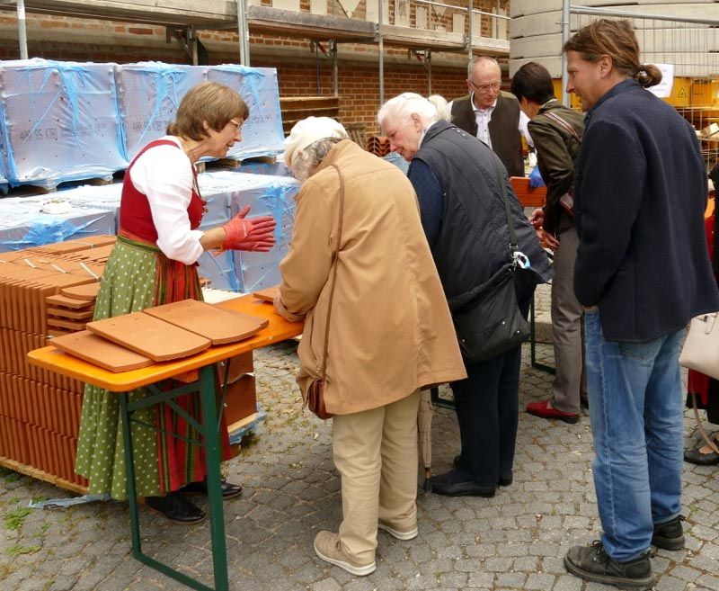 Nachdem nun monatelang im Inneren das Dachtragwerk nach den strengen Vorgaben des Denkmalschutzes saniert wurde, kann man nun auch von außen täglich den Baufortschritt beobachten. Und die Dingolfinger Bevölkerung nimmt regen Anteil daran. Aus diesem Grund wollte die Pfarrei allen Interessierten die Möglichkeit geben, ebenfalls ihre Spuren auf dem Dach der Pfarrkirche zu hinterlassen. Im Rahmen des Pfarrfestes am 24. Juni, dem Patrozinium von Johannes dem Täufer, konnte jeder mit Bleistift einen der neuen Dachziegel signieren. Material war genügend vorhanden, denn rund 40.000 Stück werden für die neue Eindeckung benötigt.
