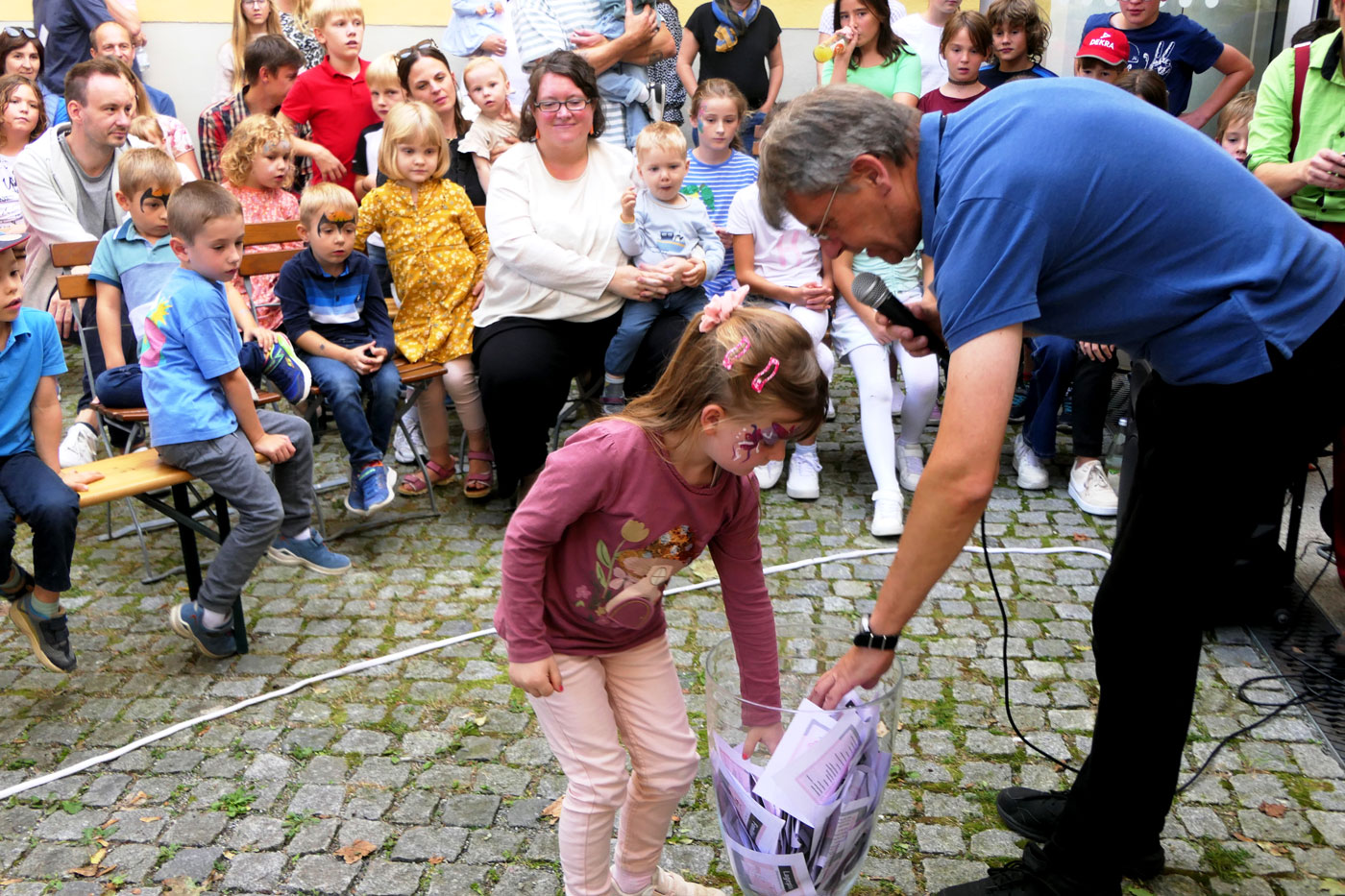 Bereits beim Gottesdienst waren die Kinder miteingebunden, übernahmen den Ministrantendienst und sprachen die Kyrierufe. Zum Vater Unser waren die Kinder rund um den Altar versammelt, um gemeinsam zu beten. Und auch die Lieder des Familienchores wurden eifrig aus dem Gottes Lob mitgesungen. Am Ende des Gottesdienstes bedankte sich der Geschäftsführer des Diözesankomitees Manfred Fürnrohr bei Domvikar Dr. Christian Schulz und dem Familienchor. Gleichzeitig gab er Hinweise, mit welchen Aktionsangeboten es weitergeht, wie man auf seiner Stempelkarte mit Namensfeld und Lageplan umgeht. Denn am Ende wartete eine Tombola. Und schon ging der bunte Nachmittag mit seinem vielfältigen Angeboten los. Viele stürmten die Hüpfburg im Innenhof. Aber auch die Outdoor-Spiele im Turmhof wurden begeistert angenommen. Ein Upcycling-Workshop der Jugendstelle lud ebenso zum Basteln ein, wie ein Jugendquiz der KSJ. Heiß umringt war das Angebot des Kinderschminkens durch die Jugend 2000. Holzkreuze konnten liebevoll und mit viel Kreativität beim Evangelisationswerk verziert werden. Informationen gab es durch die Kolpingsfamilie und verschiedene Mitmachangebote. Der Familienbund gestaltete eine Bistumsrallye und ein Escape-Room erinnerte an die 72h-Aktion.