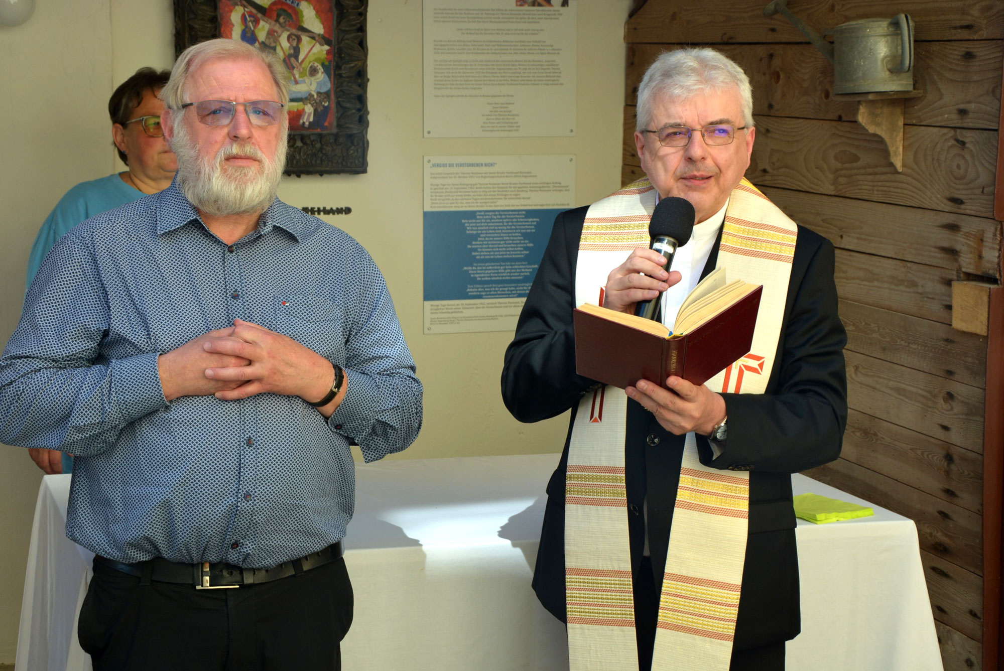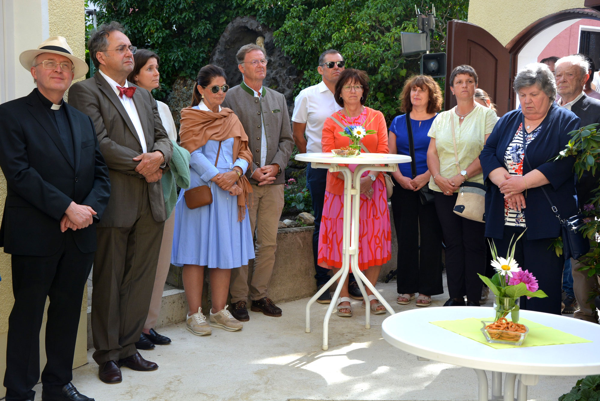 Im Anschluss ging es zum Reslhaus, wo im Innenhof des Hauses der kurze Festakt mit Segnung stattfand. Pater Benedikt Leitmayr berichtete, dass Reiner Haseloff, Ministerpräsident von Sachsen-Anhalt und ein erklärter Resl-Verehrer, gerne persönlich gekommen wäre, er jedoch terminlich verhindert ist. Bürgermeister Max Bindl freute sich, dass unser Denkmal und Wahrzeichen wieder für die Öffentlichkeit zugängig ist. Sein Dank galt den Fördergeldgebern, ohne die es nicht möglich gewesen wäre. „Wir stehen vor dem Beginn eines neuen Zeitabschnitts, hier treffen sich Menschen um neue Kraft zu schöpfen“. Architekt Nicolas Geißendörfer vom Planungsbüro Plaß, sagte, „Wir beschäftigen uns seit 2020 mit dem Bauwerk. Ausführlich gewährte der Architekt Einblicke in die Planungen und Bauausführung und sprach von einem Einzeldenkmal. „Das Bauwerk von einst ist bis heute unverändert, insbesondere die Wohnbereiche der Therese Neumann und von Pfarrer Joseph Naber. „Wir durften nichts verändern, wichtig war uns, das Gebäude nachhaltig zu erhalten. Was wir hier gemacht haben, war schlichtweg erforderlich“. Domkapitular Dr. Josef Kreiml überbrachte zunächst die Grüße von Diözesanbischof Dr. Rudolf Voderholzer und skizzierte kurz das Leben der Resl, das am 8. April 1898 in diesem Haus begann und am 18. September 1962 hier endete. Ausdrücklich wies Dr. Kreiml auf die Verbindung zu Therese von Lisieux - ihr zur Ehren haben die Konnersreuther vor dem Geburtshaus der Resl einen Brunnen gestiftet. „Menschen aus aller Welt kommen nach Konnersreuth“, sagte der Domkapitular. Er zeigte sich überzeugt, „dass zu gegebener Zeit entschieden wird, wie der Prozess zur Seligsprechung verläuft“. Abschließend wünschte der Domkapitular, dass das Reslhaus ein Ort wird, wo sich Menschen begegnen und sich auch mit der Resl beschäftigen“. Im Anschluss erteilte Dr. Josef Kreiml dem sanierten Bauwerk den kirchlichen Segen. Gemeinsam mit Pater Benedikt Leitmayr ging es im Anschluss durch das Haus, hier segnete er jeden einzelnen Raum. Unter den Gästen fand sich auch der ehemalige BR-Moderator Toni Siegert, einer der wichtigsten Mitglieder der Historischen Kommission zur Seligsprechung. Siegert zeigte sich einmal mehr optimistisch, was den Ausgang des Seligsprechungsprozesses betrifft. Am Nachmittag führte Pater Benedikt Leitmayr Interessierte durch das Haus und erklärte die umfangreiche Sanierung. Nach dem Festakt ging es zum Konnersreuther Pfarrfest, wo bereits die Konnersreuther Blaskapelle kräftig aufspielte. Bis zum Abend hinein wurde miteinander gefeiert.
