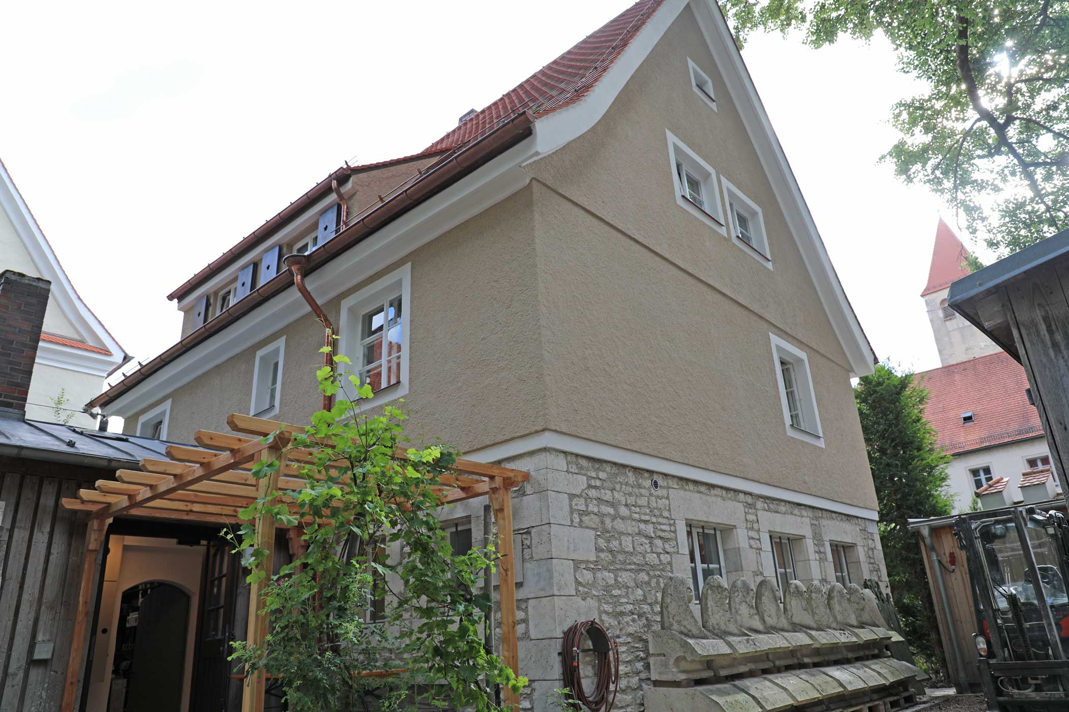 Mit Gründung der Staatlichen Dombauhütte Regensburg im November 1923 begannen die Planungen für die Erstellung eines Büro- und Werkstattgebäudes im Domgarten. Im Herbst 1924 starteten die Bauarbeiten, bereits im darauffolgenden Jahr konnten die Räumlichkeiten in Betrieb genommen werden. Seit knapp 100 Jahren sind diese nun in durchgehender Nutzung. Anfang der 1940er Jahre wurden das erste Mal Umbauarbeiten am Bürohaus vorgenommen. Die erste Etage und der bis dahin als Reißboden genutzte Dachraum wurden in Wohnraum umgewandelt, zur Nutzung für den im Krieg ausgebombten Hüttenmeister Josef Zentner. Auch der folgende Hüttenmeister Richard Triebe nutzte das Haus der Dombauhütte als Wohnung. Als 1986 Helmut Stuhlfelder die Leitung der Dombauhütte übernahm, wurden die Räumlichkeiten renoviert und wieder der ursprünglichen Nutzung zugeführt. Das Werkstattgebäude wurde zu dieser Zeit rückgebaut und durch einen Neubau ersetzt.