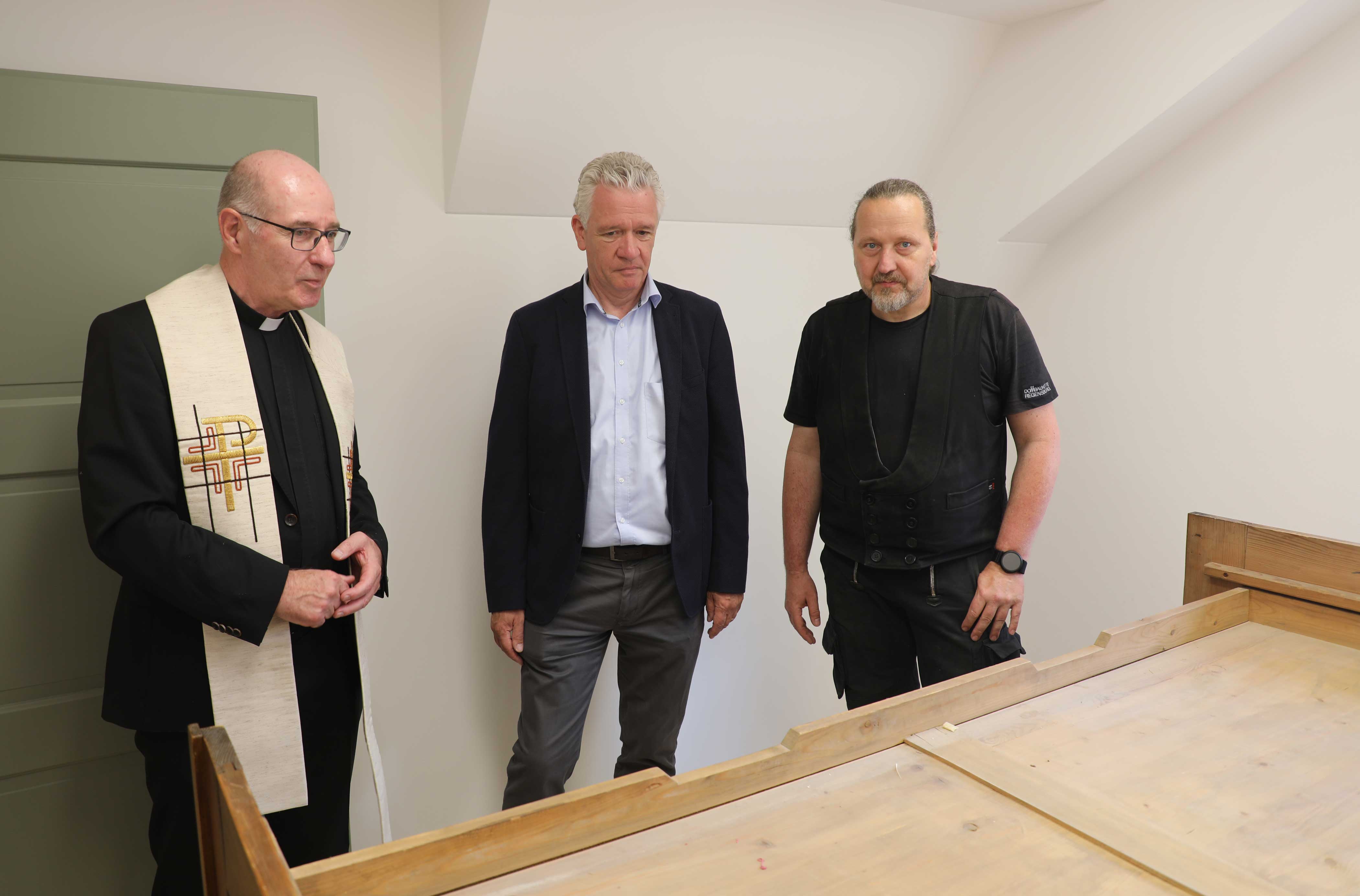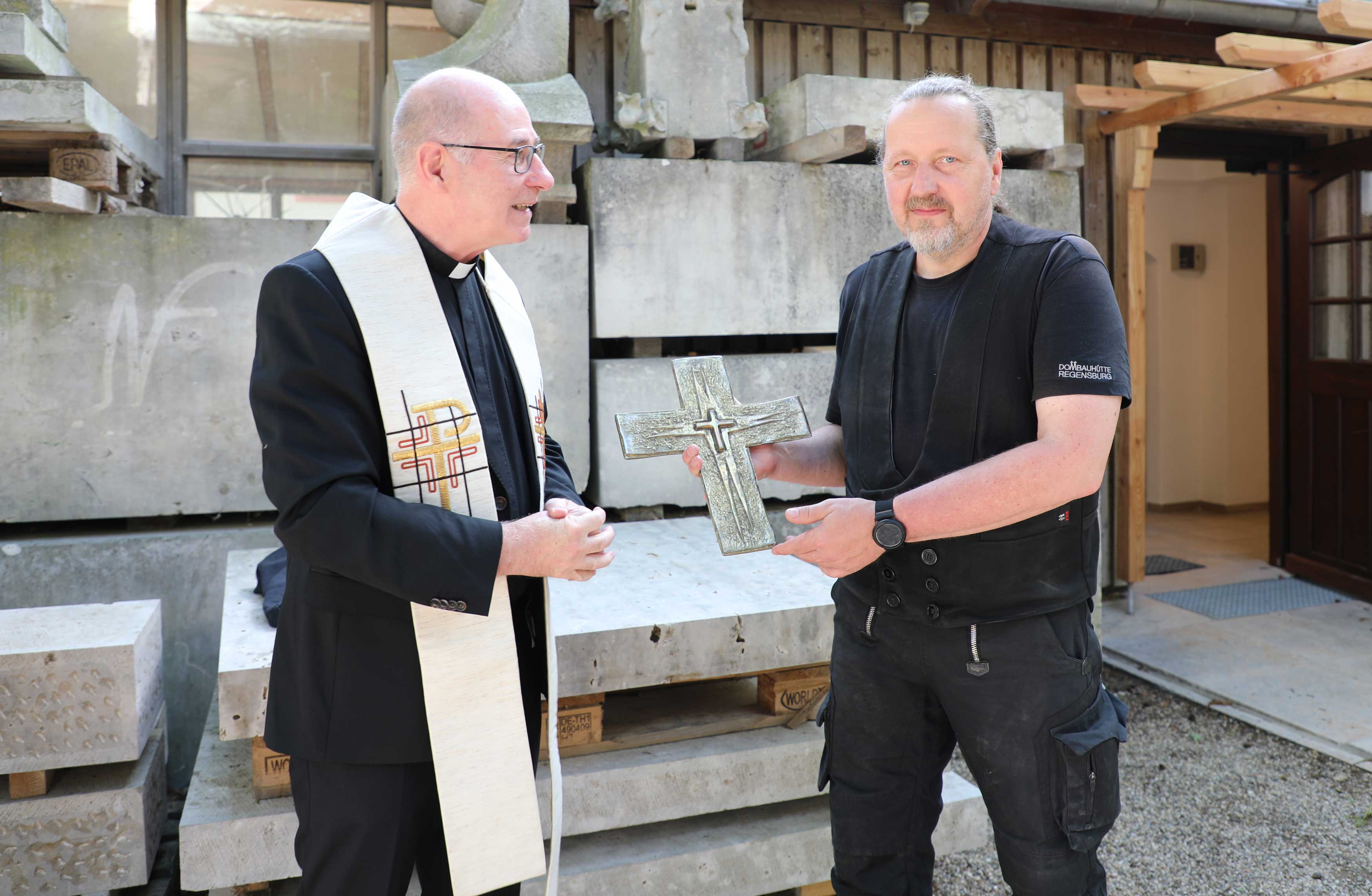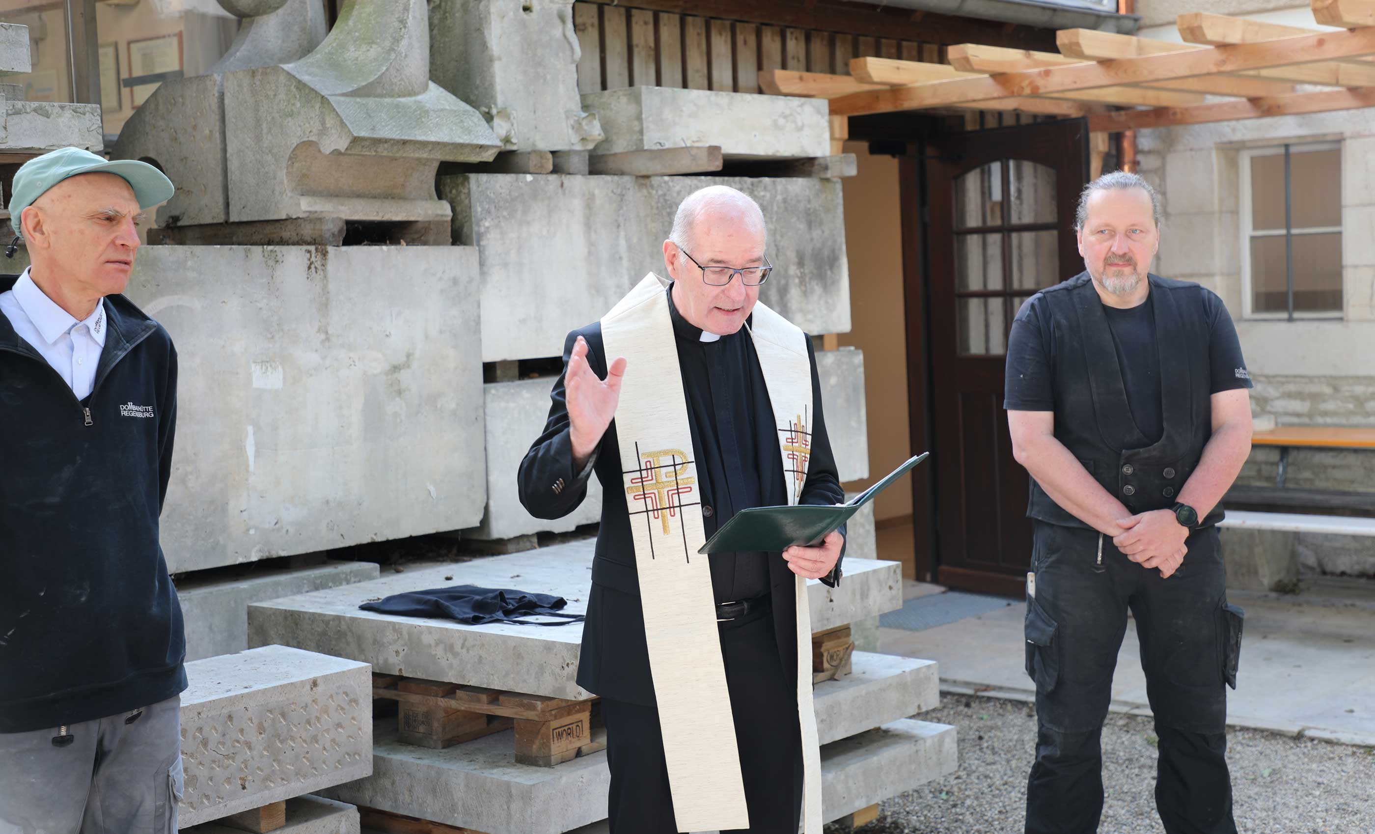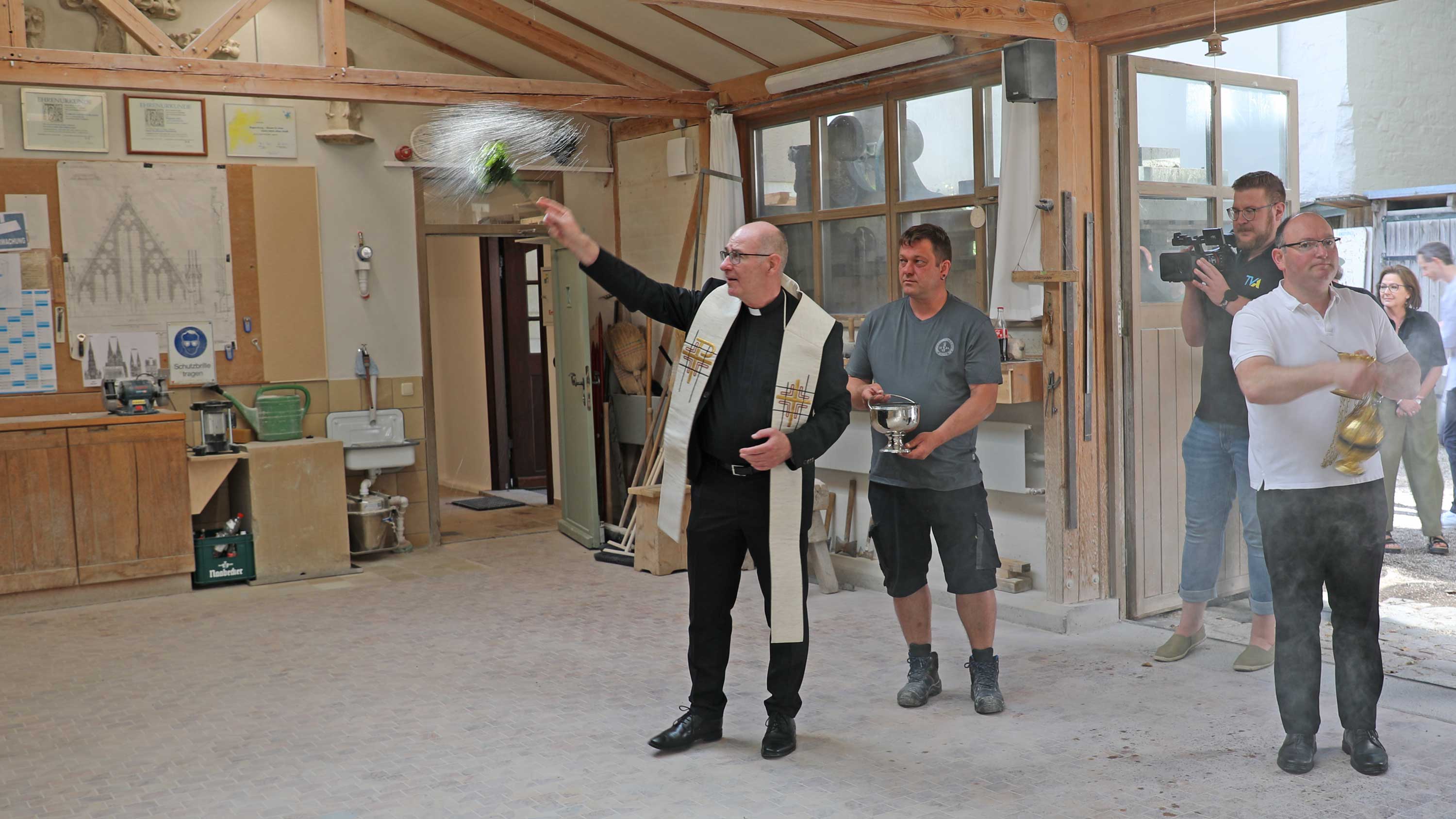 Dompropst Dr. Franz Frühmorgen segnet Staatliche Dombauhütte Regensburg nach abgeschlossener Sanierung