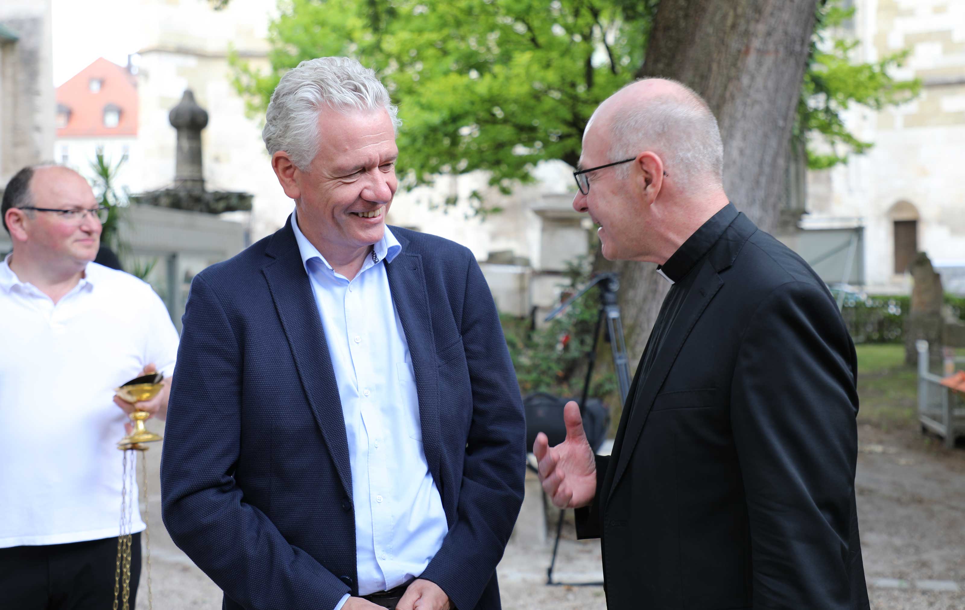 „Das ganze Jahr über seid Ihr am Ausbessern, Sichern und Erneuern an unserem Dom. Eine Baustelle, die nie an ein Ende kommt. Danke, dass wir Euch als Fachleute am Dom haben und dass Ihr mit so viel Sorgfalt das größte und bedeutendste Gotteshaus in Regensburg zusammenhaltet“, so Dompropst Dr. Franz Frühmorgen an die männlichen und weiblichen Steinmetze der Dombauhütte gewandt. Und weiter: „Heute wollen wir den Segen auf die sanierten Räume herabrufen und – wie der Hüttenmeister Matthias Baumüller immer mit einem Augenzwinkern sagt – ‚wenn es wie nach der letzten Sanierung vor 40 Jahren wieder genauso lange hält, wäre gut!‘“, so der Dompropst, der gleichzeitig versprach, sein Bestes zu geben, damit genügend Weihrauch und Weihwasser in alle Ritzen der sanierten Räume eindringen möge.