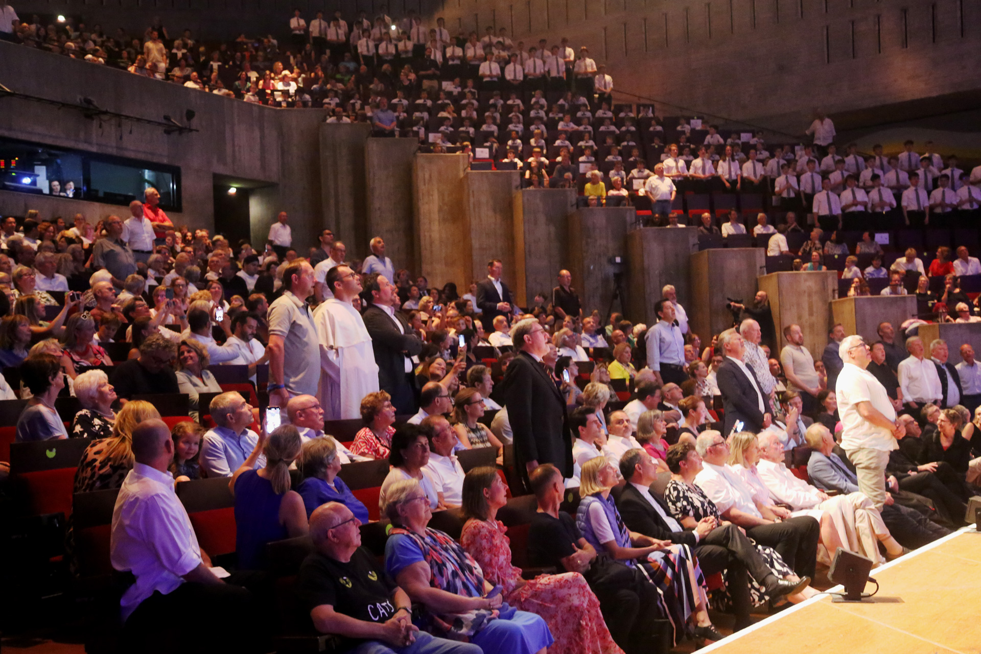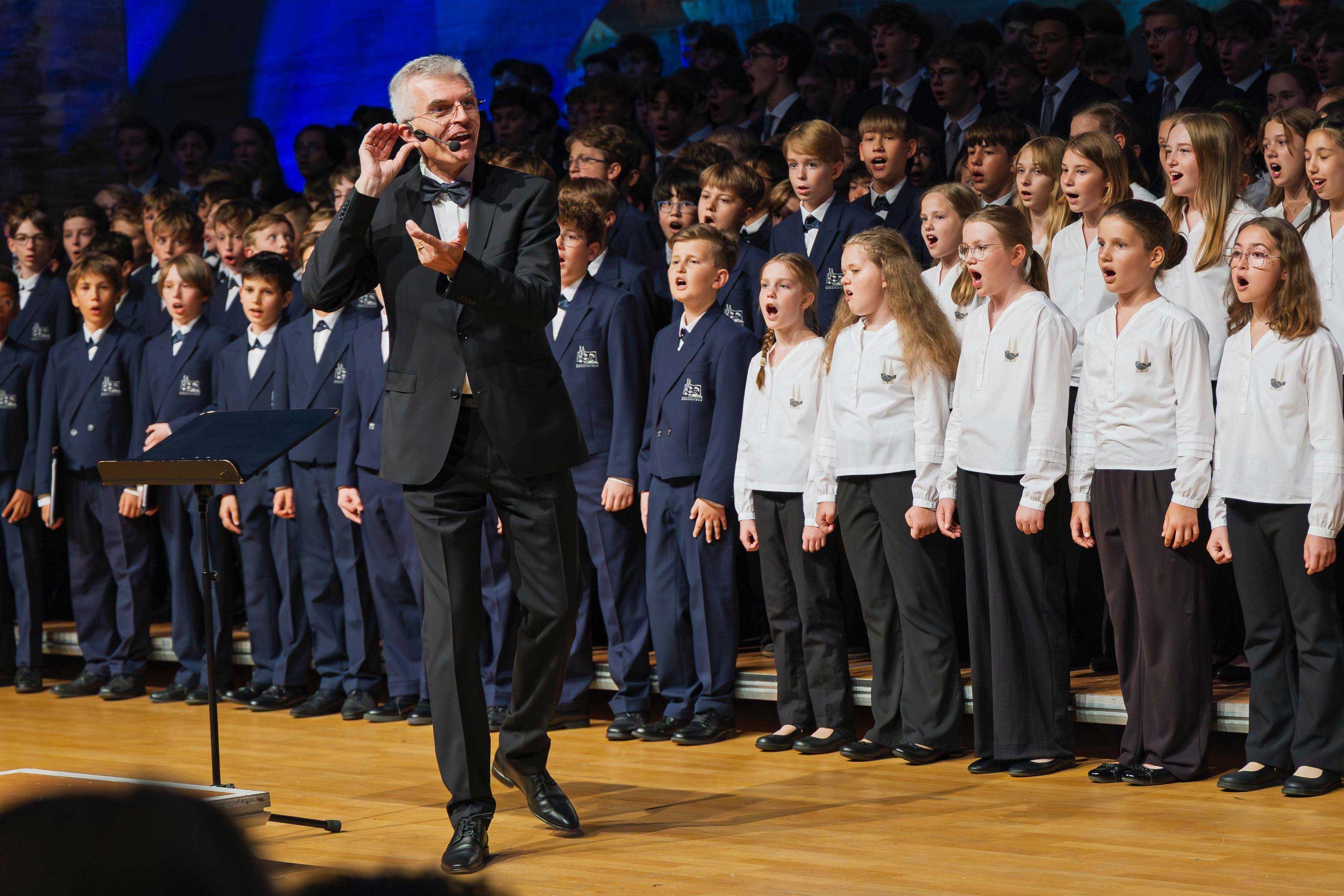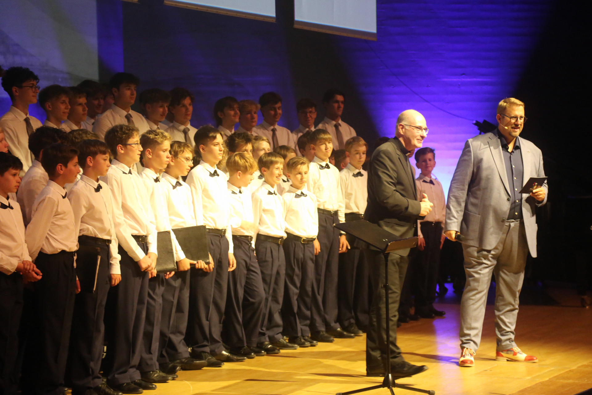 Ob der hl. Bischof Wolfgang von Regensburg 975 ahnte, als er die Domschule zur Ausbildung von Kleriker-Nachwuchs gründete, dass damit der Startschuss für ein bewegtes Kapitel der Musikgeschichte gegeben wurde? Bis zum September 2022 hätte man von der „ältesten Boygroup der Welt“ sprechen können. Dann wurde der Mädchenchor der Regensburger Domspatzen gegründet, mit der wieder ein neues Kapitel geschrieben wird. Bischof Dr. Rudolf Voderholzer, Generalvikar Msgr. Dr. Roland Batz und Dompropst Prälat Dr. Franz Frühmorgen sowie weitere Mitglieder des Domkapitels waren unter den über 1.000 Besucherinnen und Besuchern des großen Jubiläumskonzertes am Samstagabend im Audimax der Universität Regensburg. Zahlreiche Eltern, ehemalige Domspatzen und Förderer des Regensburger Traditionschores waren ebenfalls der Einladung gefolgt, um das 1050-Jubliläum zu feiern. Durch den Abend führten wortgewandt Clemens Prokop, langjähriger Berater in allen Fragen der Inszenierung, und Marcus Weigl, Leiter Kommunikation & Marketing bei den Domspatzen.