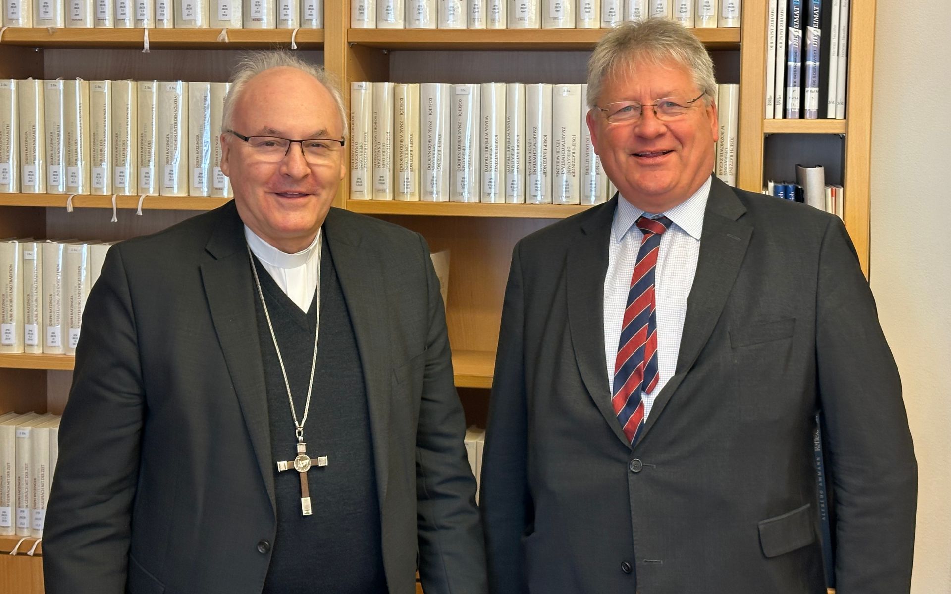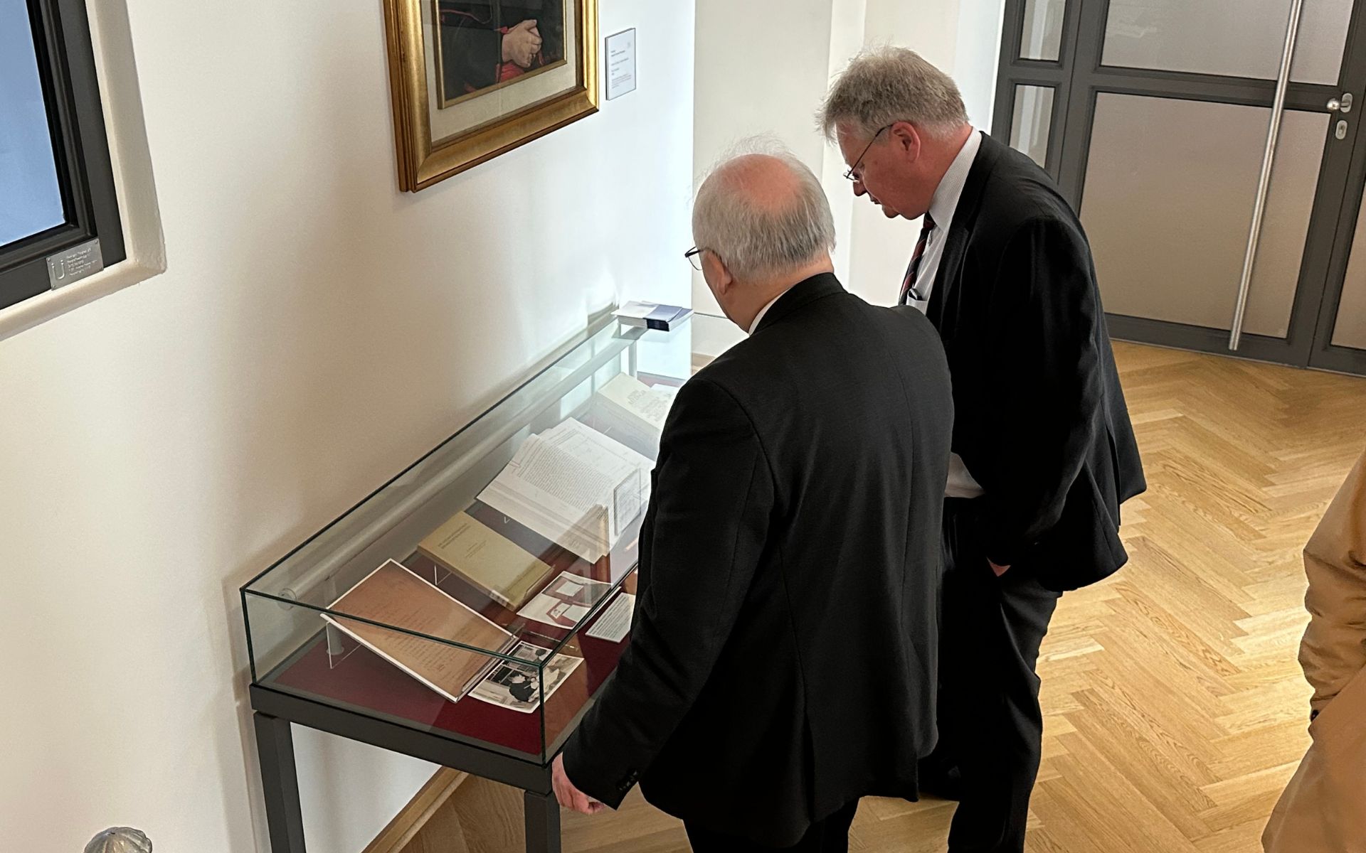 Nach dem Besuch in Pentling führte der Weg zurück in die Regensburger Altstadt zum „Institut Papst Benedikt XVI.“ am Bismarckplatz. Auch hier übernahm Bischof Rudolf die Führung und nutzte die Gelegenheit, dem Gast nicht nur die Räume, sondern auch die Entstehungsgeschichte dieser besonderen Forschungseinrichtung zu erläutern