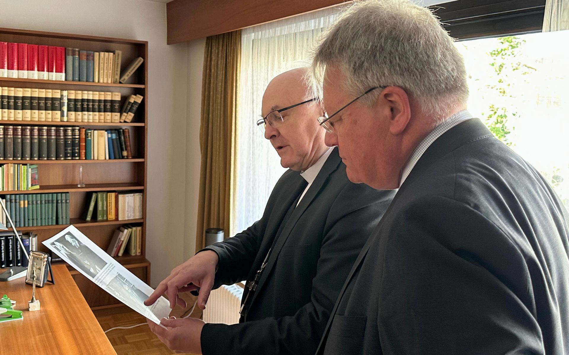 Von besonderem Interesse sind darüber hinaus zahlreiche studentische Mitschriften aus Ratzingers Vorlesungen, die seine Schüler akribisch aufgezeichnet haben, sodass es von manchen Vorlesungen sogar drei verschiedene Mitschriften gibt. Diese und Audio-Mitschnitte seiner Predigten werden heute im Archiv des Instituts aufbewahrt. Die zahlreichen Zeugnisse erlauben, so Bischof Voderholzer, einen ungewöhnlich unmittelbaren Blick auf seine Tätigkeit als Professor – auf jene Jahre also, in denen sich viele seiner Gedanken formten, die später in sein intellektuelles Werk Eingang fanden. Am Ende der Führung zeigte sich Botschafter Bruno Kahl sichtbar beeindruckt von der Arbeit des Instituts und der Sorgfalt, mit der hier das geistige Erbe Joseph Ratzingers bewahrt und erschlossen wird. „Sie haben hier einen großen Schatz“, sagte er.