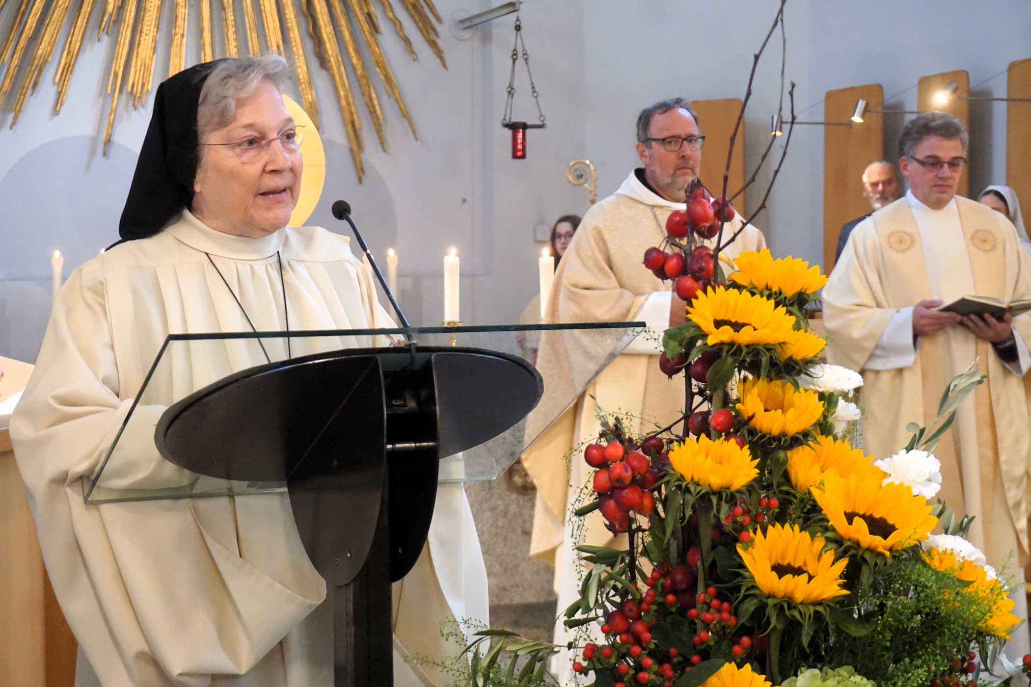 Die Fürbitten trugen Frauen und Mädchen aus dem Umfeld der Abtei vor. Sie hatten zu jeder ihrer Bitten passende Symbole dabei. Für Äbtissin Laetitia erbaten sie von Gott: „Erfülle sie mit Kraft und Freude im Leben und schenke ihr Kraft und Zuversicht für alles Kommende.“ Die Jubilarin selbst sagte: „Guter Gott, wir bringen Dir dieses kleine, junge Pflänzchen als Zeichen unserer Hoffnung und unseres Vertrauens auf Zukunft. Wir bitten Dich um Erhalt und stetige Erneuerung unseres Klosters und des wahren Ordensgeistes.“